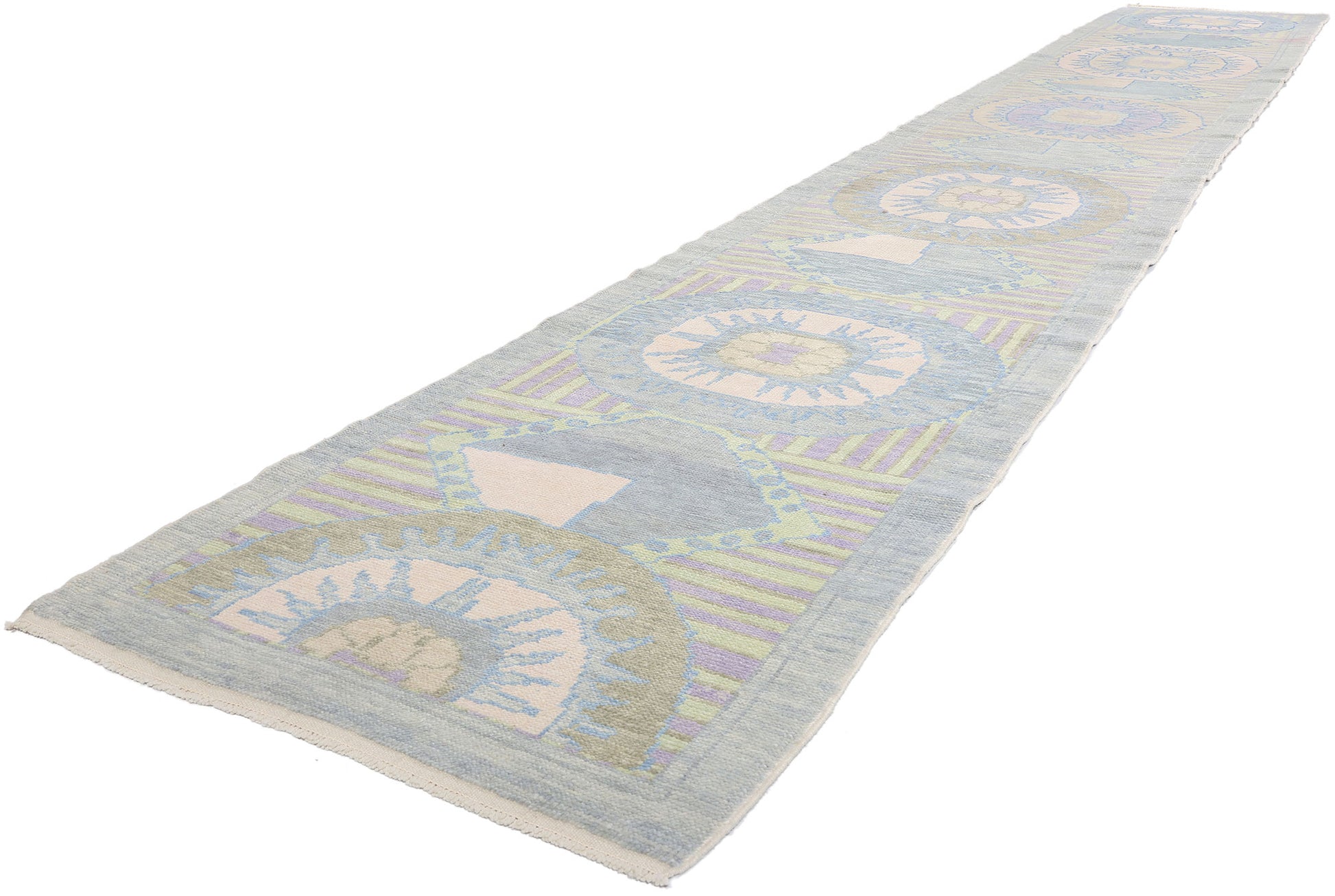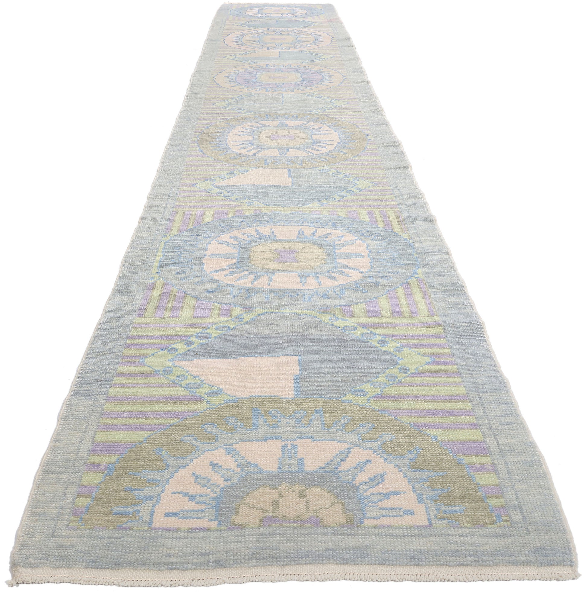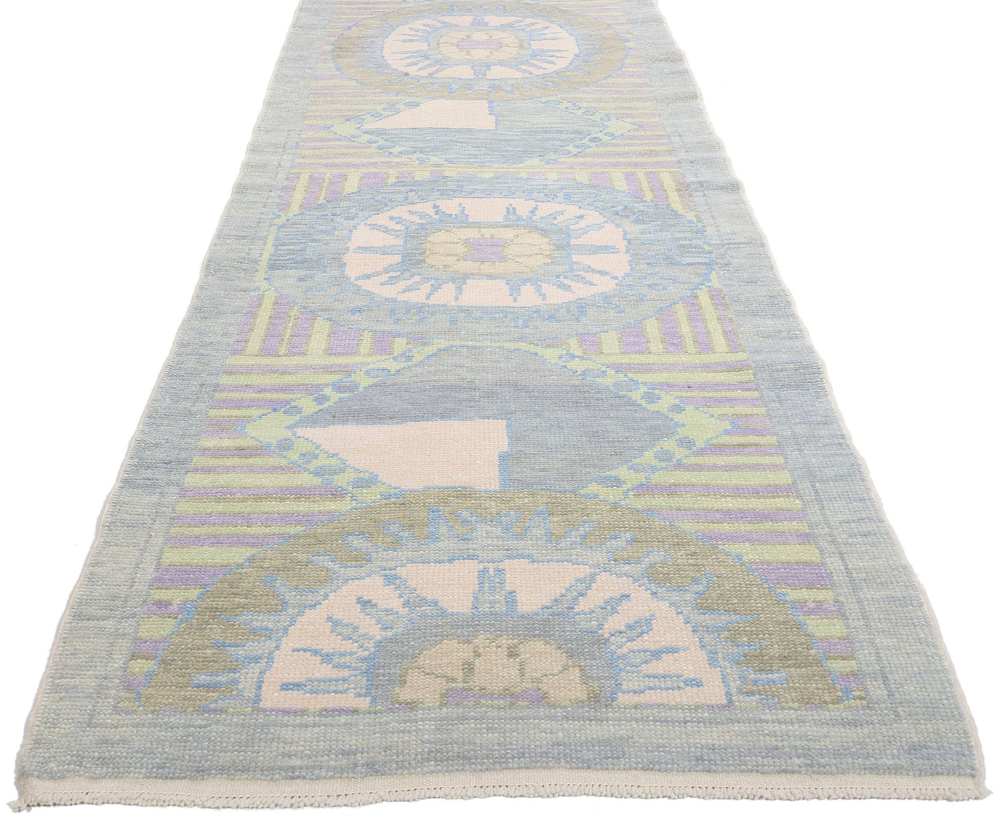 This hand-knotted wool modern Turkish Oushak rug runner radiates with a mesmerizing sunburst design, weaving together artistry and symbolism in a breathtaking display. Crafted by master artisans, its design centers on a sequence of celestial medallions that resemble radiant suns, glowing with energy and balance. These medallions, rendered in soft pastel hues of blue, lavender, pink and light green, create a harmonious rhythm along the Oushak runner, inviting the eye to follow its story of cosmic wonder. The intricate craftsmanship showcases the enduring tradition of Oushak rug-making, while its contemporary color palette reflects a modern reinterpretation.
