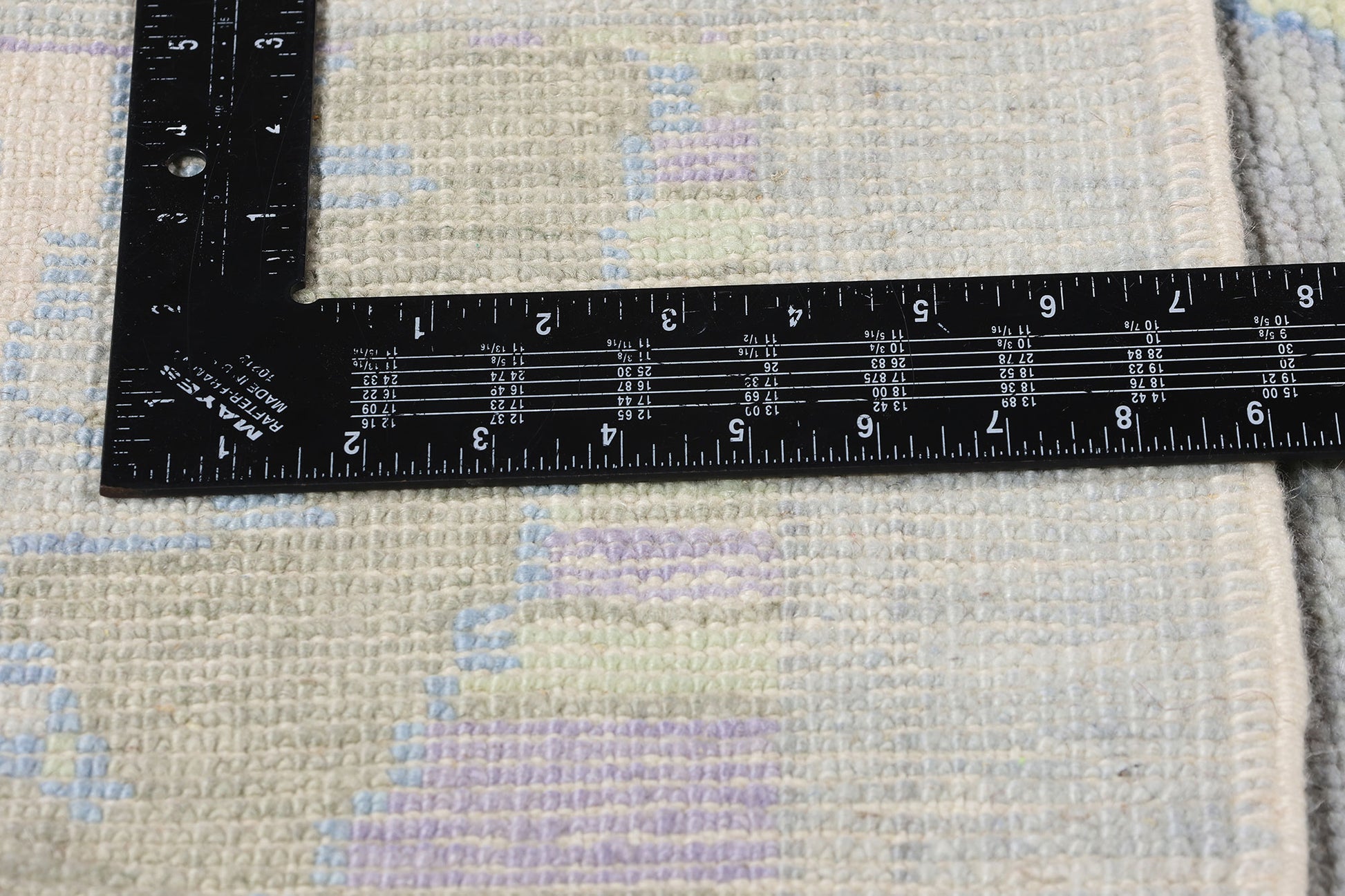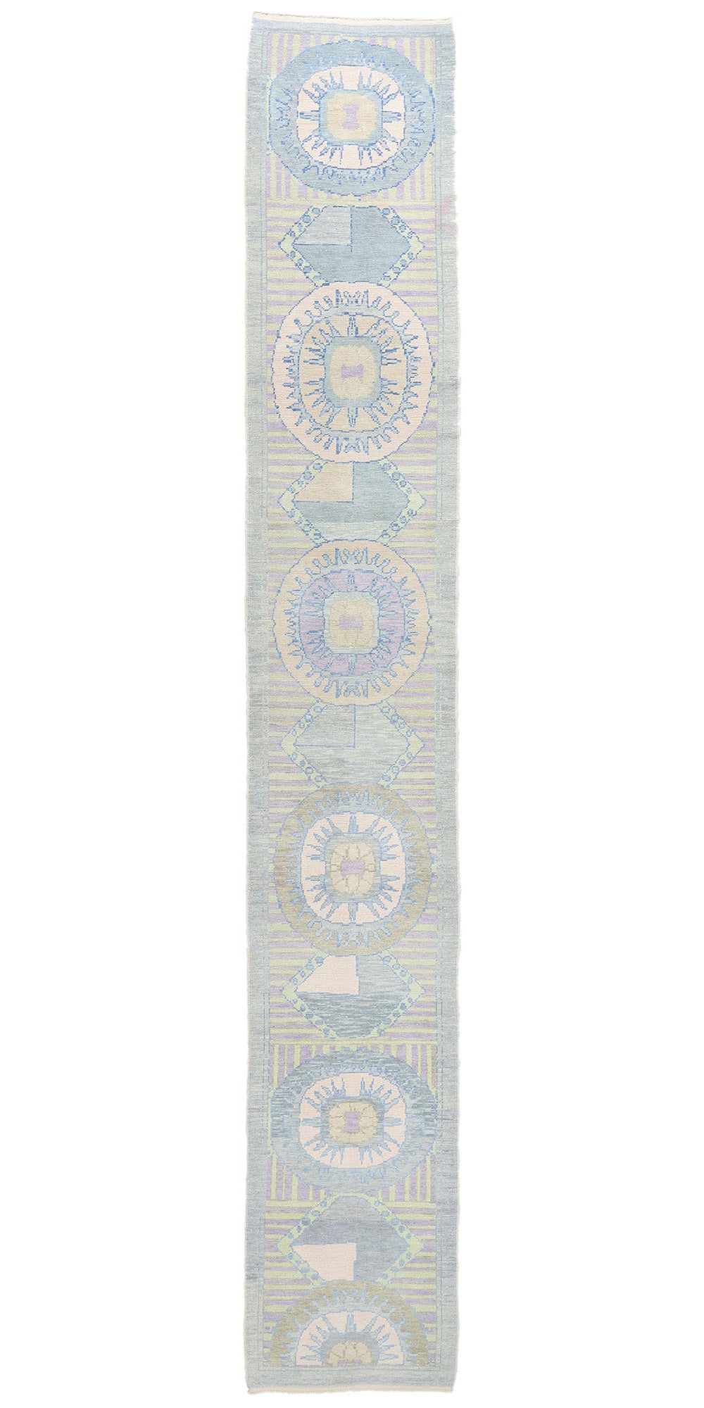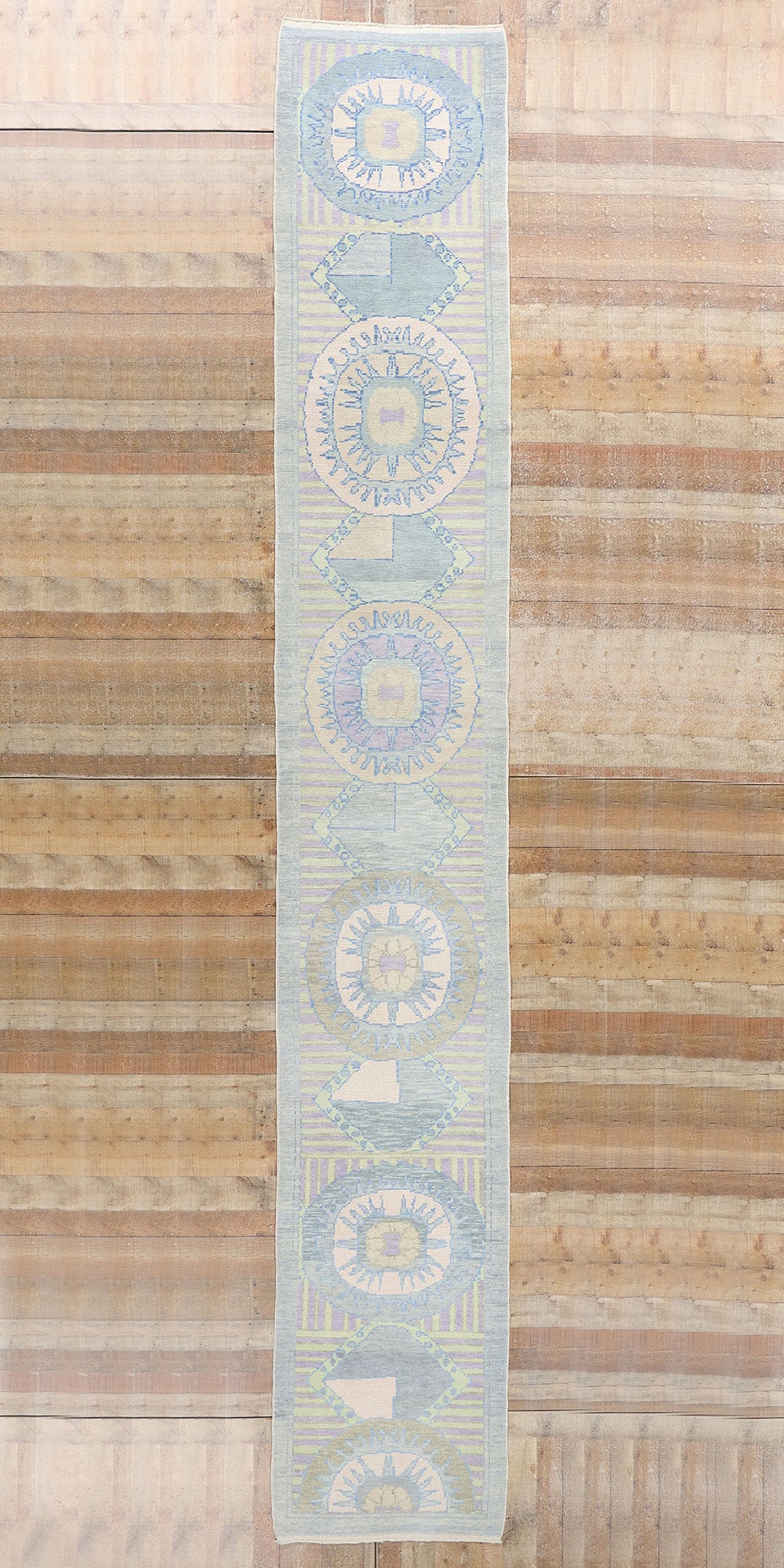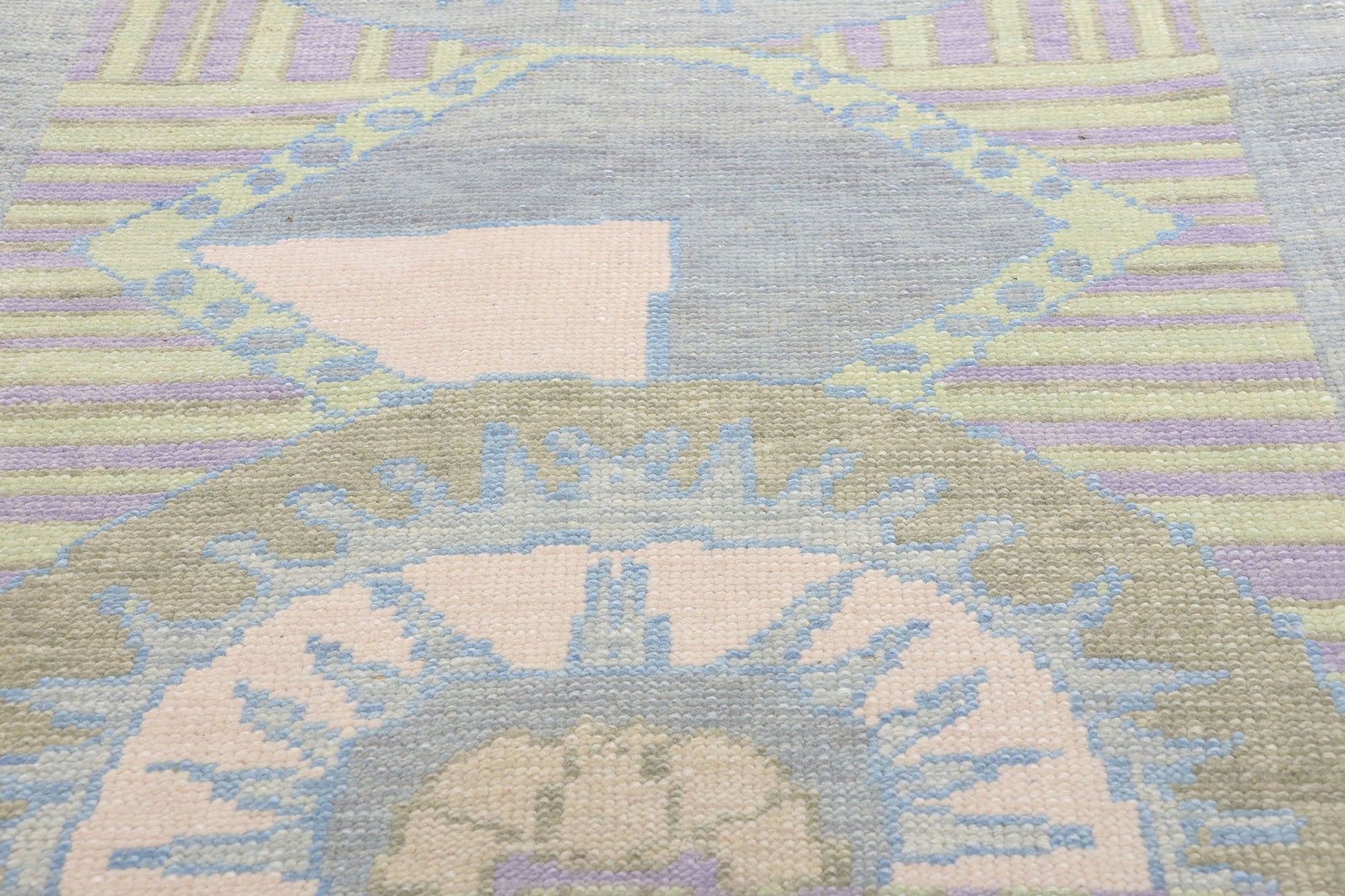 This hand-knotted wool modern Turkish Oushak rug runner radiates with a mesmerizing sunburst design, weaving together artistry and symbolism in a breathtaking display. Crafted by master artisans, its design centers on a sequence of celestial medallions that resemble radiant suns, glowing with energy and balance. These medallions, rendered in soft pastel hues of blue, lavender, pink and light green, create a harmonious rhythm along the Oushak runner, inviting the eye to follow its story of cosmic wonder. The intricate craftsmanship showcases the enduring tradition of Oushak rug-making, while its contemporary color palette reflects a modern reinterpretation.