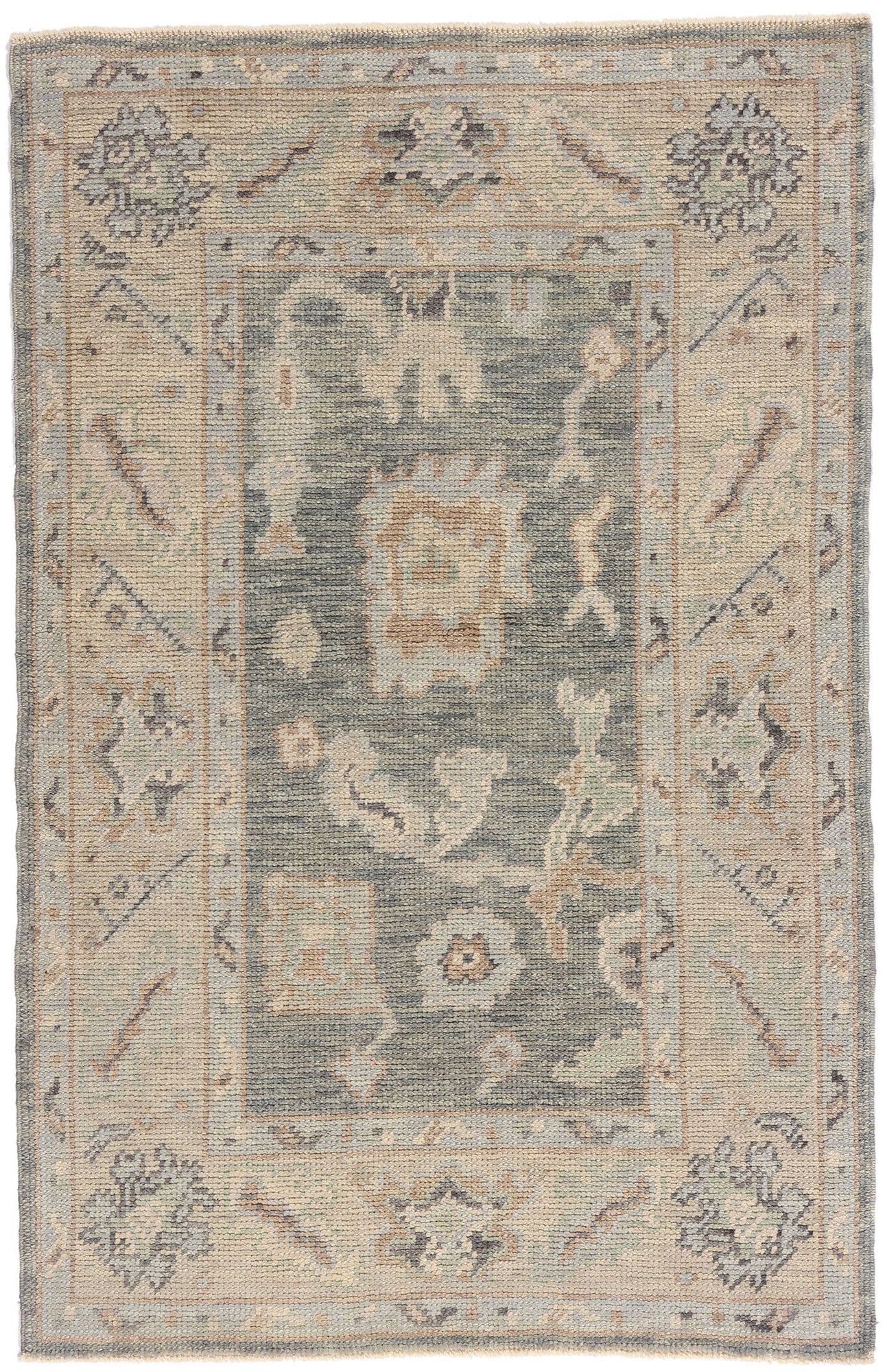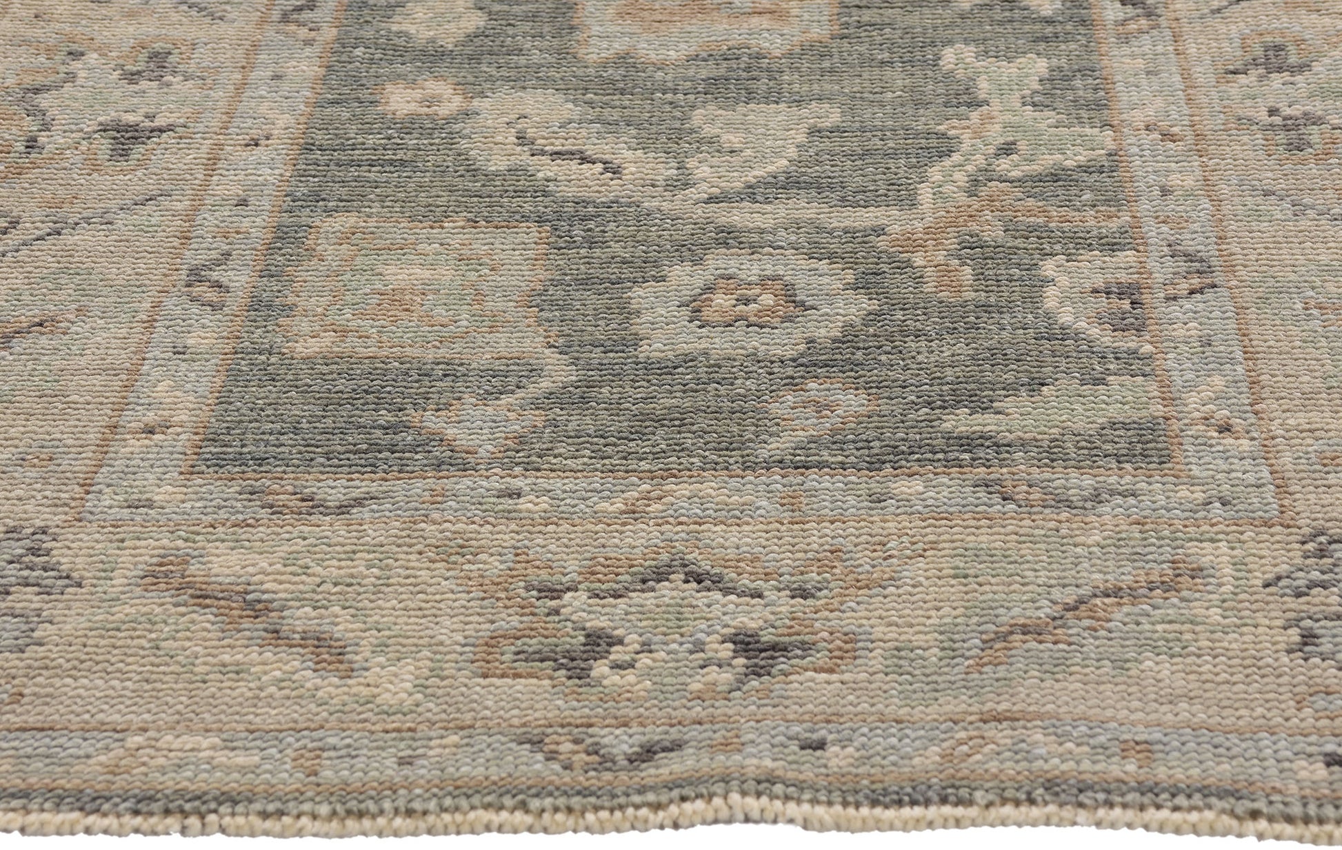 The allover botanical pattern, articulated in abstracted palmettes, meandering vines, and stylized blossoms, reflects a design legacy that stretches back centuries. Each motif carries symbolic resonance—protection, fertility, and endurance—woven into the very fabric of the rug by artisans who preserved the Oushak heritage while translating it into a softer, modern sensibility. Framed by a dignified border of geometric florals and angular vines, the composition creates a rhythm of balance and poise, embodying both history and innovation.