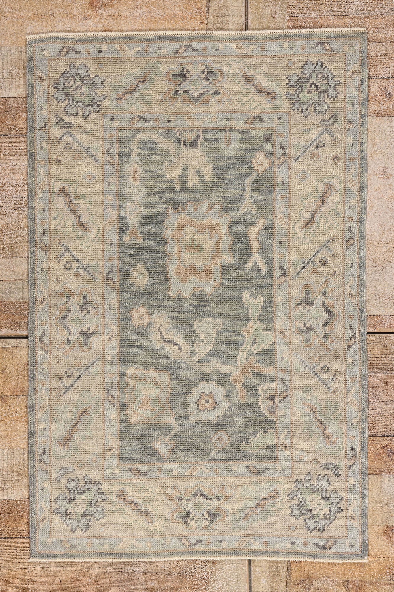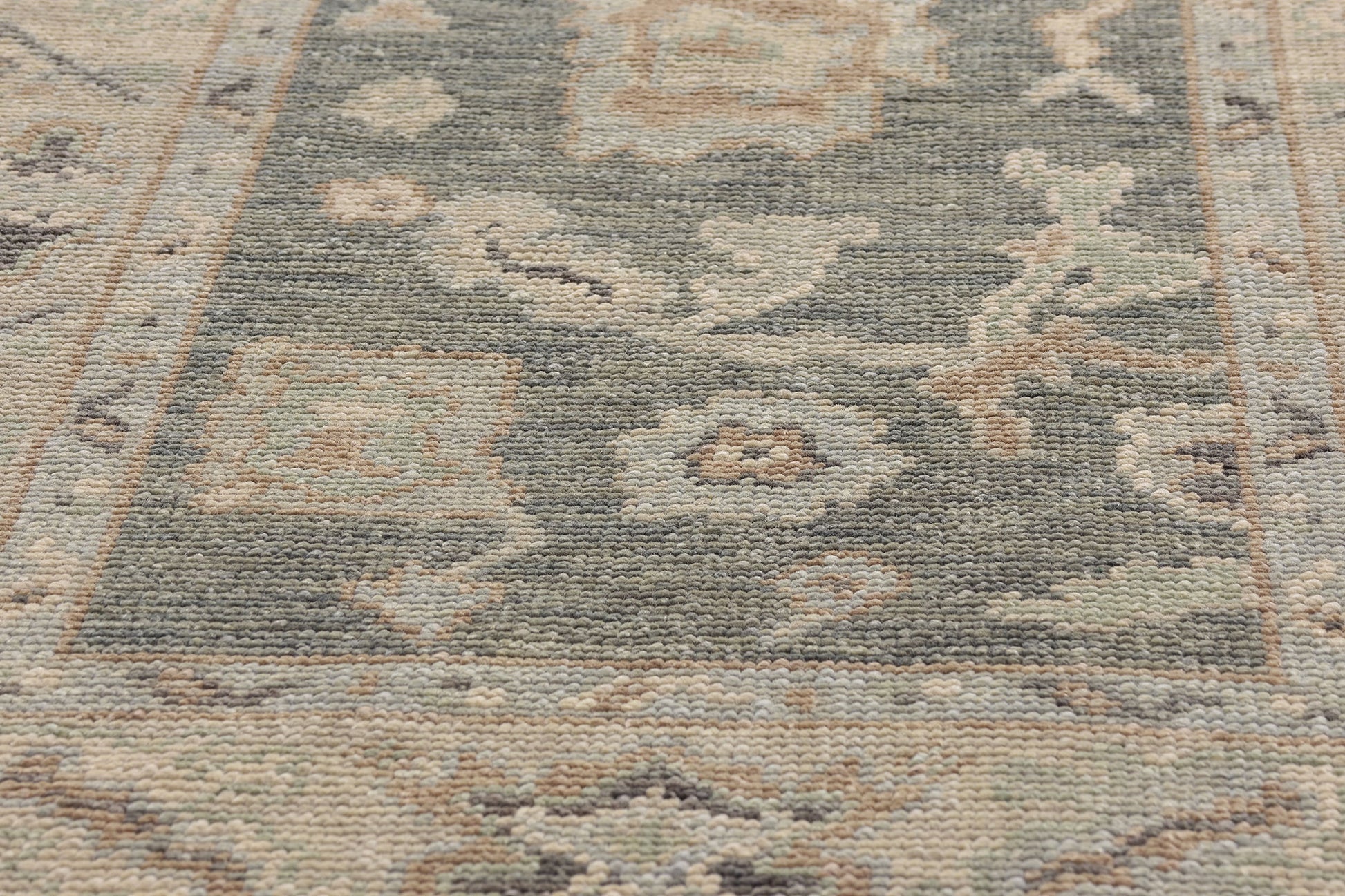 A field of gentle misted greys and silvery sage unfolds like a tranquil landscape at dawn, its abrashed surface imbued with depth and soul. Scattered across the composition are stylized palmettes, rosettes, and abstract botanical motifs—timeless Oushak symbols that speak of fertility, harmony, and divine protection. These floating ornaments, rendered in muted taupe, ivory, and pale jade, create a dreamlike rhythm that is both ancient in meaning and strikingly modern in interpretation. The border, composed of geometric rosettes and angular vine scrolls, provides a frame of quiet refinement, echoing the eternal balance between strength and beauty.