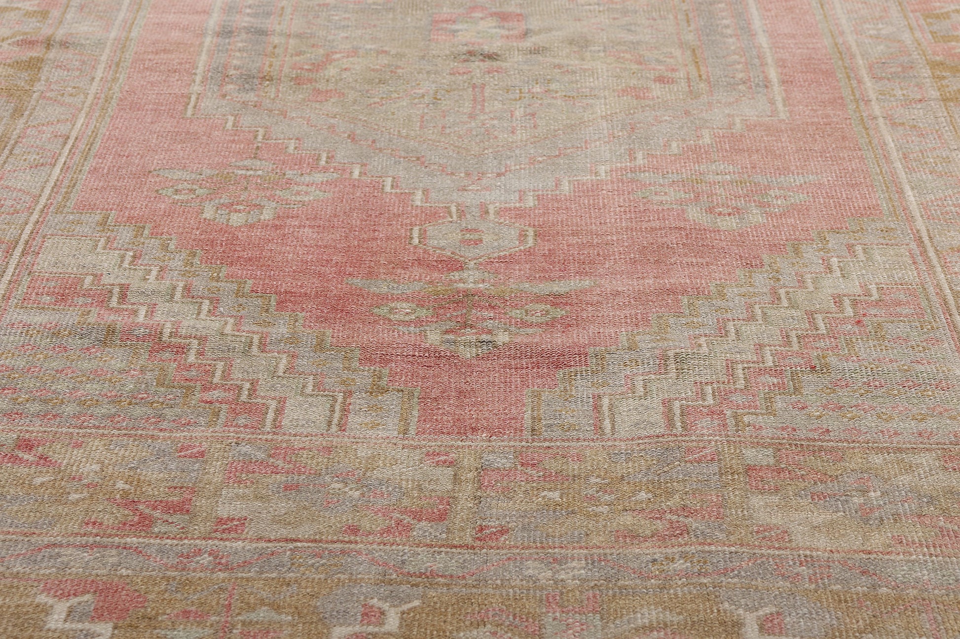 The composition is encircled with a tribal motif main border rendered on a warm brown ground, resonant with earthbound energy and rooted tradition. This border is flanked on both sides by delicate carnation meander guard bands, traced in lavender-gray tones that echo the spandrels. The carnation—long a symbol of admiration and enduring love in Turkish folk art—winds its way along the edges, a protective flourish wrapping the rug in quiet reverence. Altogether, this Oushak carpet is more than textile—it is a tactile prayer, a poetic manuscript of woven memory, and a testament to the enduring elegance of Anatolian tradition.