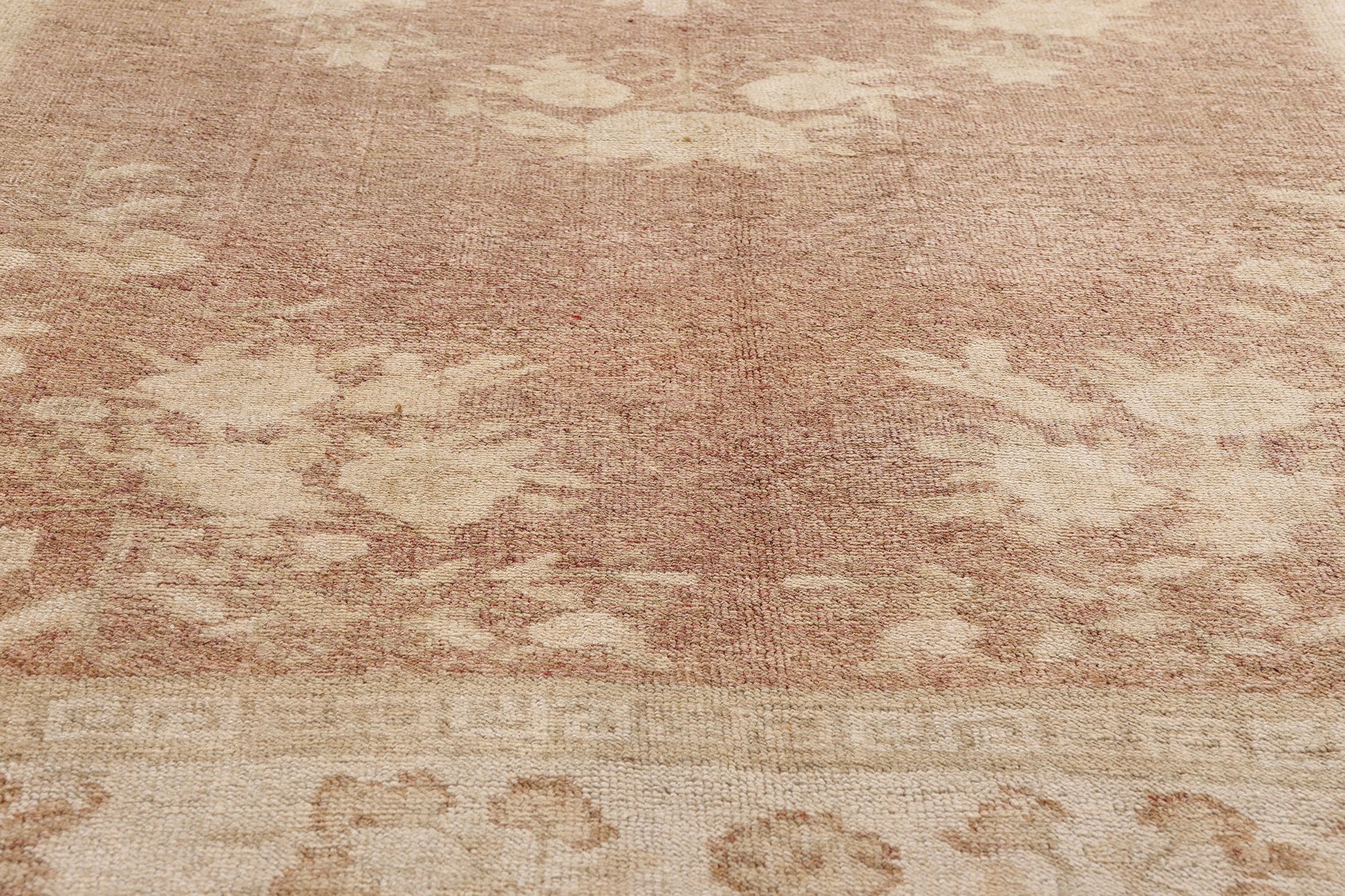 Framing this timeless tableau is a refined botanical border, rhythmically adorned with stylized blossoms and vine scrolls. This outer frame is elegantly enclosed by an inner Greek meander guard band, a classical motif associated with continuity, eternity, and the eternal flow of life. The border’s symmetry and restraint enhance the rug’s overall composition, balancing the richness of the floral interior with a dignified architectural grace. The antique wash softens every edge, rendering the whole piece a study in subtle sophistication and vintage nobility.