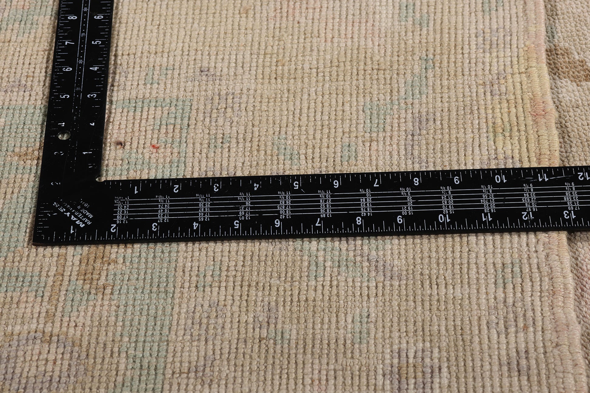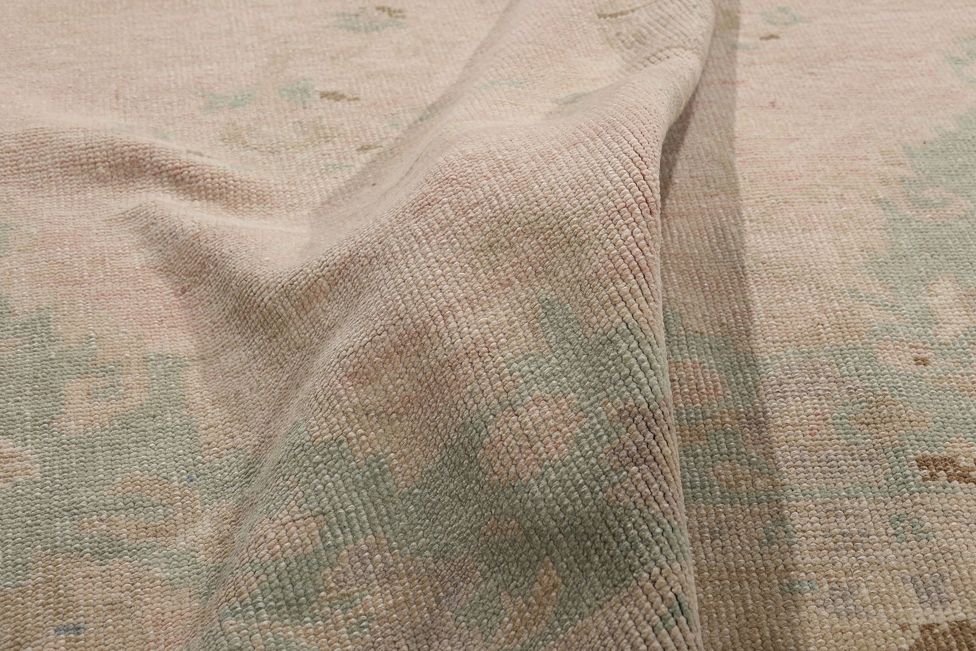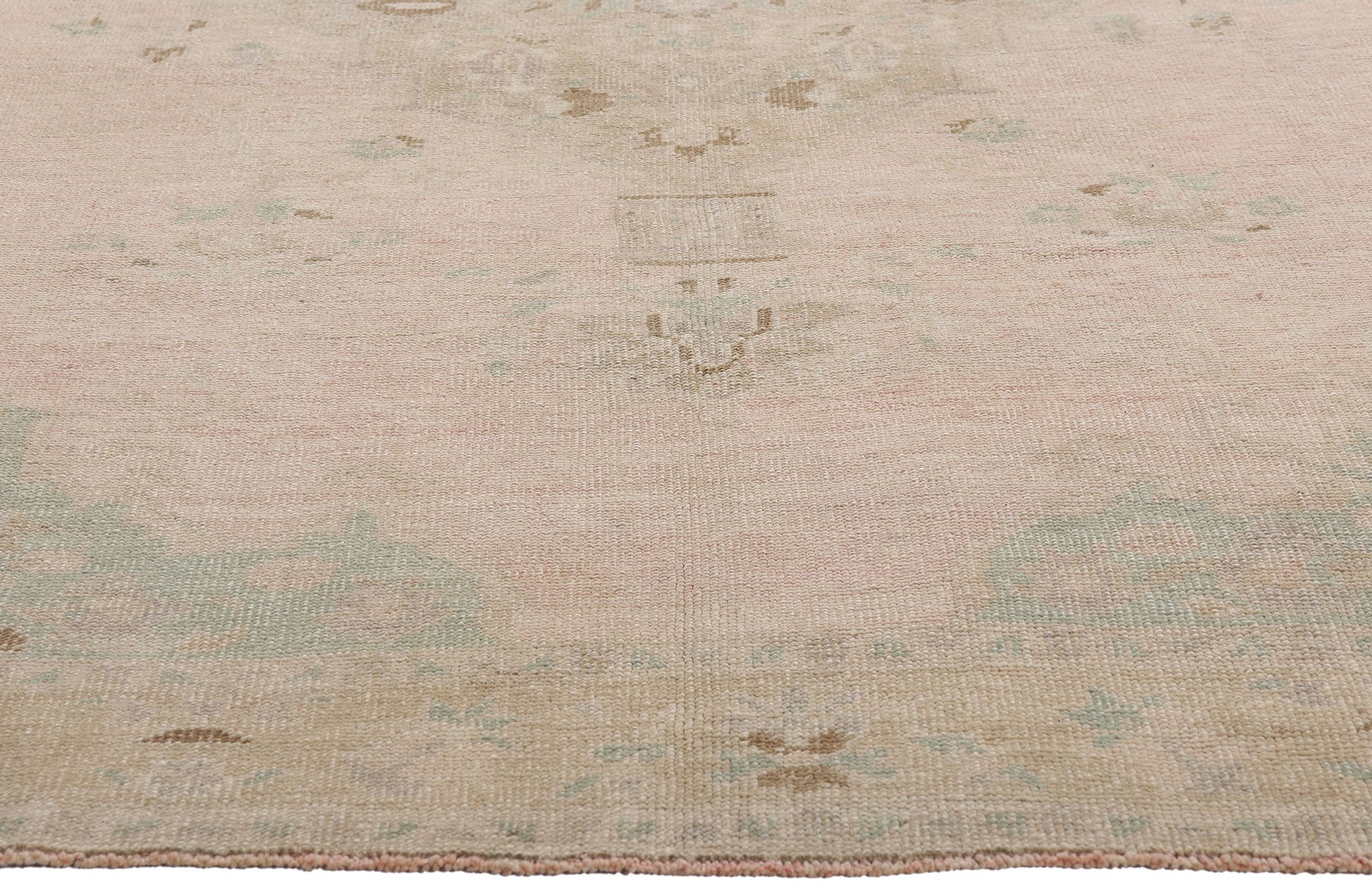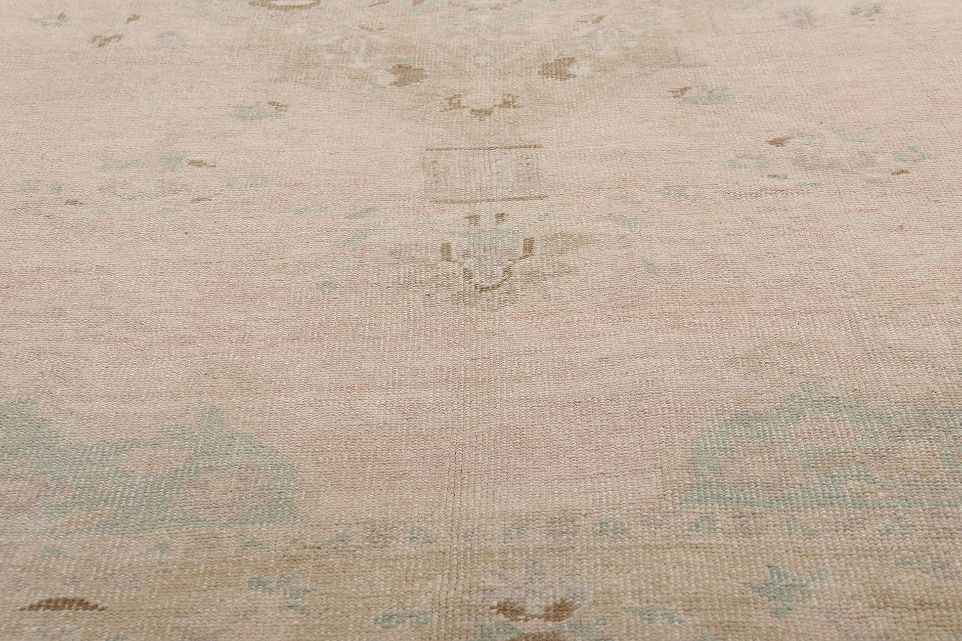 The pastel Oushak rug’s tranquil tan border encircles the composition with an air of reverence. Upon it meander a host of flora and foliage—stylized yet graceful—woven with botanical intention. Each bloom, each tendril bends gently along the line, forming a garland of peace. This is framed by a pair of delicate beige guard bands, inner and outer, like twin threads of subtle protection holding the world within. Altogether, this Oushak is a woven whisper of Anatolia’s botanical soul, where softness reigns and elegance is born not from opulence, but from restraint, spirit, and the poetry of presence.