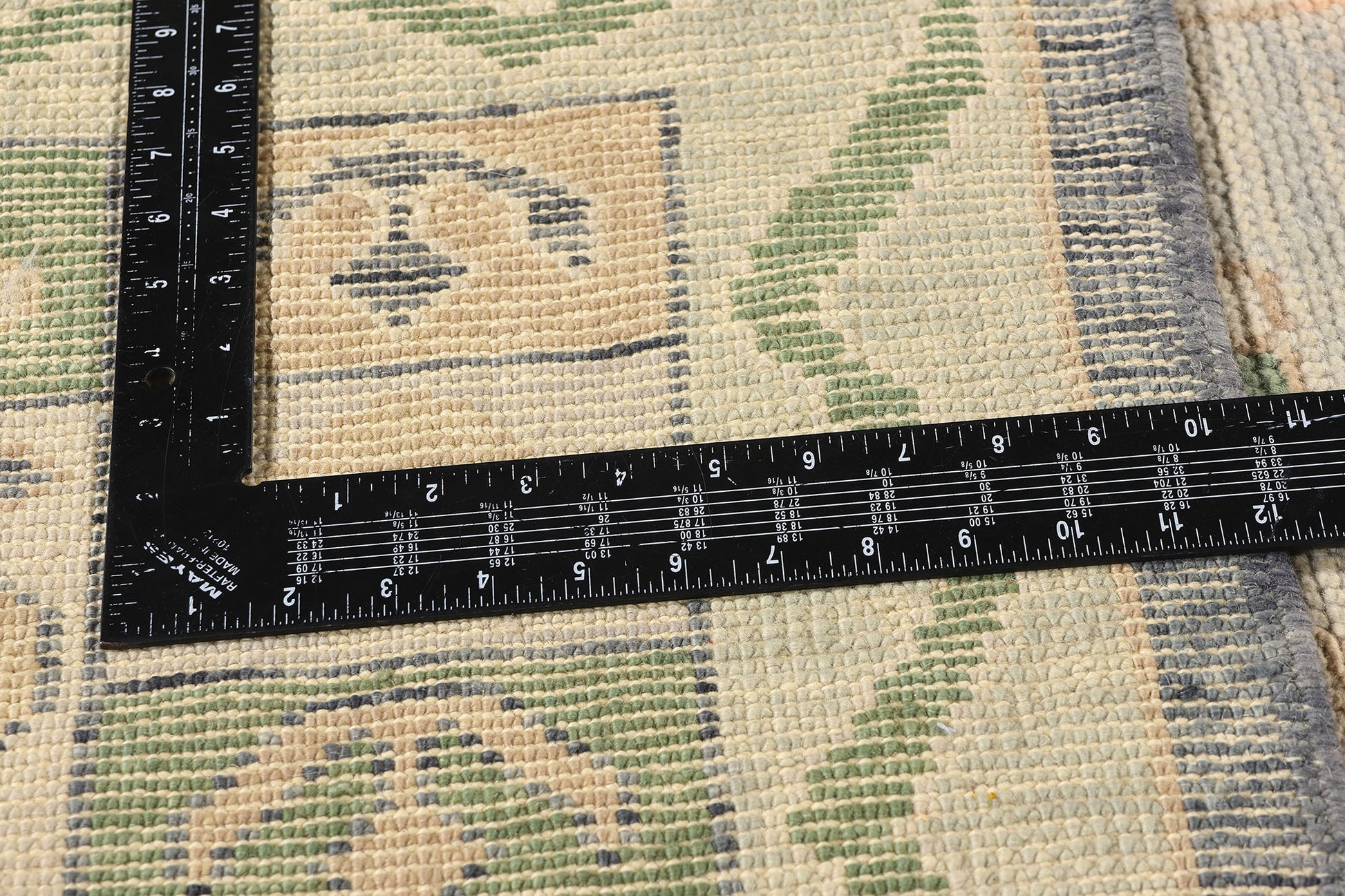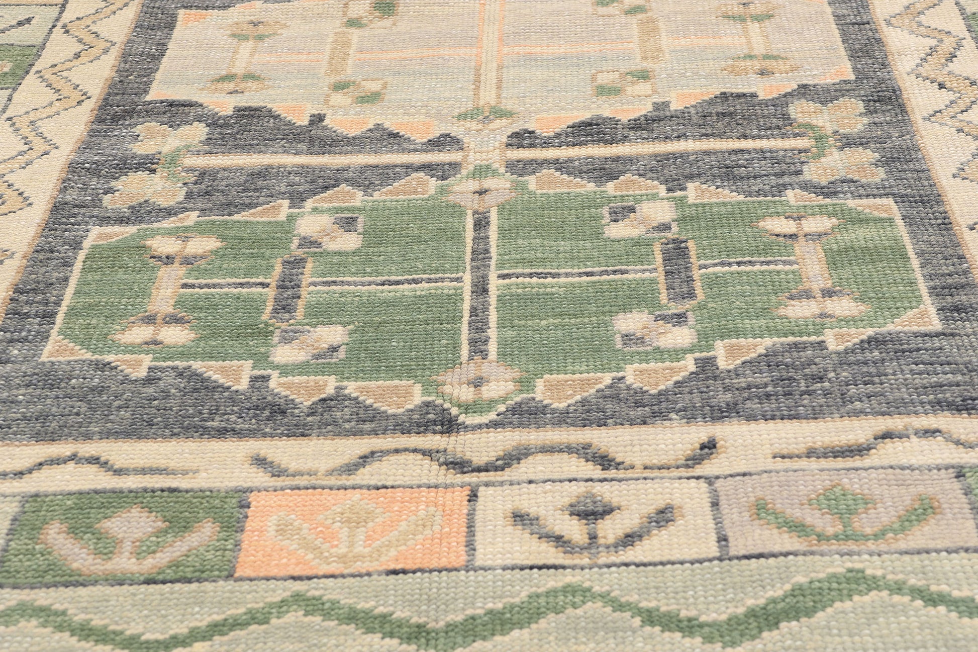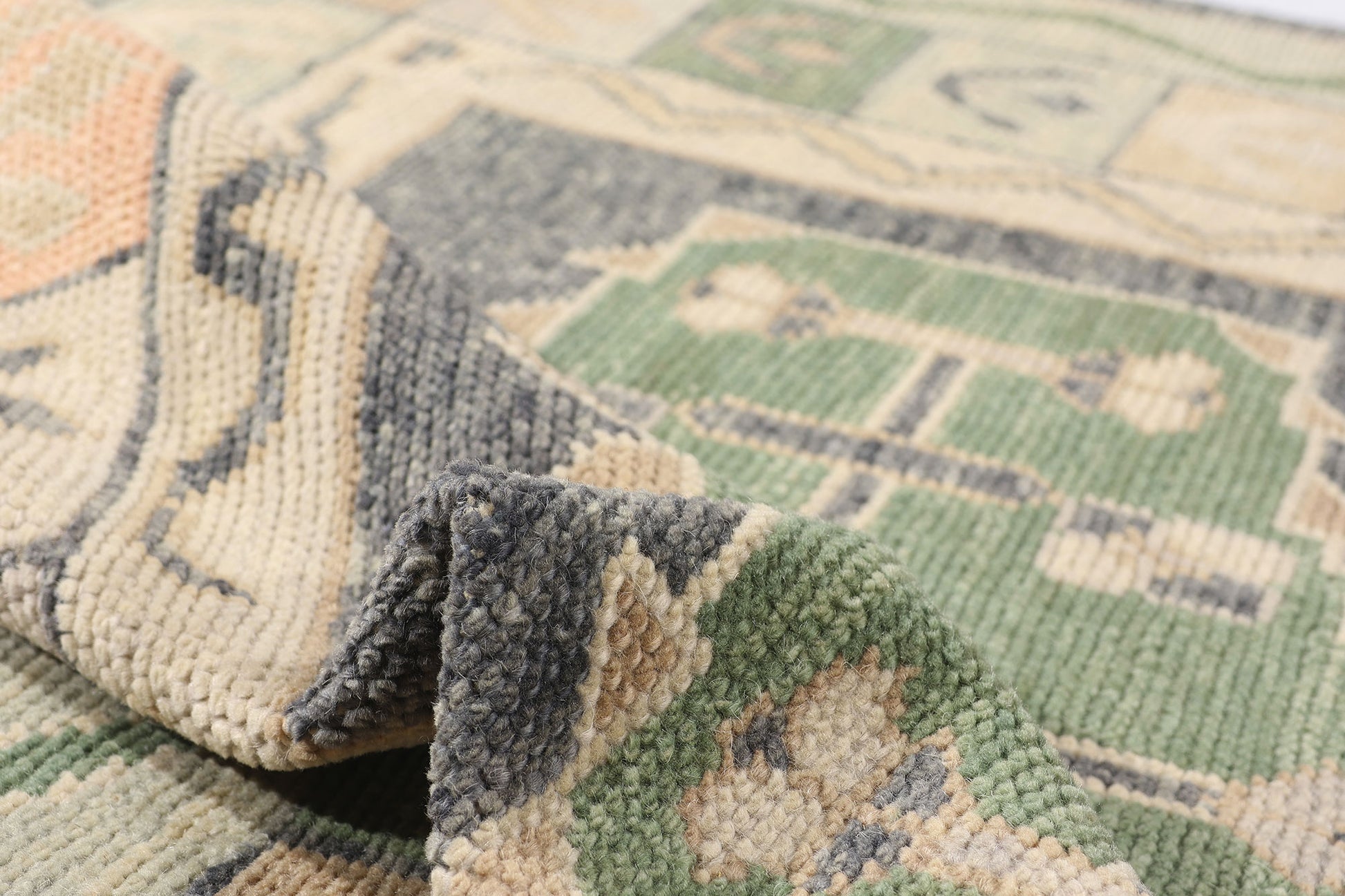 As if woven from the quiet breath of forest glades and shaded glens, this hand-knotted wool modern Turkish Oushak rug unveils a serene harmony of earthy hues and elemental forms. The field is graced with a gentle interplay of avocado green, light peach, beige, and slate gray, arranged in a lyrical composition of rectilinear floral medallions and stylized blossoms. Each motif feels like a memory of a garden whispered into being by ancestral hands—an echo of nature captured in woolen verse.
