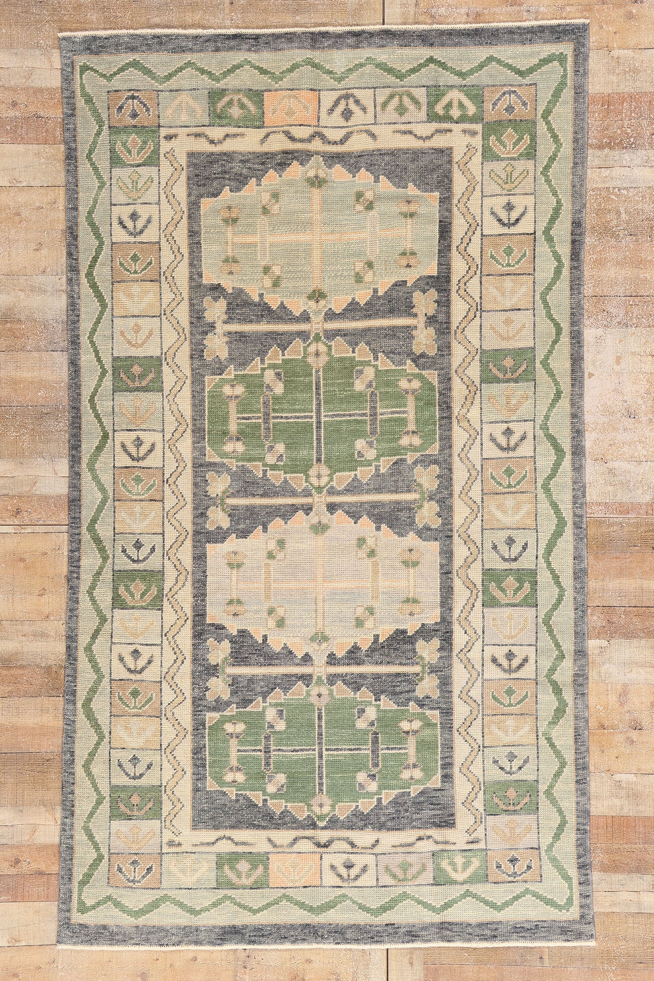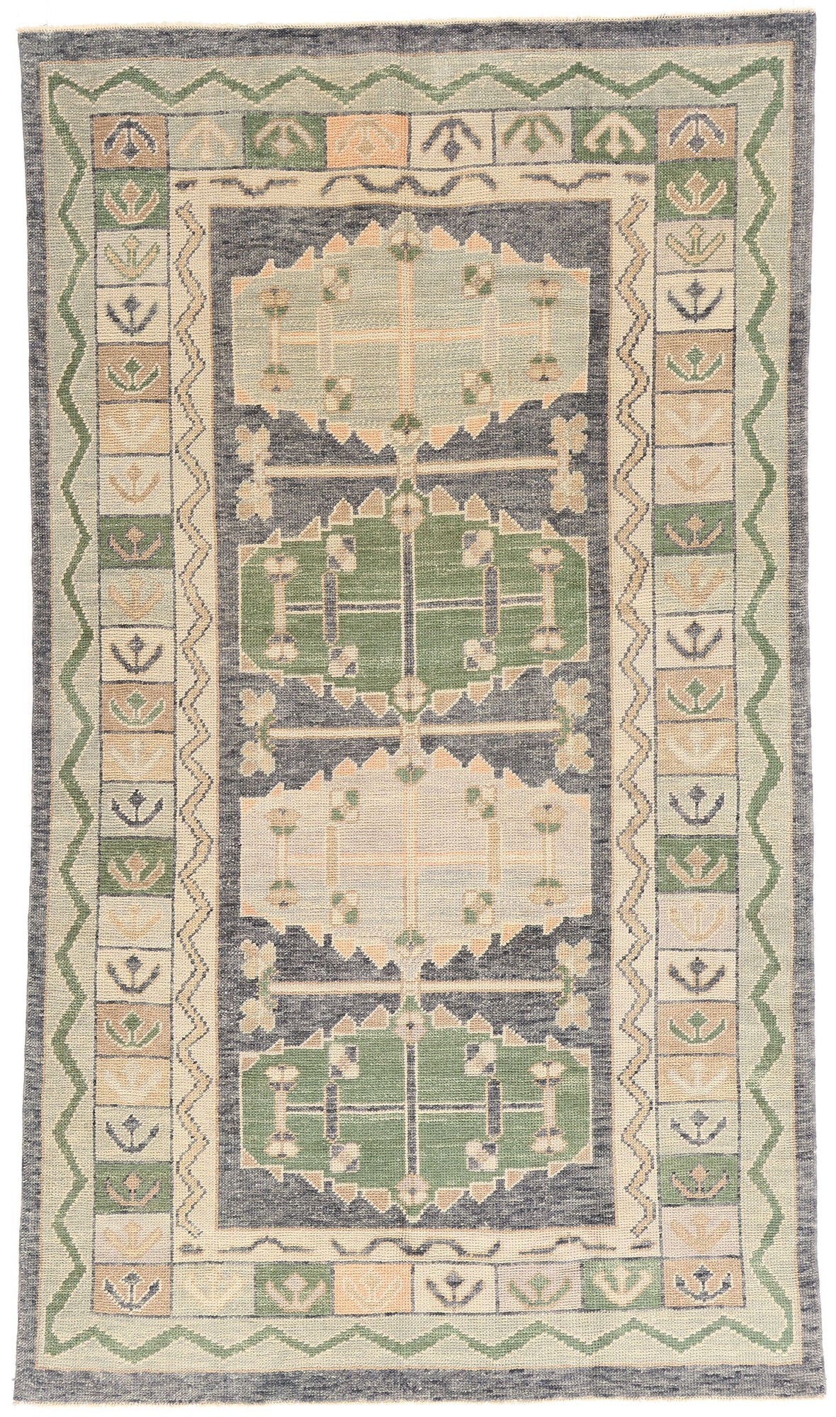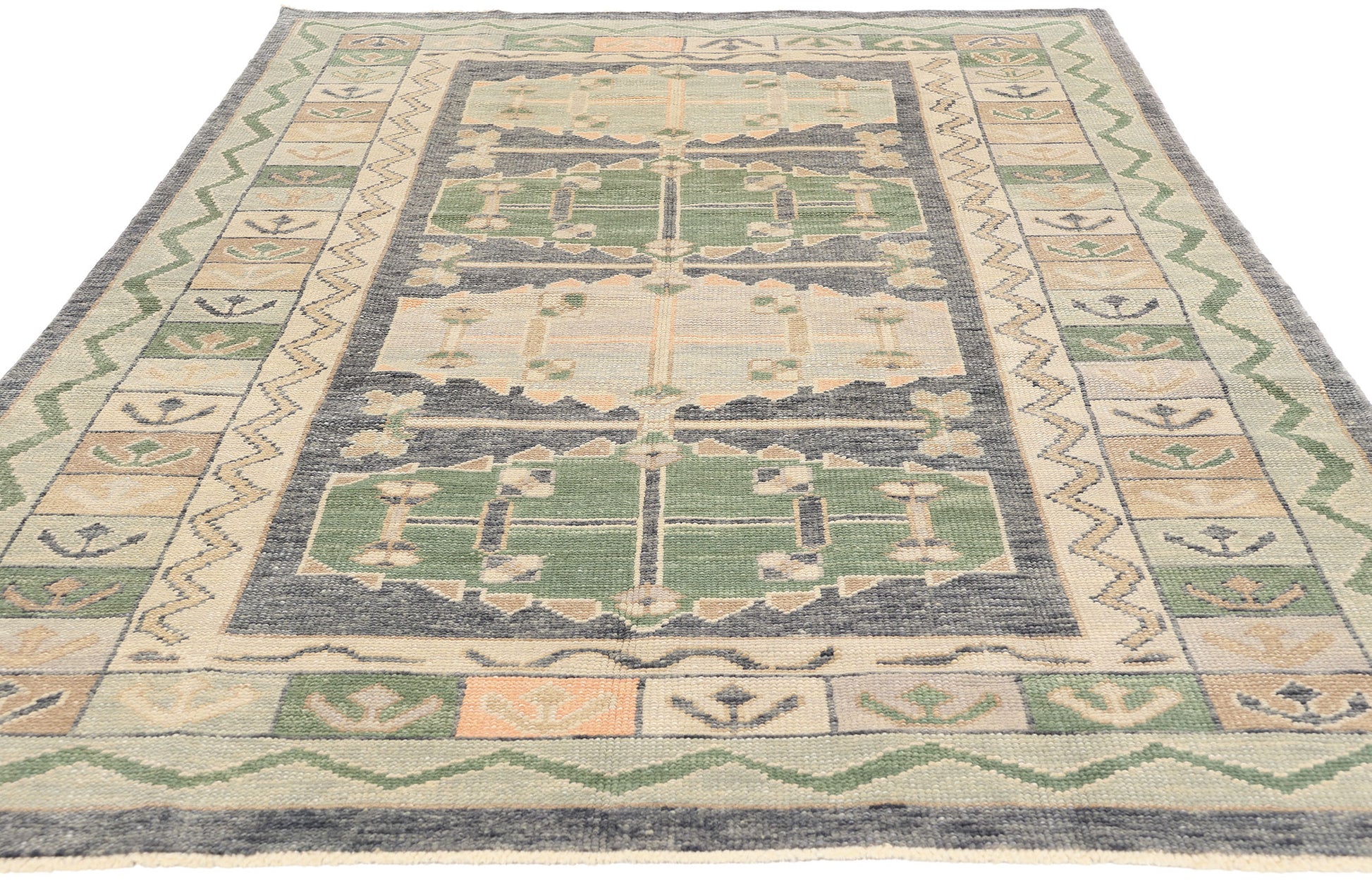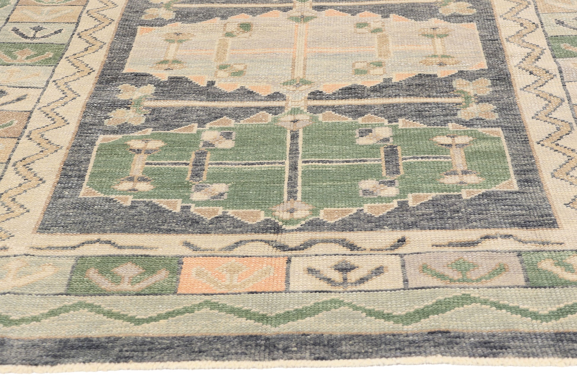 As if woven from the quiet breath of forest glades and shaded glens, this hand-knotted wool modern Turkish Oushak rug unveils a serene harmony of earthy hues and elemental forms. The field is graced with a gentle interplay of avocado green, light peach, beige, and slate gray, arranged in a lyrical composition of rectilinear floral medallions and stylized blossoms. Each motif feels like a memory of a garden whispered into being by ancestral hands—an echo of nature captured in woolen verse.