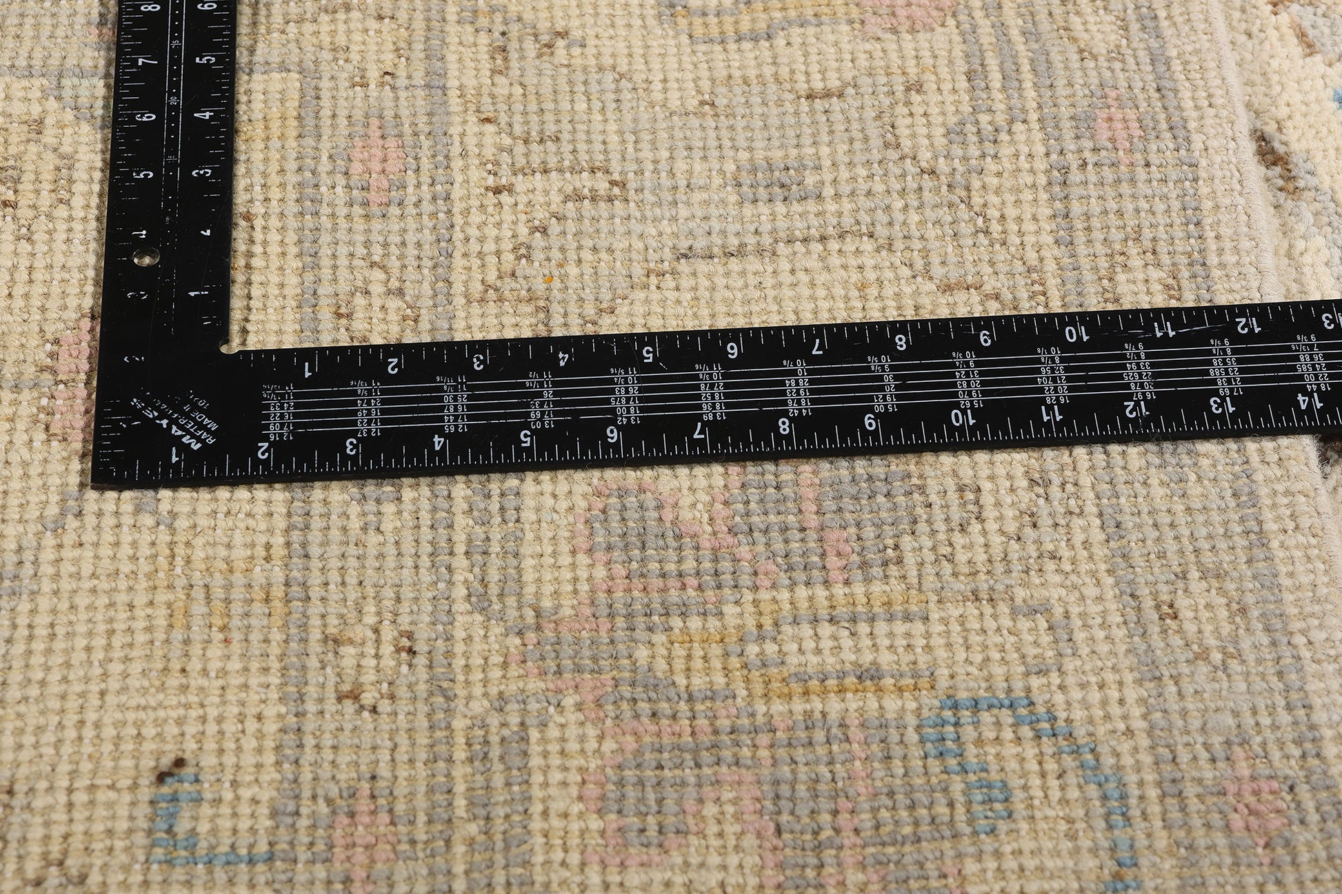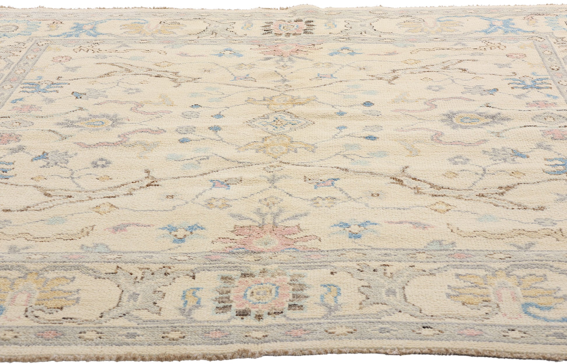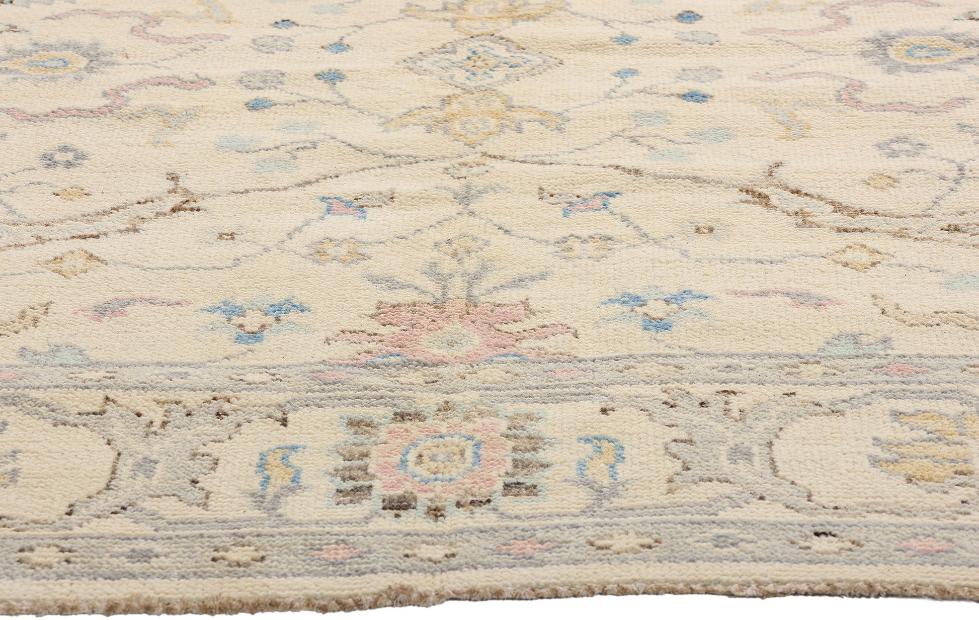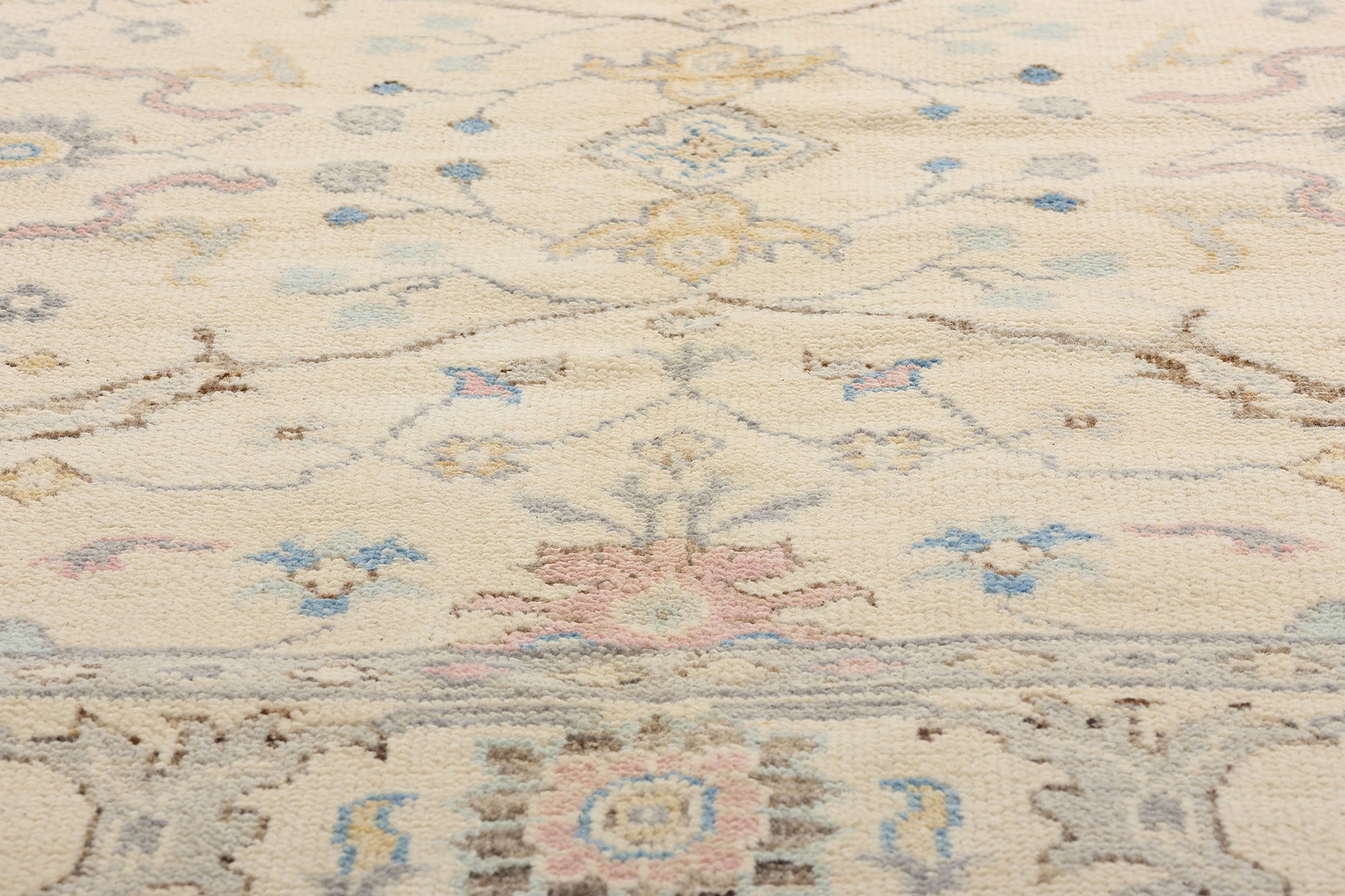 Bathed in a luminous ivory glow, this hand-knotted wool Oushak rug is a delicate tableau of grace and heritage, handcrafted in India with reverence for Anatolian tradition and a distinctly modern sensibility. Its softly shimmering palette—light pink, sky blue, buttercream, and whispering lilac—imbues the piece with a refined pastel elegance, as if light itself had been woven into its fibers. Each color exhibits gentle abrash, creating an ethereal atmosphere that feels both nostalgic and timeless.