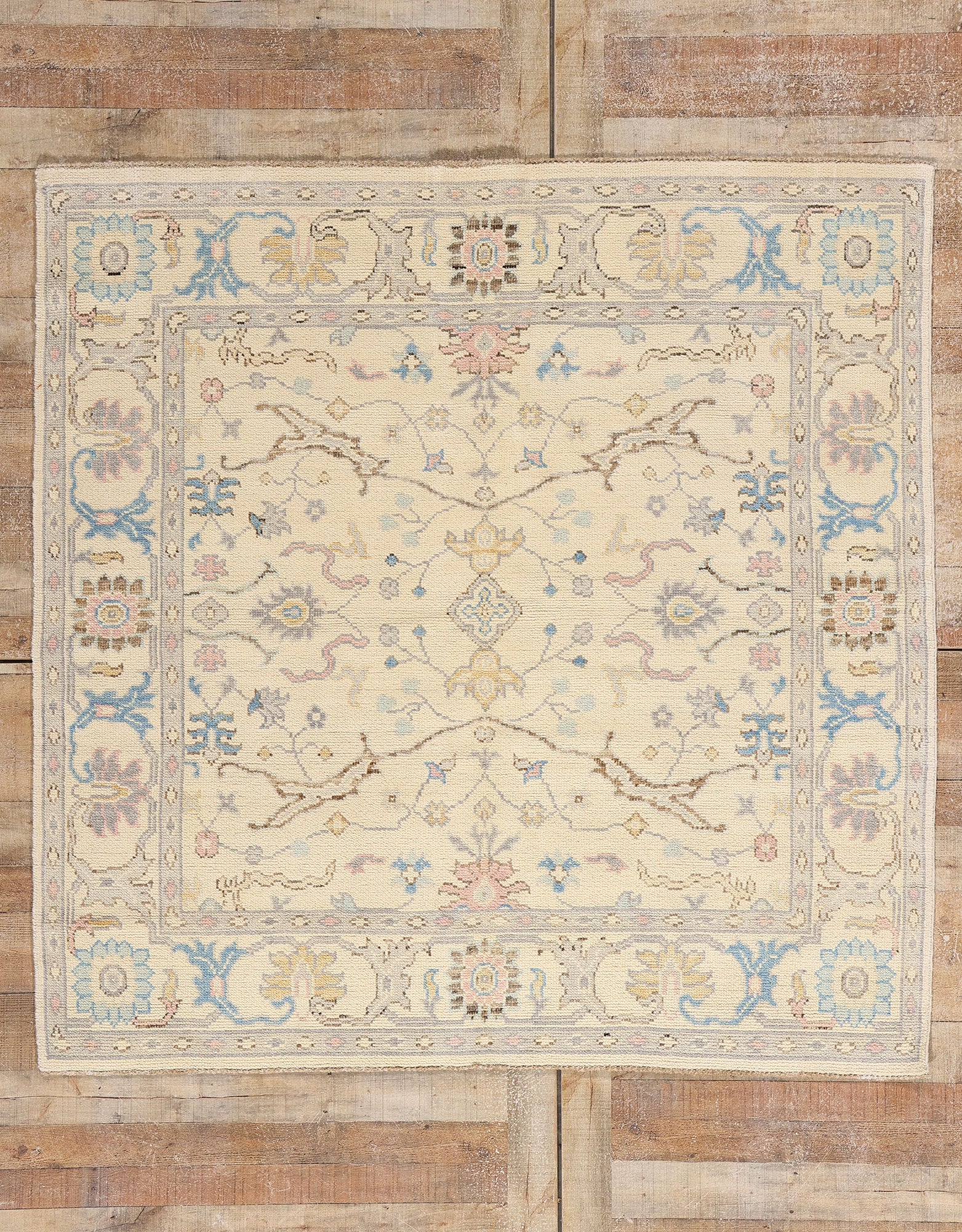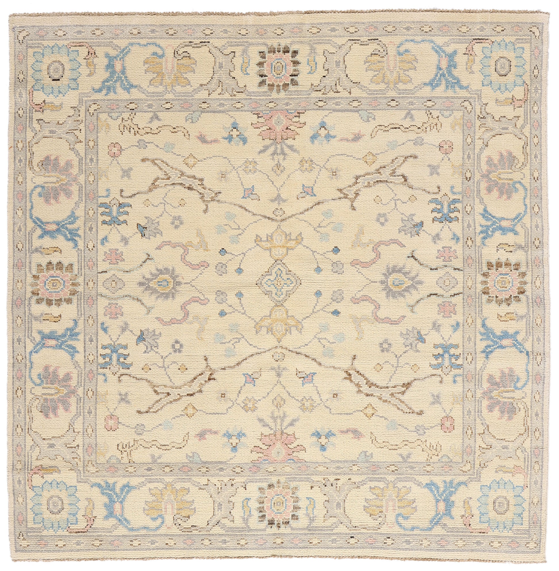 The composition centers around an elegant quatrefoil cartouche dotted with a delicate cross motif surrounded by blooming palmettes, angular florals, and arabesque vinery that dance like blossoms in the wind. These motifs, gently mirrored and artfully spaced, evoke the harmony of classical Oushak design while breathing fresh life into every knot. Curling tendrils and meandering vines drift across the field with a painter’s delicacy, grounding the design in nature’s eternal rhythms—a nod to Biophilic inspiration and the timeless symbolism of rebirth, beauty, and protection.