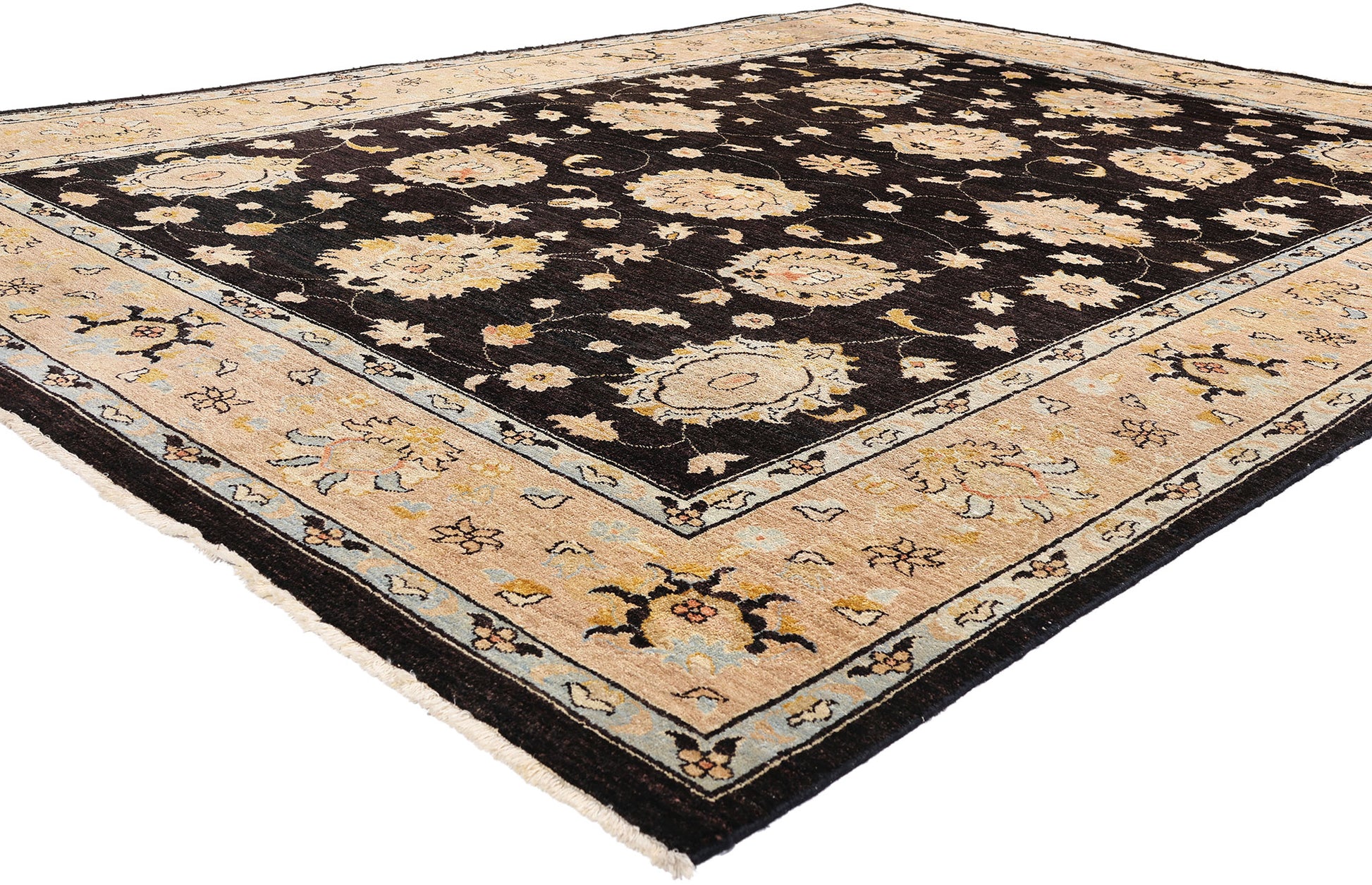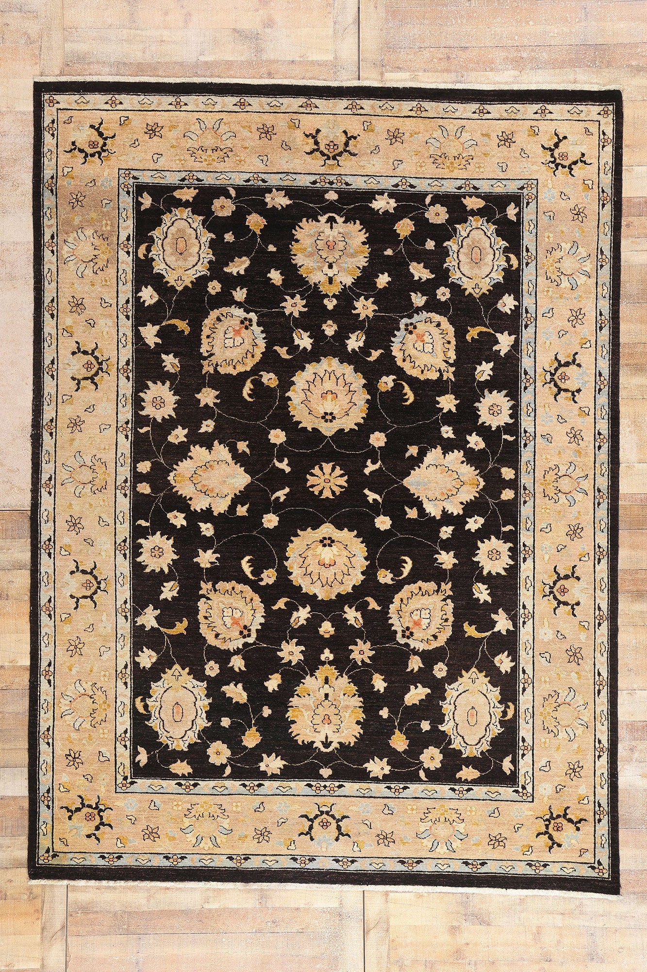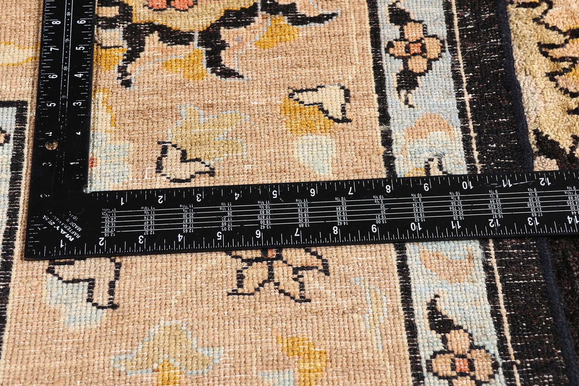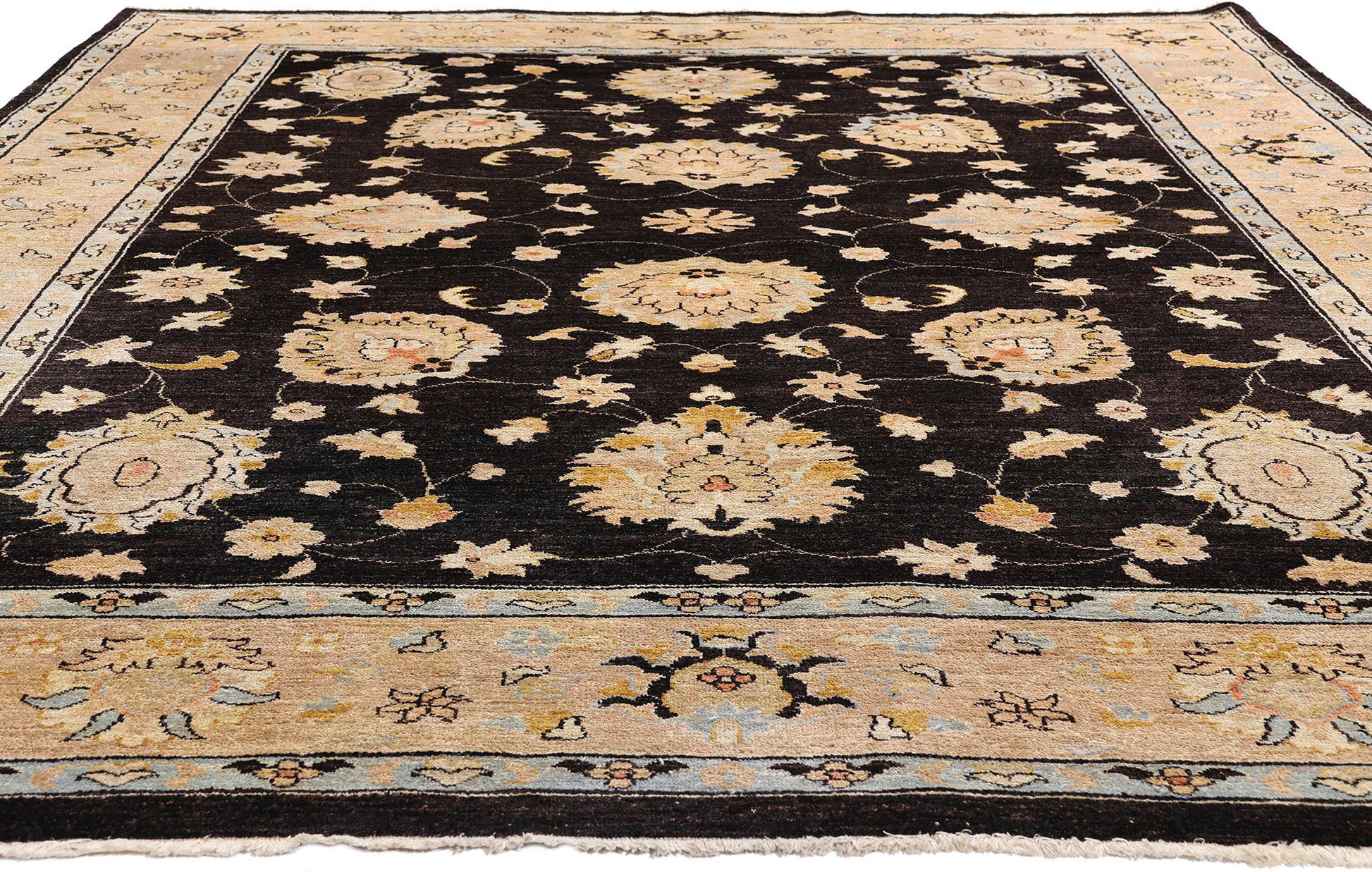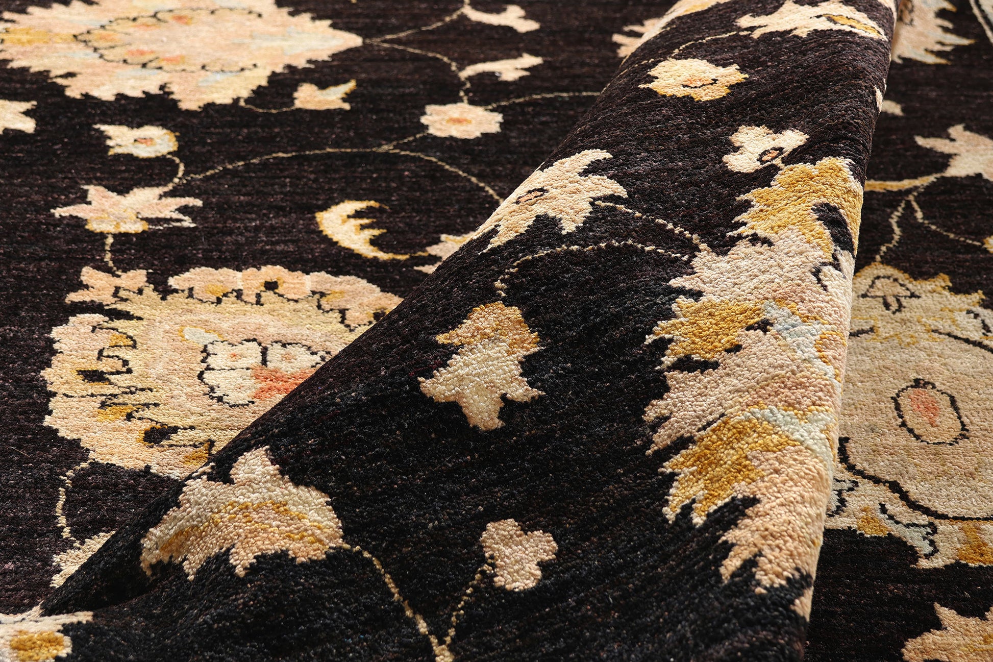 Commanding attention with its deep, obsidian field, this hand-knotted wool vintage black Oushak rug from Pakistan radiates an aura of restrained opulence and cultivated taste. Each meticulously rendered motif unfurls like a whispered secret from an ancient weaving tradition, its soft golds and muted ivory blooms seemingly glowing against the midnight backdrop. This interplay of light and shadow evokes the grandeur of Ottoman courts, where Oushak rugs were revered as emblems of refinement and status.