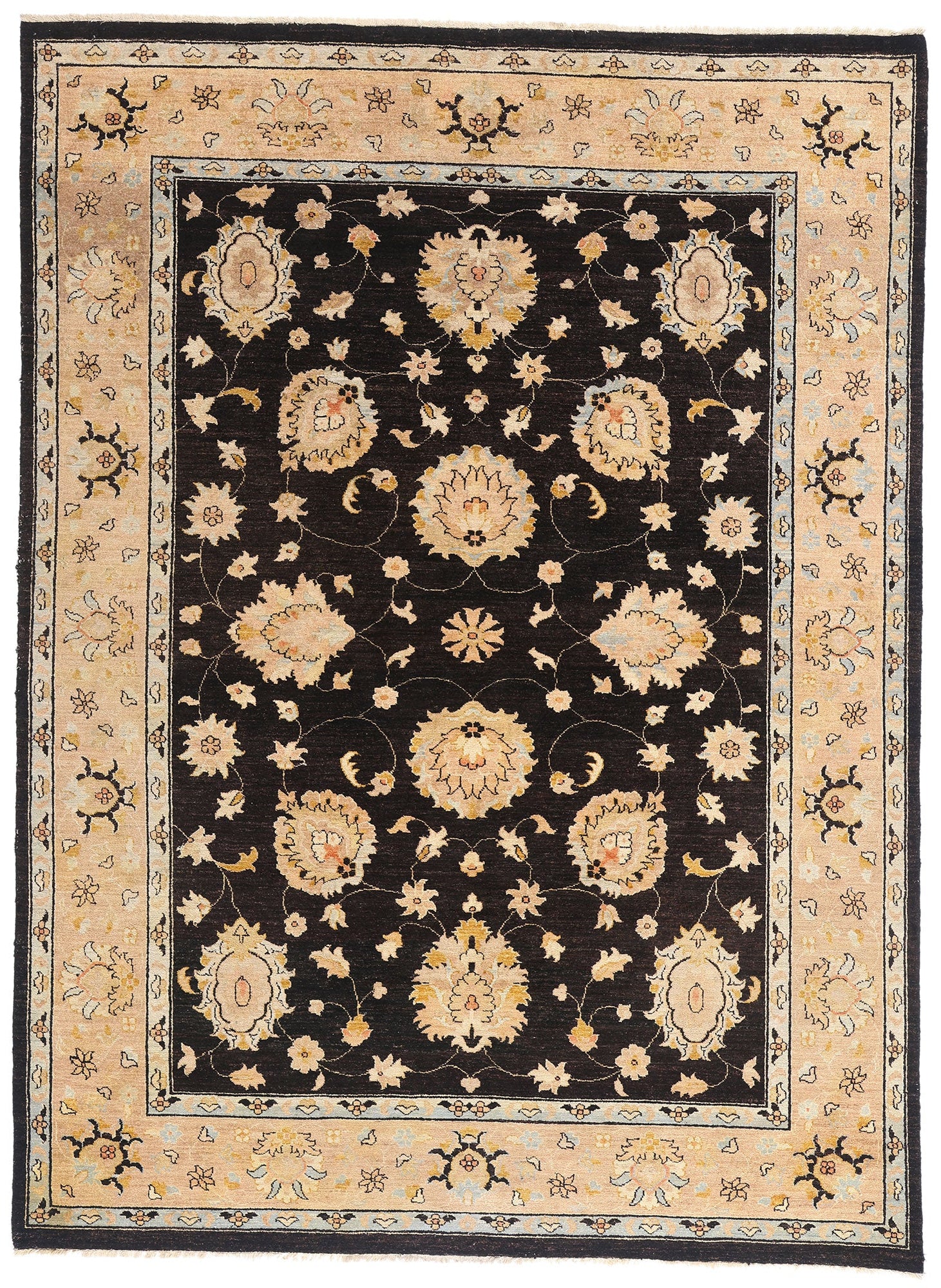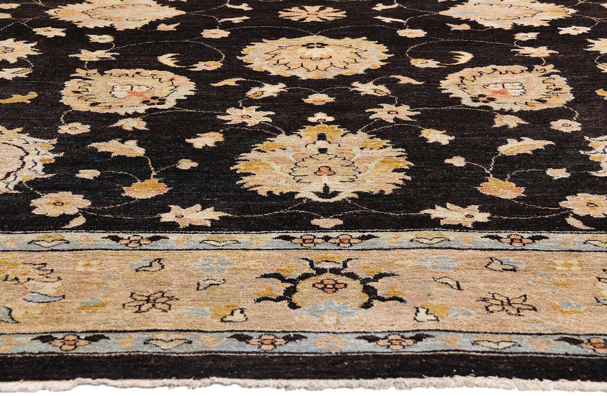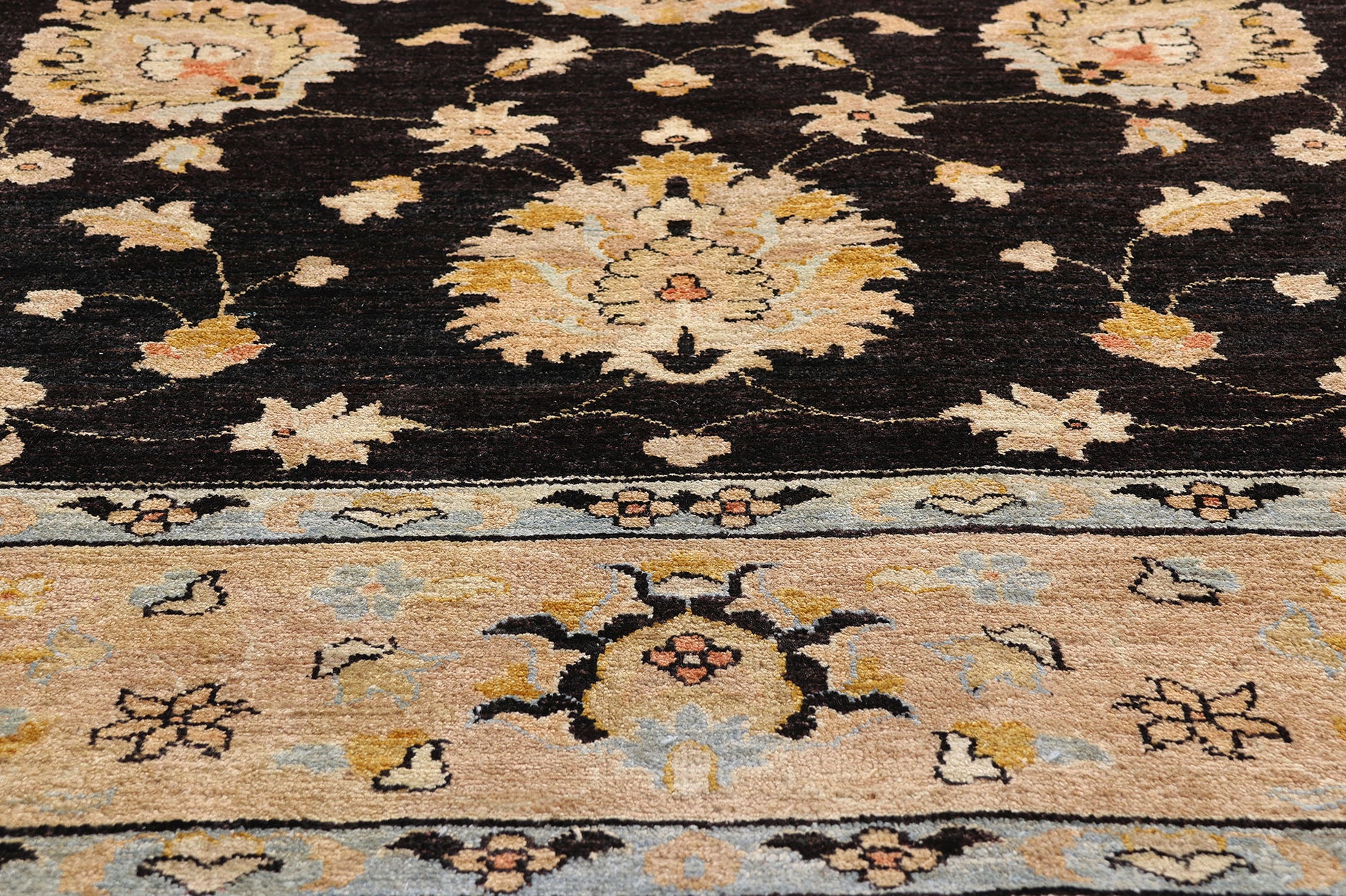 Framed by a luminous border of pale gold, each rosette and cloudband unfurls with a painterly softness, offering a striking contrast to the rug’s noble black ground. This refined tension between drama and subtlety makes it the perfect foundation for interiors designed to project understated wealth and global sophistication — a choice favored by elite collectors and top-tier designers who understand that true luxury whispers rather than shouts.