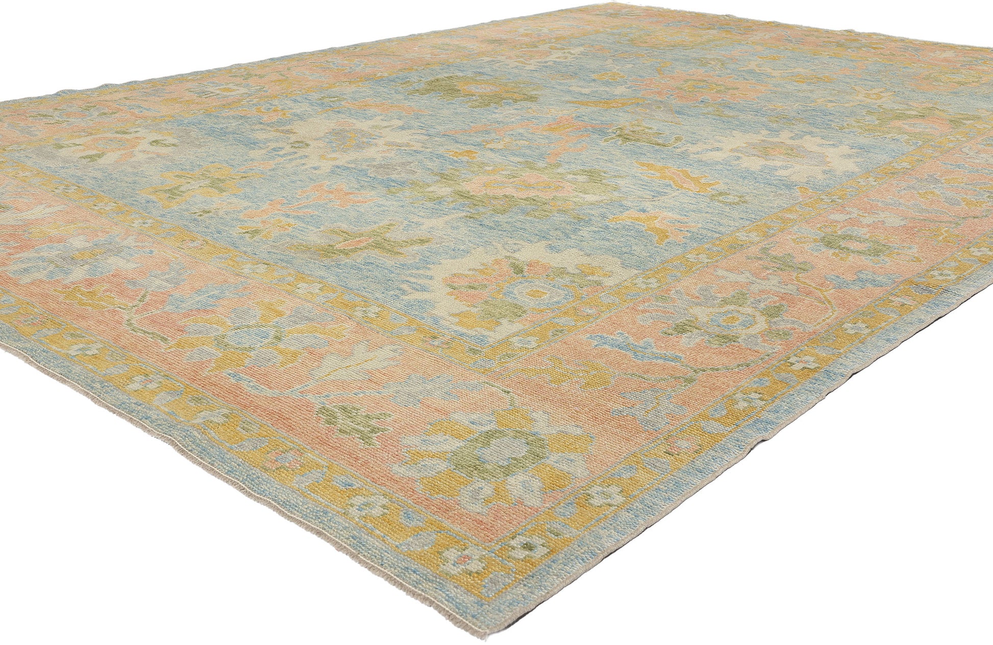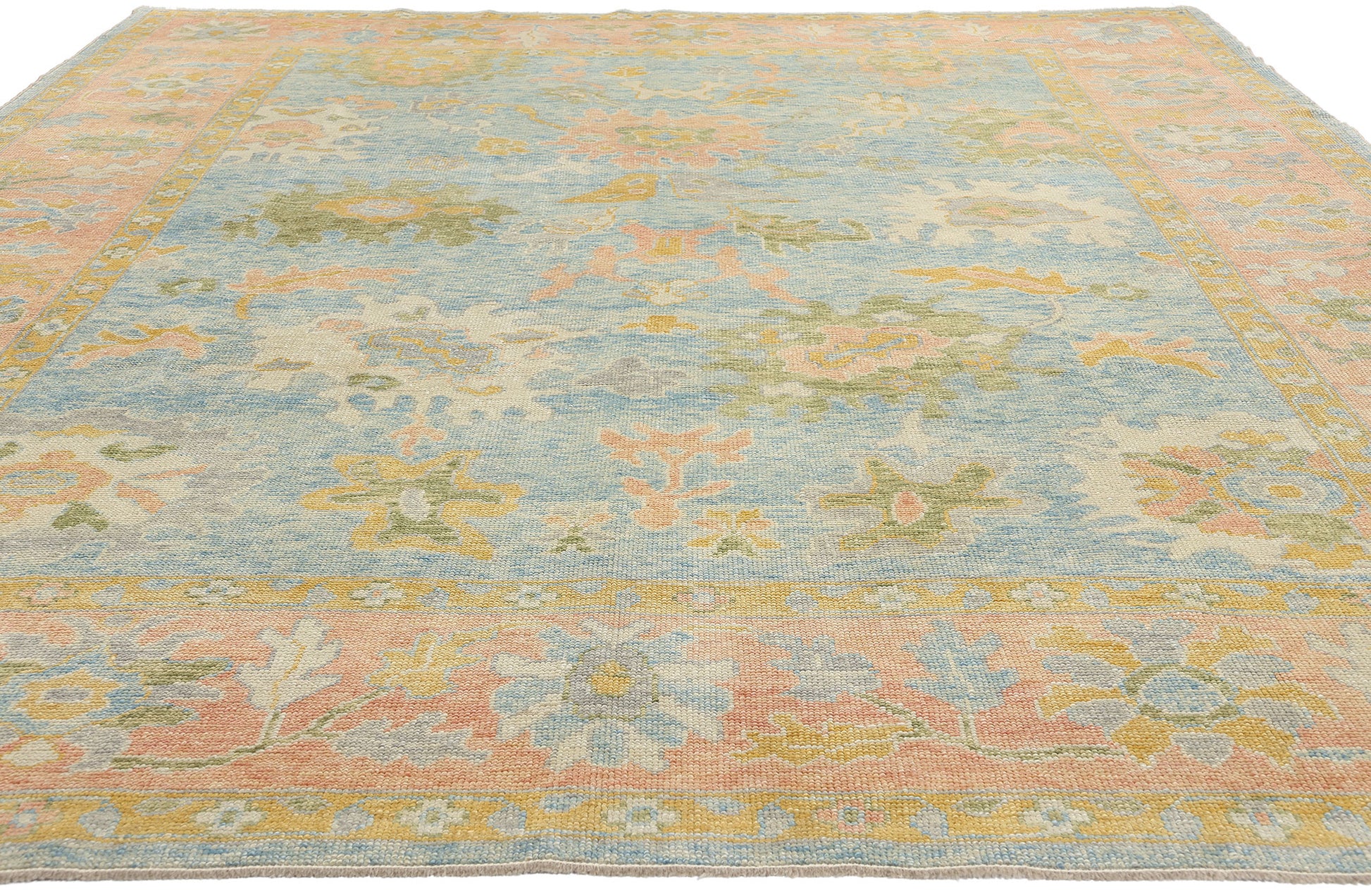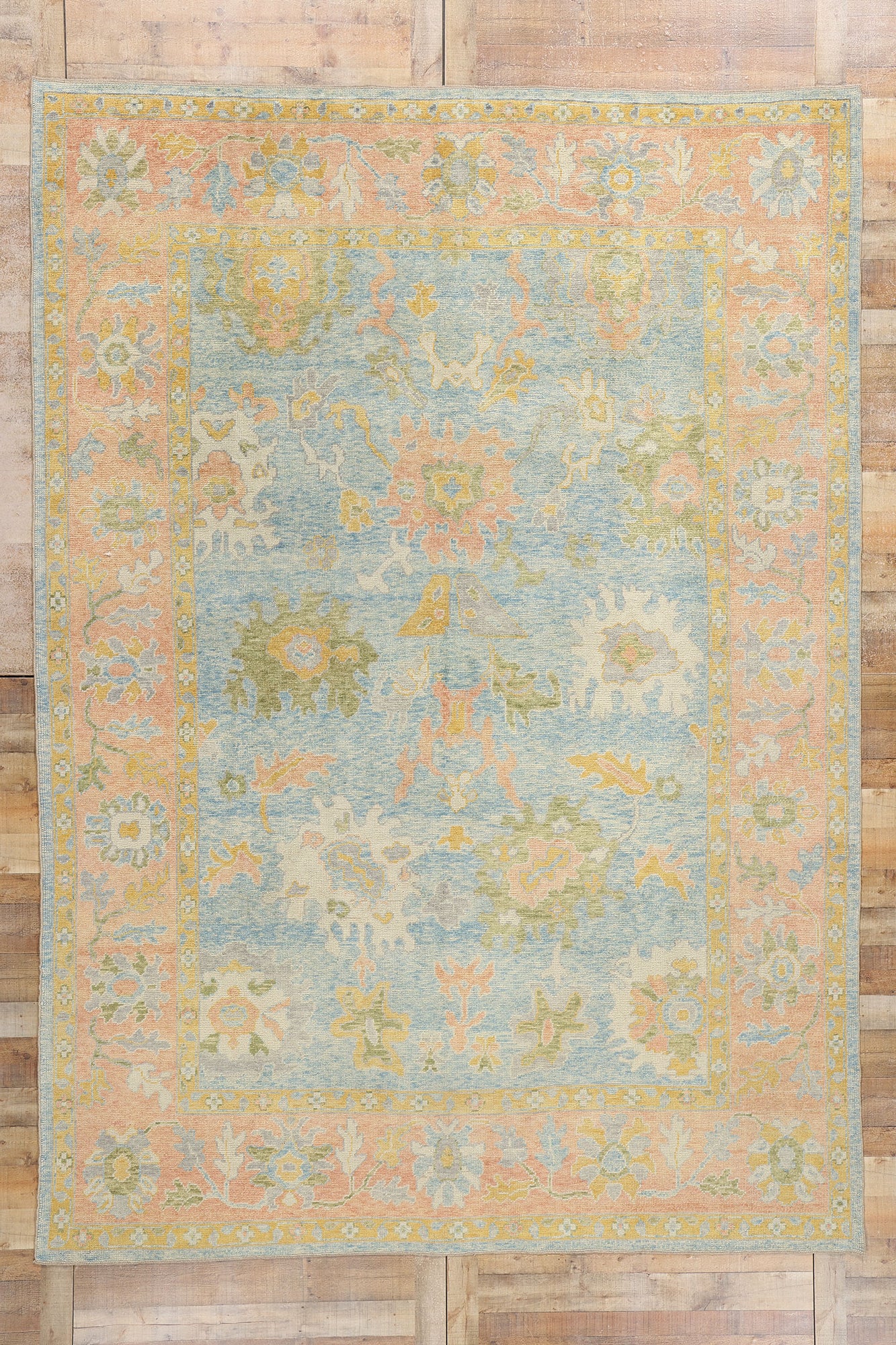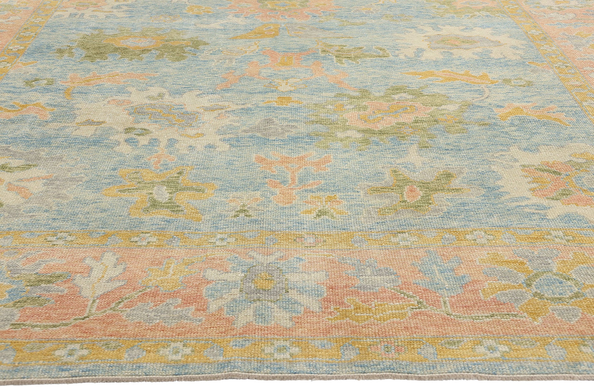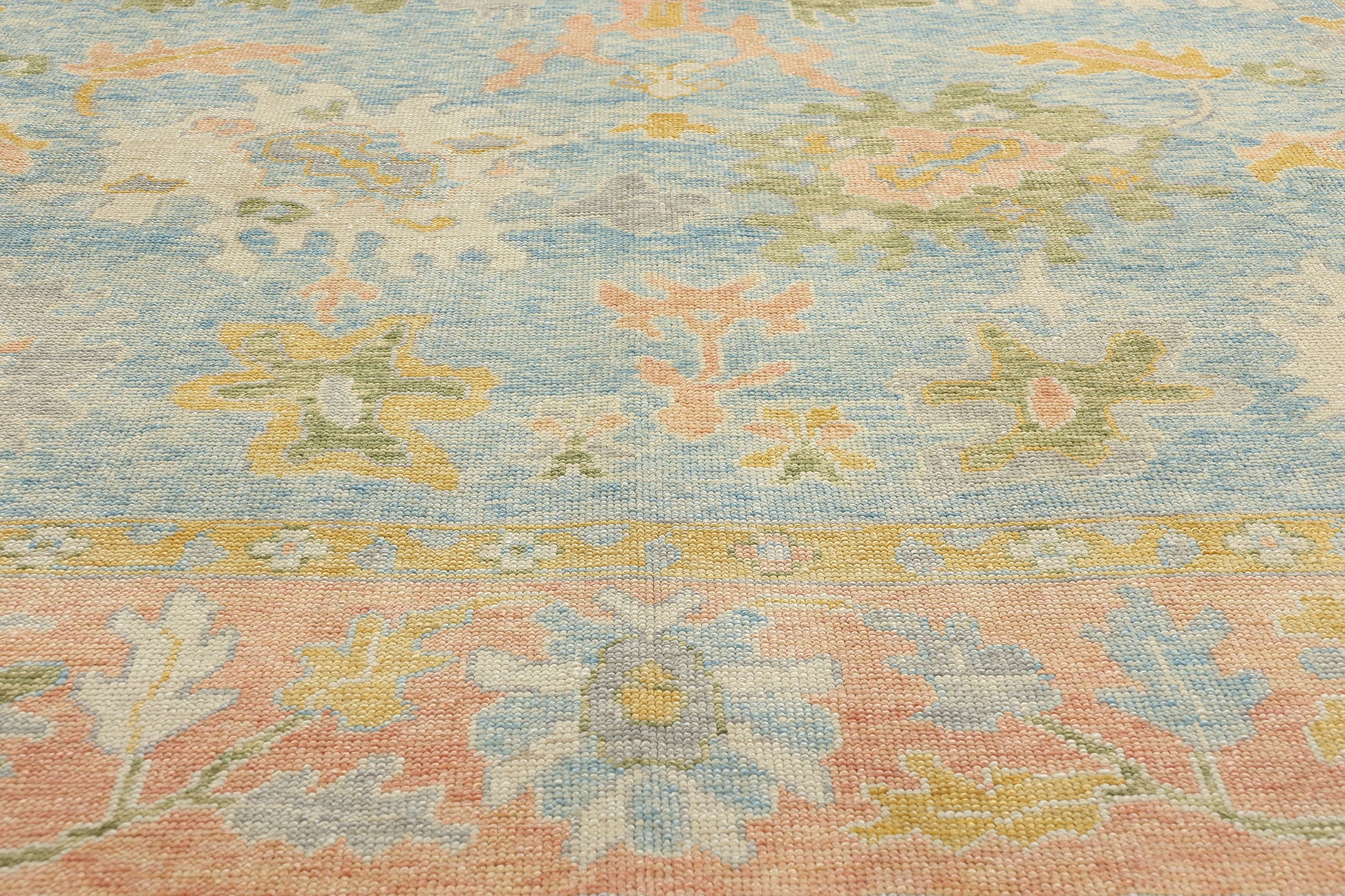 This vibrant hand knotted wool modern Turkish Oushak rug presents a delightful tableau of color and design, marrying traditional craftsmanship with a lively aesthetic. The main field is a captivating canvas of soft blue, providing a rich background that enhances the rust, green, and gold hues of the detailed Harshang motifs scattered across its surface. These botanical elements draw inspiration from Biophilic Design, featuring organic shapes and stylized floral arrangements that offer a dynamic visual rhythm and a sense of ongoing growth and renewal.