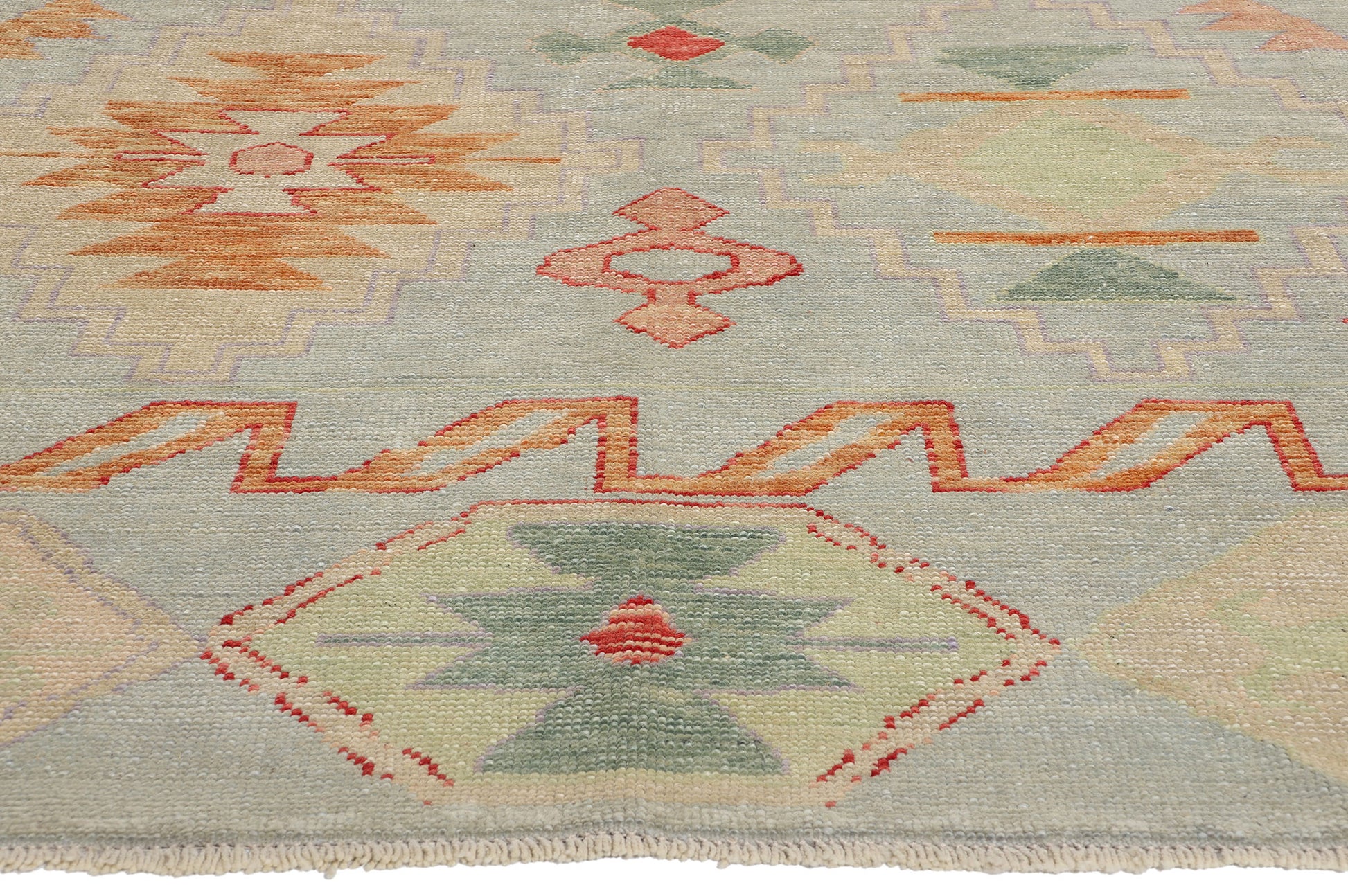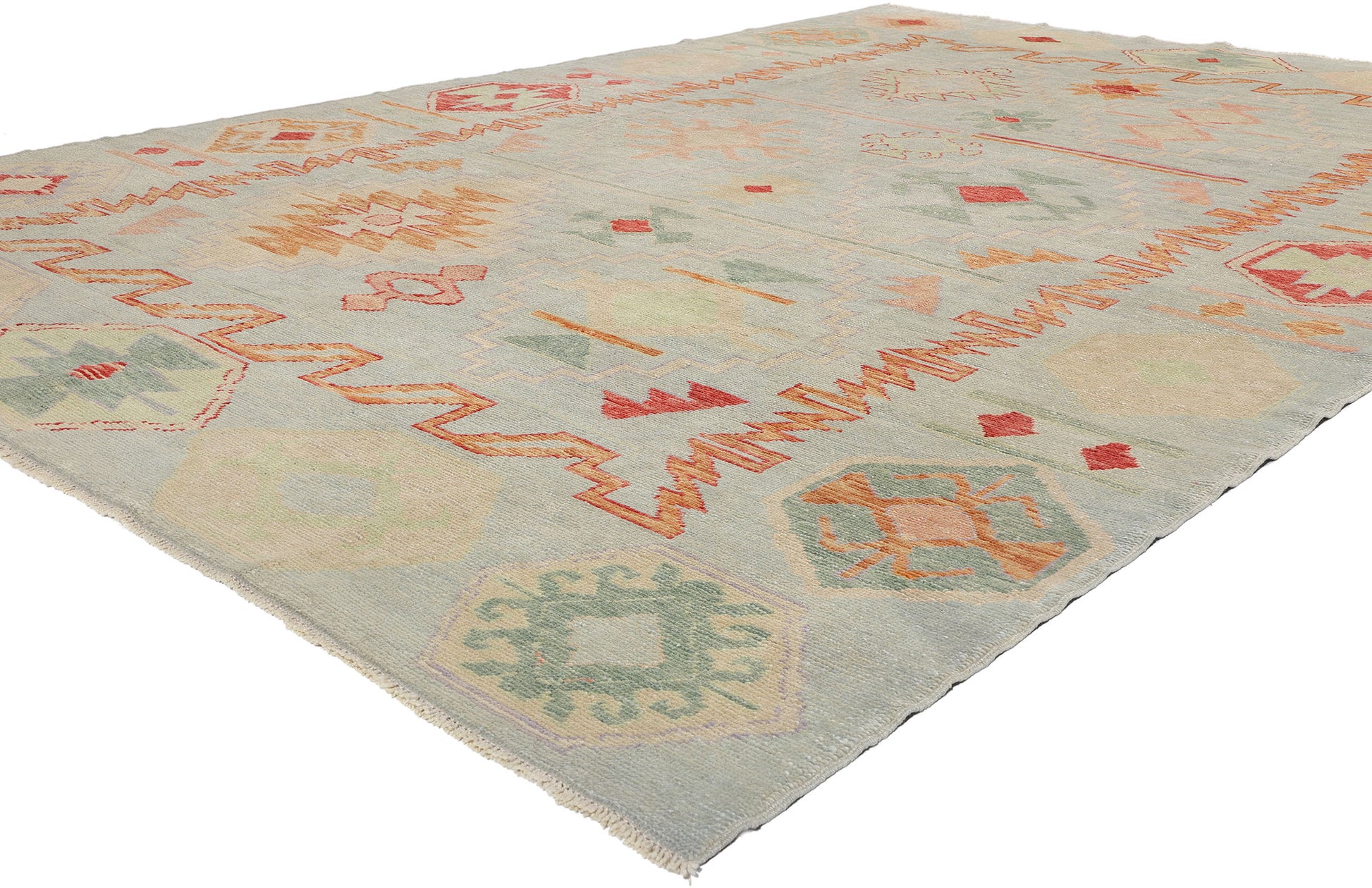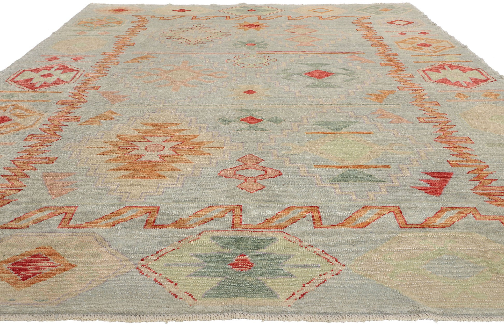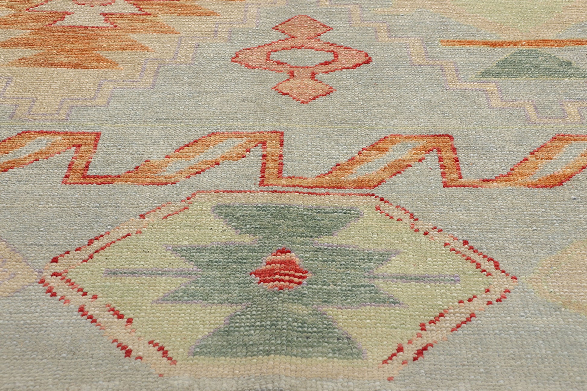 This hand-knotted wool modern Turkish Oushak rug weaves a tale of ancient symbolism and artistry, blending contemporary appeal with timeless Anatolian traditions. The Oushak rug’s soft gray field serves as a neutral canvas for an allover design of esoteric tribal motifs, each carrying profound cultural significance. The thoughtful arrangement of these motifs creates a harmonious balance of form and meaning, making this piece not only a visual delight but also a rich narrative of heritage and belief.