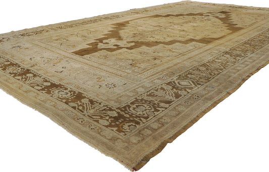 During the 18th and early 19th centuries, Oushak rug weaving declined, only to re-emerge in the 1900s when the Oushak area became the focal point of Turkish rug-making. Oushak rugs made after 1900 are primarily decorative, room-sized rugs featuring stunning medallion designs and intricate patterns that incorporate scatterings of palmettes and vine scrolls, as well as smaller images of bold medallions. Our antique Oushak rugs for sale will dynamically transform any room from nondescript to unforgettable with their quietly intense palettes, detailed motifs, and lustrous wool.