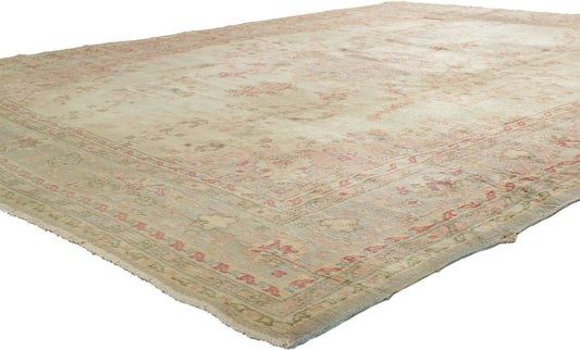 During the 18th and early 19th centuries, Oushak rug weaving declined, only to re-emerge in the 1900s when the Oushak area became the focal point of Turkish rug-making. Oushak rugs made after 1900 are primarily decorative, room-sized rugs featuring stunning medallion designs and intricate patterns that incorporate scatterings of palmettes and vine scrolls, as well as smaller images of bold medallions. Our antique Oushak rugs for sale will dynamically transform any room from nondescript to unforgettable with their quietly intense palettes, detailed motifs, and lustrous wool.