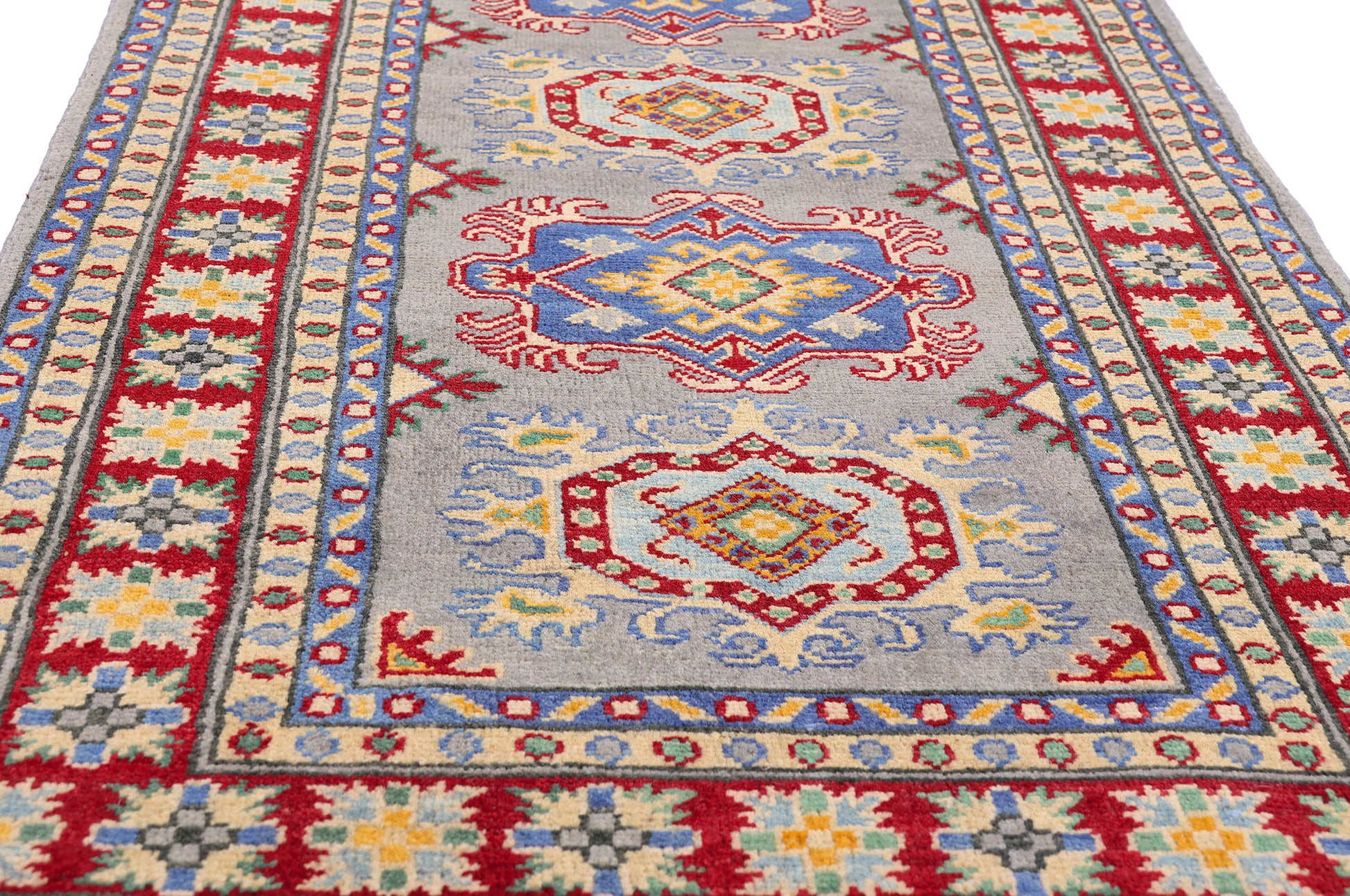 Long and commanding, this hand-knotted wool vintage Kazak runner from Pakistan embodies the enduring language of tribal symbolism—refined through generations and expressed with striking clarity. Its elongated form evokes procession and passage, guiding the eye through a rhythmic narrative of heritage and identity. This is an extraordinary masterpiece that carries presence with intention, designed not only to adorn a space, but to impart a sense of continuity, strength, and cultivated distinction.