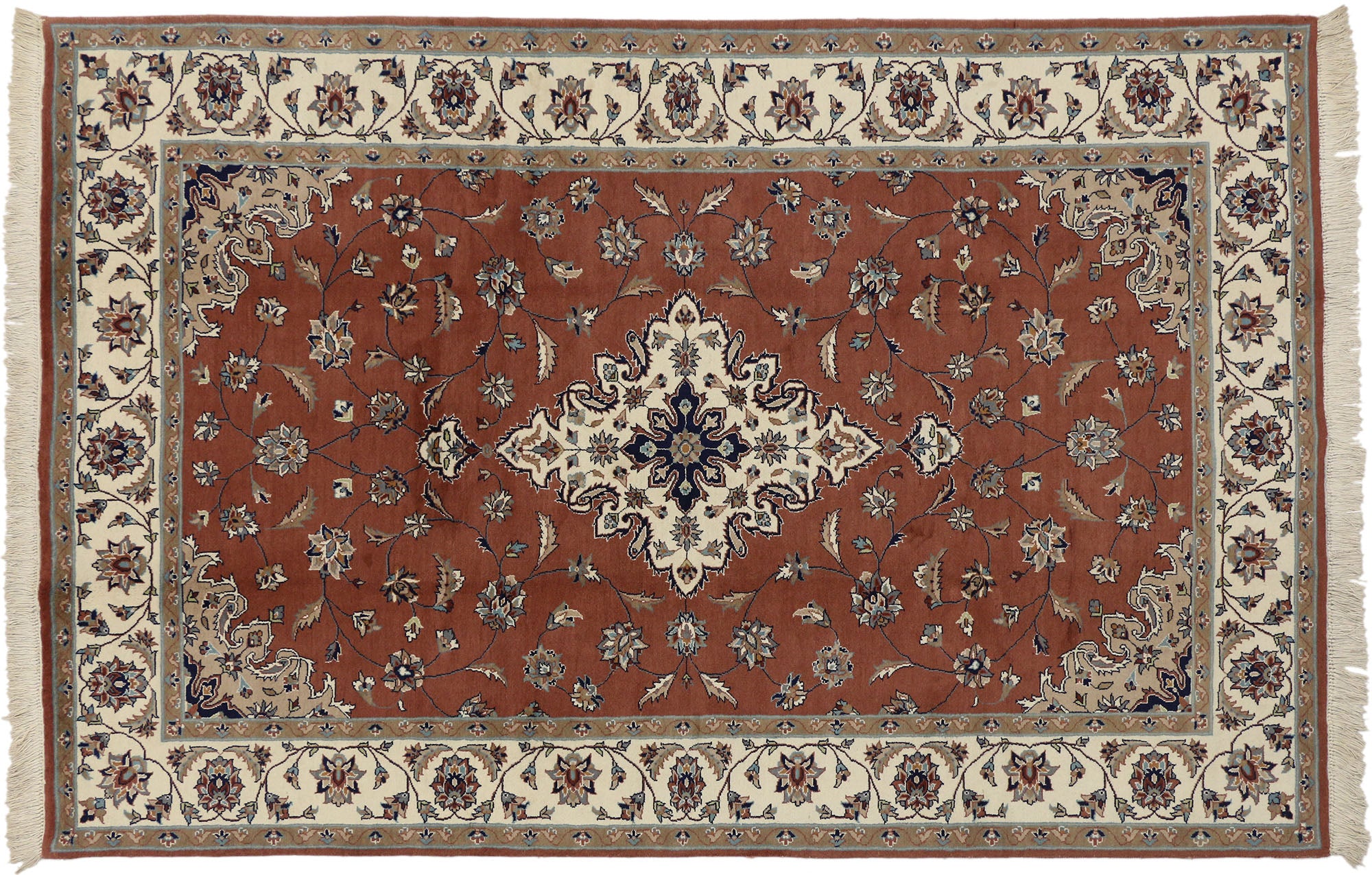 This hand knotted wool vintage Pakistani rug beautifully displays a Persian design. It features a cusped cream medallion anchored with pendants floating on an abrashed clay-pot colored backdrop. The medallion is surrounded by arabesque vines, acanthus leaves, blooming palmettes, and lotus flowers. It is enclosed with elegant taupe spandrels in each corner a classic Herat border flanked with inner and outer meander guard bands. Well-suited for a wide range of interior styles: Art Nouveau, Traditional, Baroque, Tudor, Jacobean, Manor House, Bungalow, Eclectic, Modern, Contemporary, Romantic, Cottage, French Rococo, Regency, and Hollywood Regency.