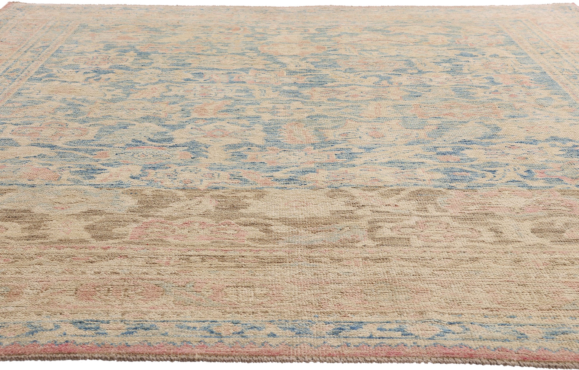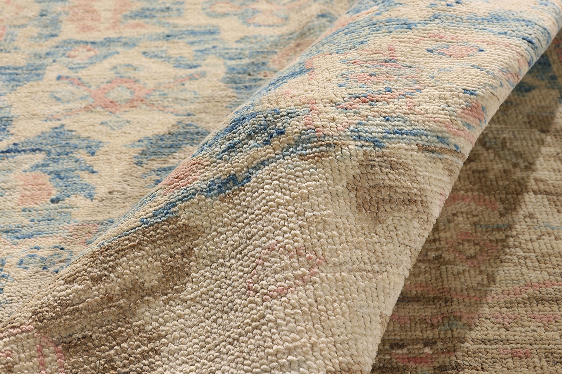 Subtle tonal shifts move organically across the rug, lending it a lived-in sophistication reminiscent of antique pieces aged gracefully over generations. The surrounding border, delicately understated, frames the composition without confining it—serving as a quiet architectural anchor rather than a decorative interruption. This balance between structure and openness is what gives modern Oushak rugs their enduring appeal among elite designers and collectors.