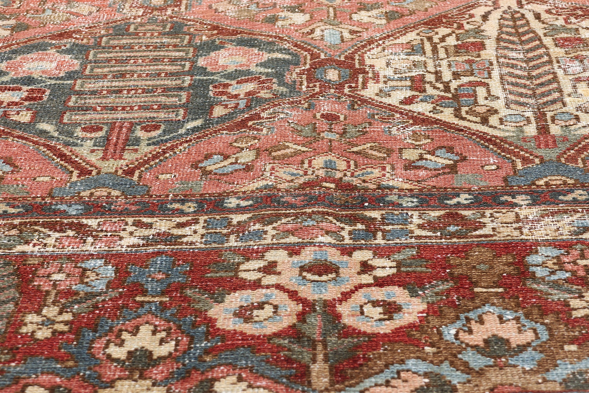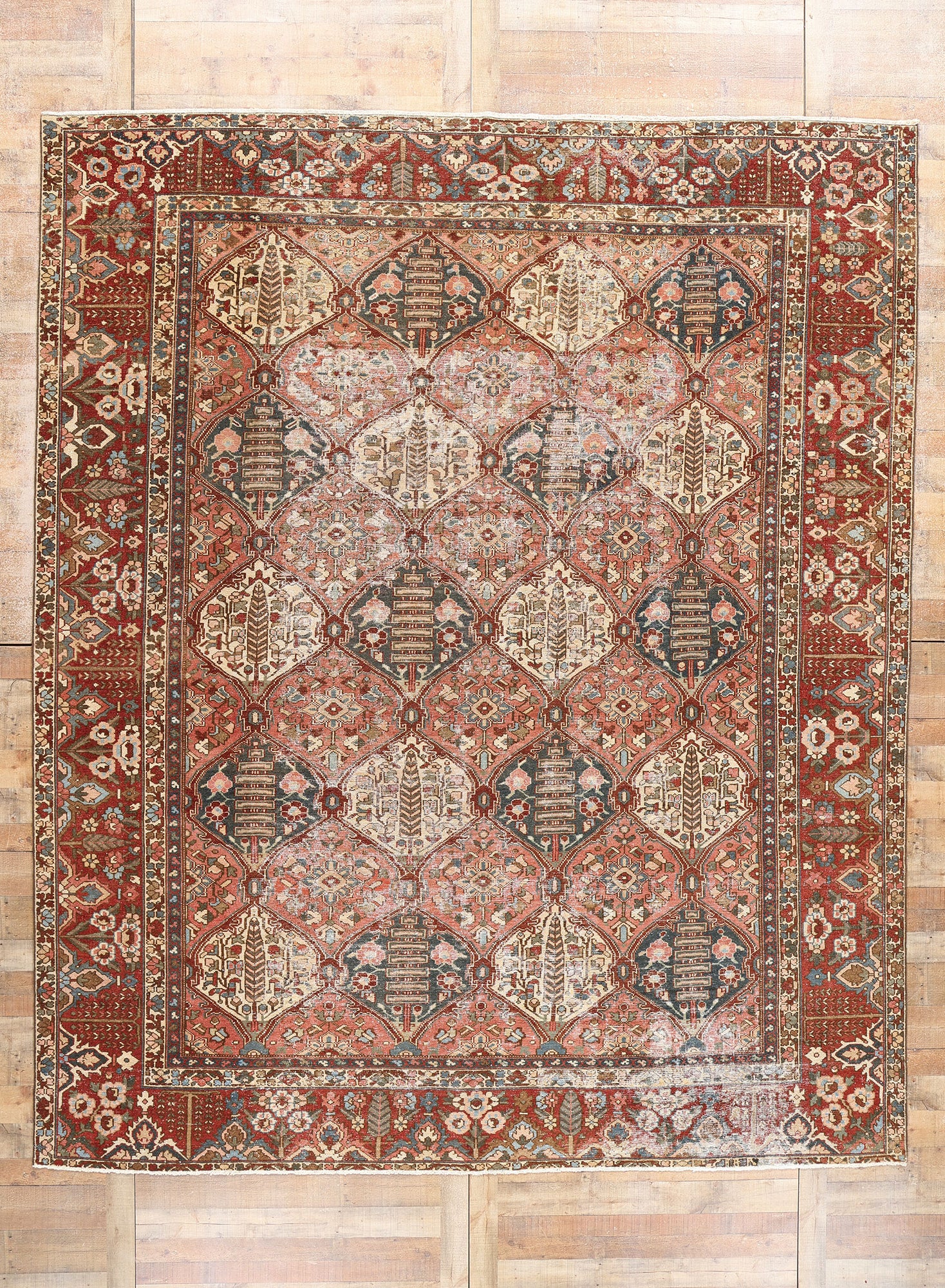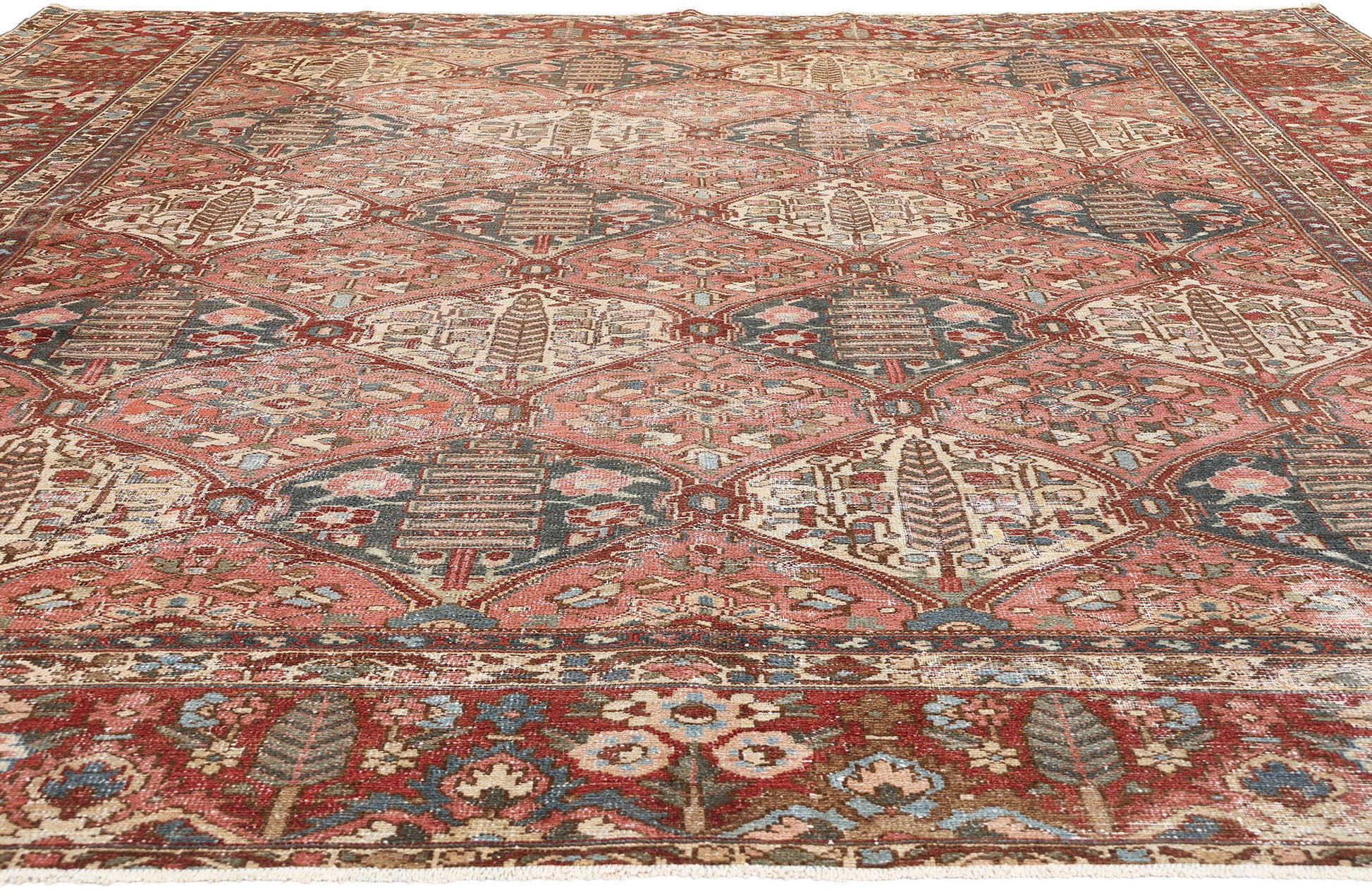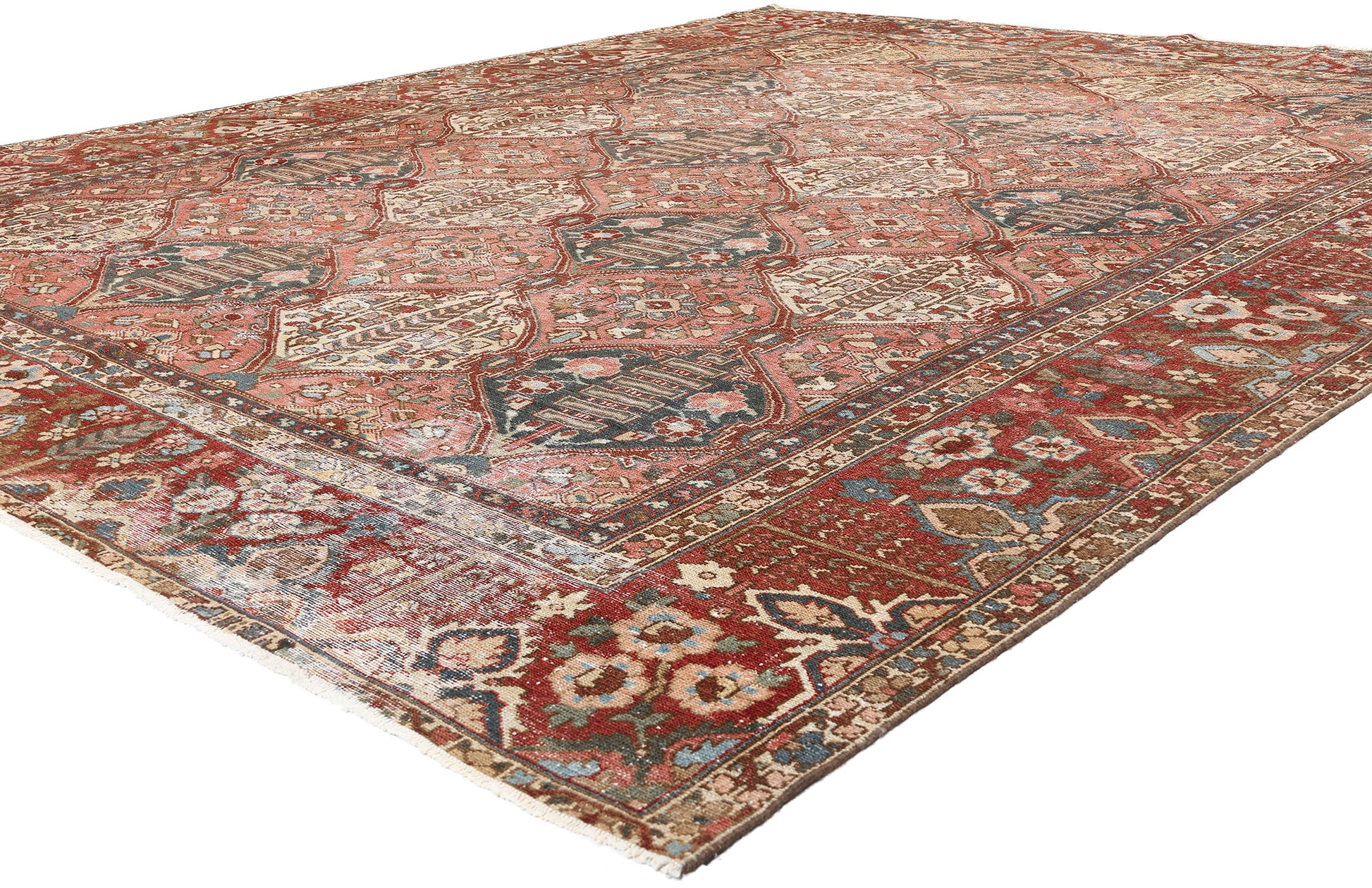 This hand-knotted wool distressed antique Persian Bakhtiari rug is a true testament to the artistry and cultural heritage of the Bakhtiari tribespeople, who call the rugged Zagros Mountains their home. The grandeur of its Chahar Bagh (four gardens) design and the masterful craftsmanship reflect the weavers’ enduring connection to nature and their dreams. Featuring the iconic Garden Panel Design, or Khesti, this Persian Bakhtiari rug exudes timeless allure, enriched by its antique wash that lends a softened patina to its vivid hues and intricate motifs.