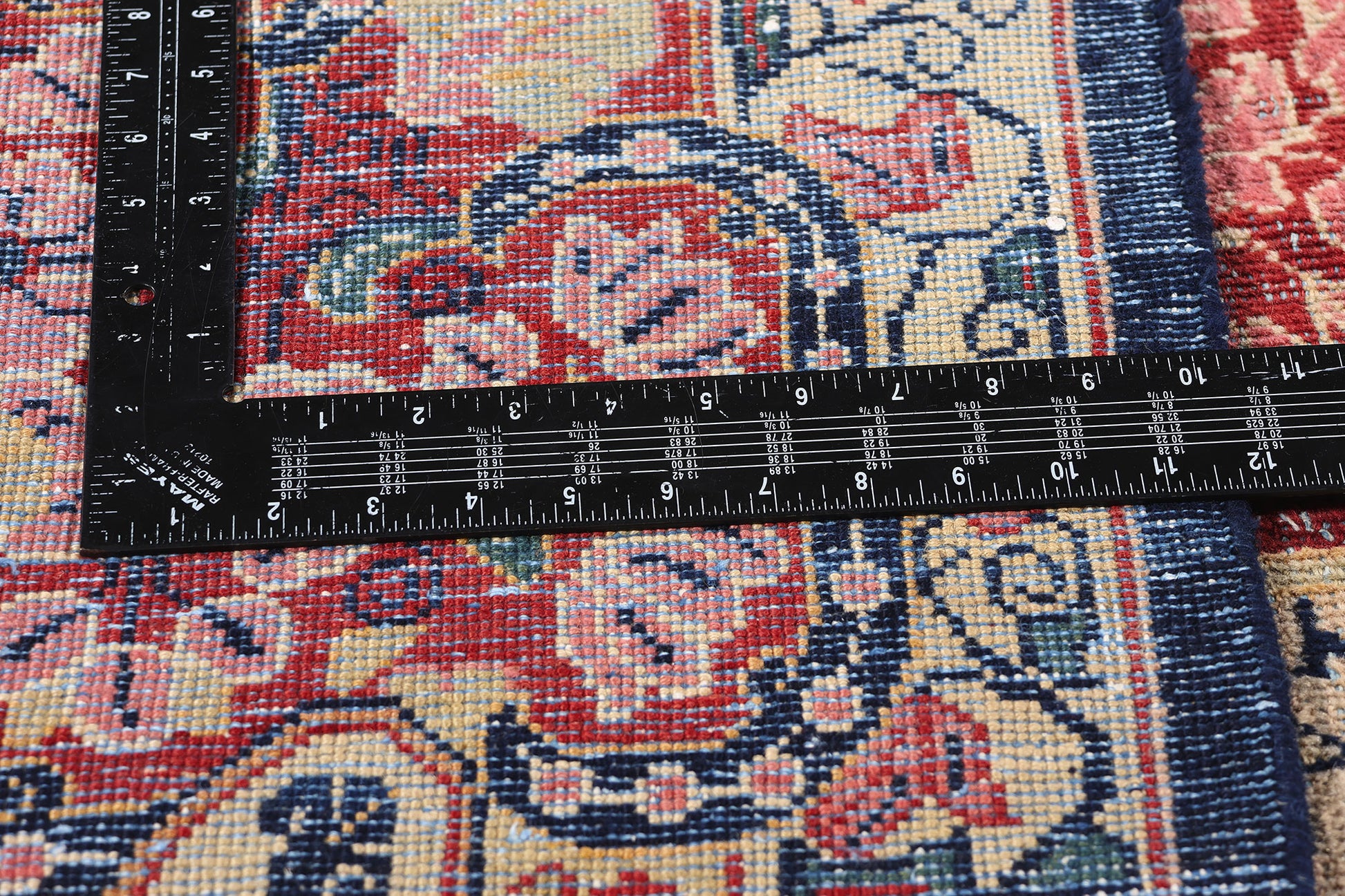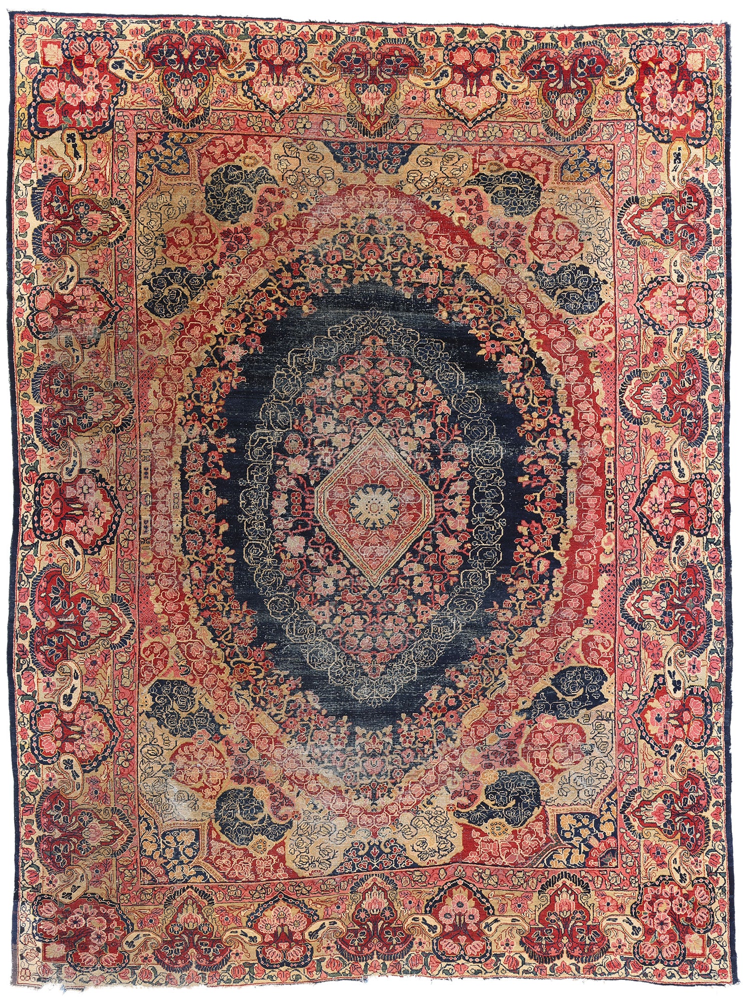 Encircling the field is an elaborate border design composed of a series of floral meander borders. The primary border features large-scale superimposed red cartouche-style medallions, each embellished with delicate pink blossoms and navy-blue leafy tendrils. These medallions are interspersed with boteh motifs, symbolizing life, fertility, and eternity, which add layers of cultural significance to the design. The outer and inner guard borders, adorned with smaller floral meanders, seamlessly complement the main border, creating a richly detailed frame that highlights the central artistry.