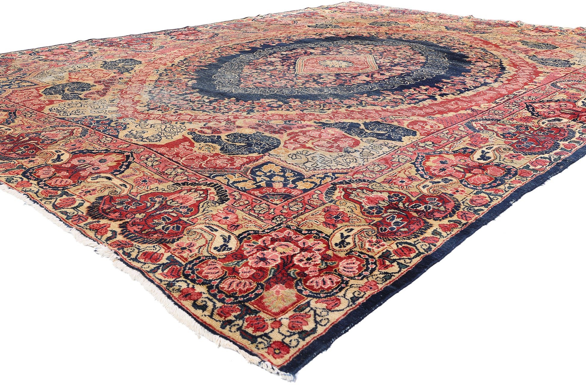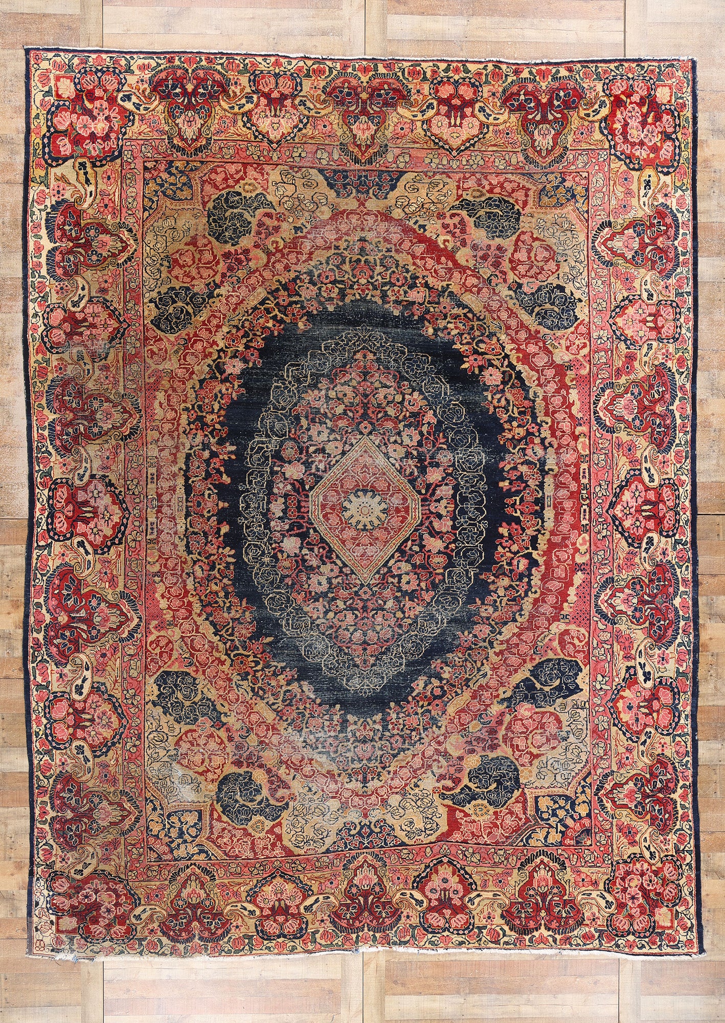 This hand-knotted wool distressed antique Persian Mahal rug is a masterpiece of romantic charm and historical allure. The mesmerizing design is anchored by a concentric oval medallion that seems to float gracefully on a midnight navy-blue field. This central medallion is delicately ornamented with intricate floral and vine motifs, creating a visual symphony of elegance and refinement. At its core, a diamond-shaped lozenge medallion emerges, adorned with detailed floral patterns, further amplifying the rug's sense of sophistication and artistry.