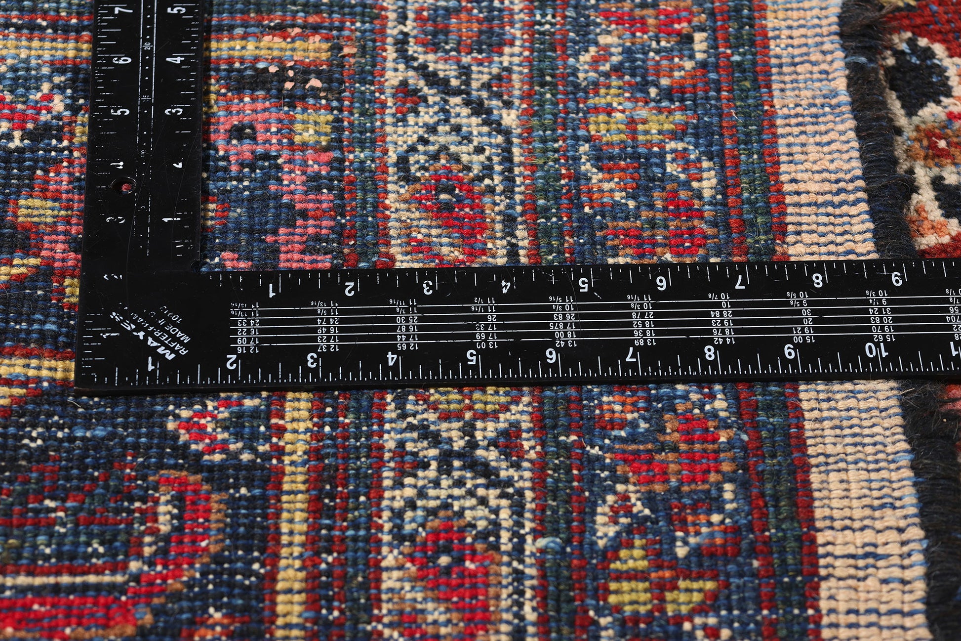 Framing this breathtaking field is a classic Persian border set against a rich navy-blue backdrop. The border is adorned with a series of floral and geometric patterns, reflecting the masterful balance of artistry and structure that Persian rugs are known for. Flanking this main border are double inner and outer meander guard bands, which add layers of depth and complexity to the design. These guard bands not only enhance the rug's visual appeal but also underscore its meticulous craftsmanship and attention to detail.