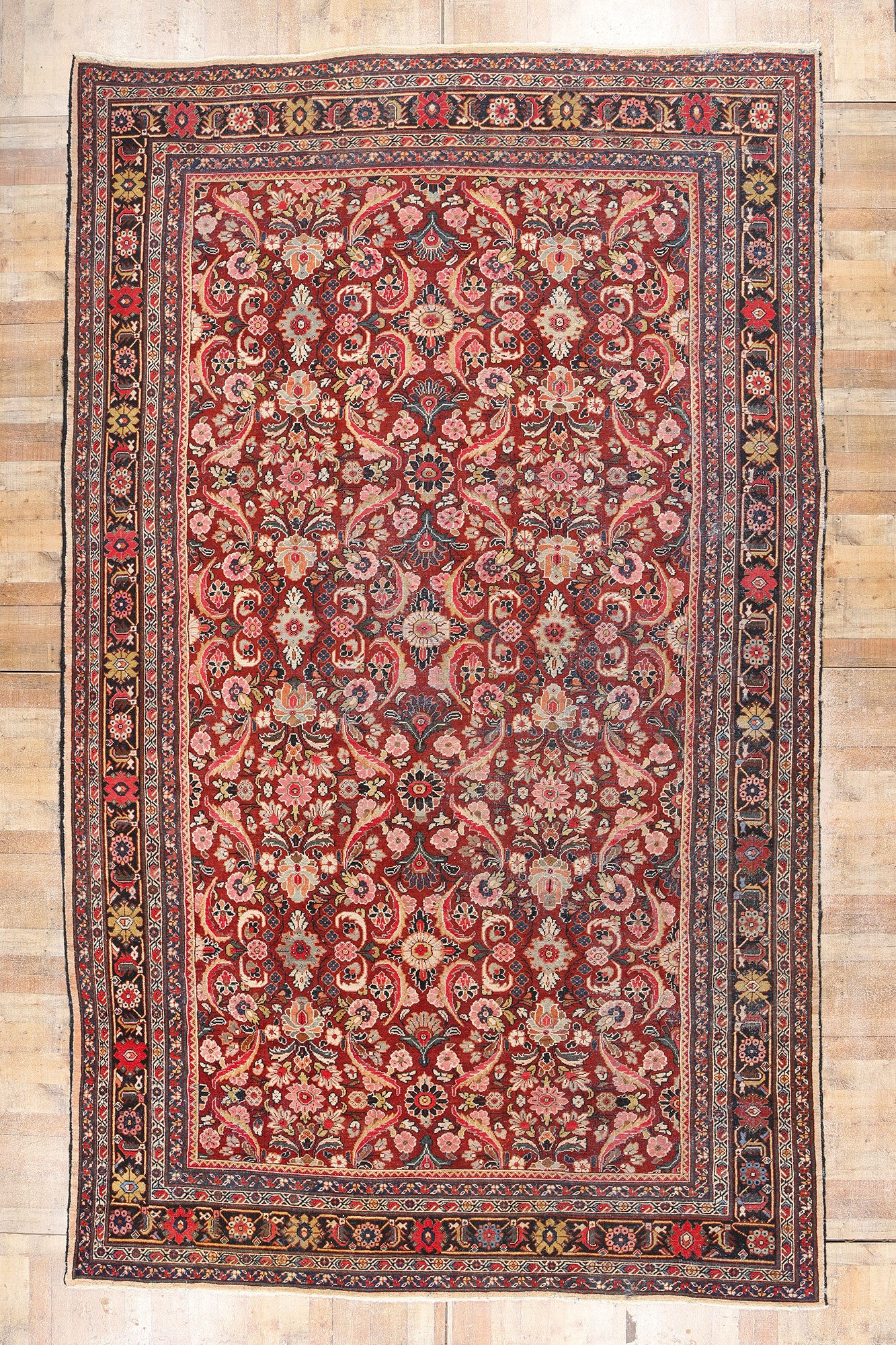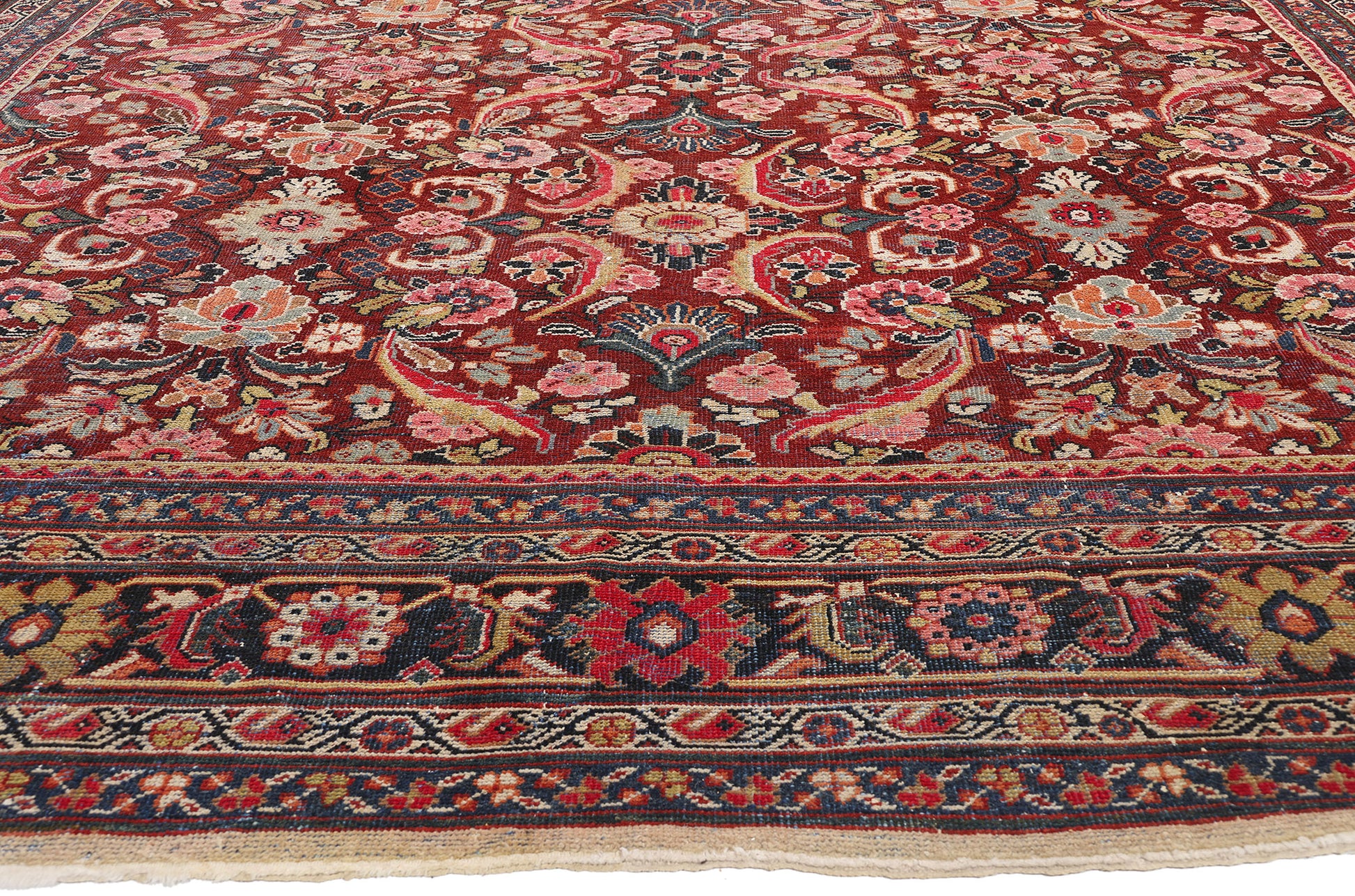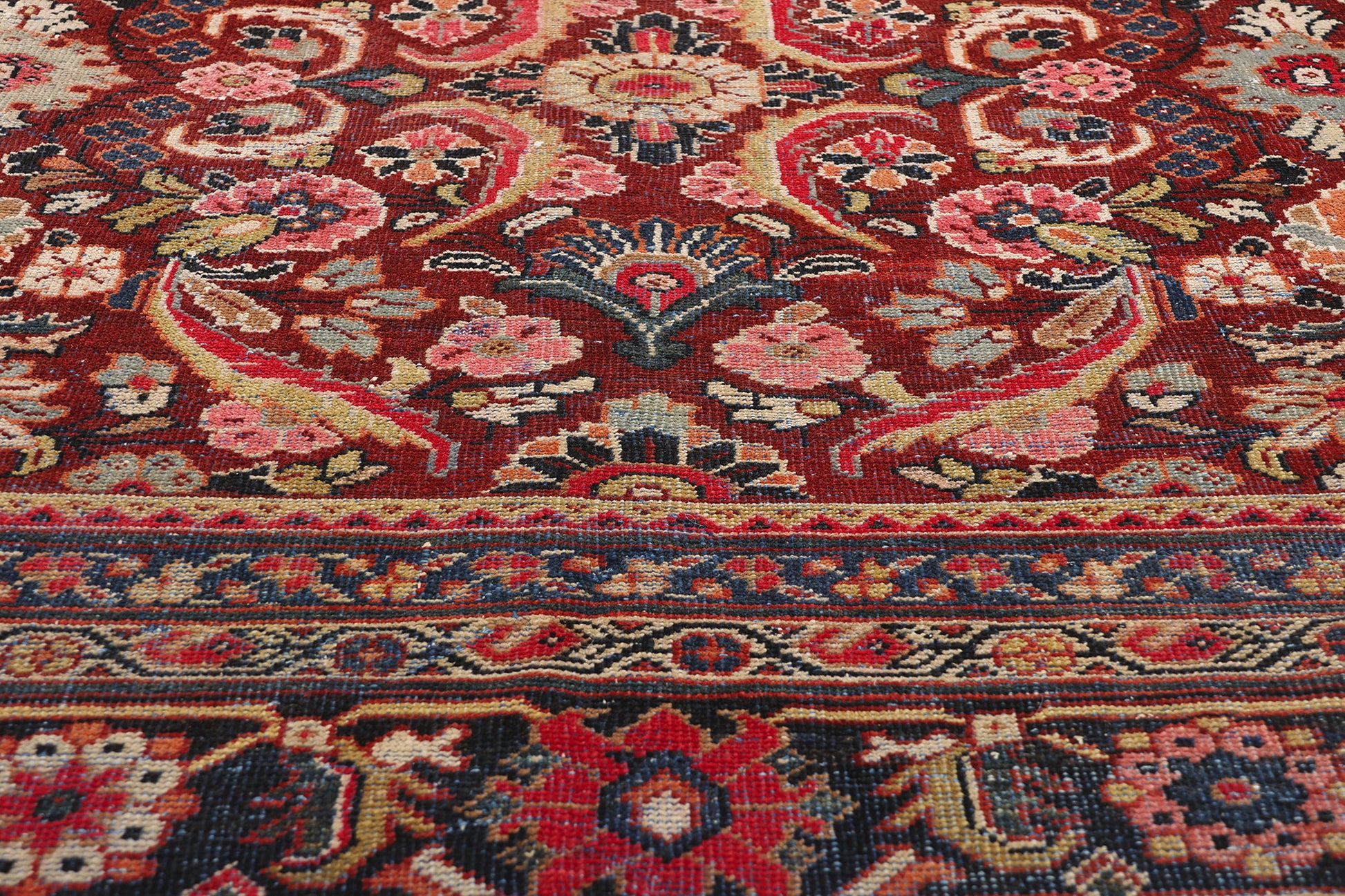 This hand-knotted antique Persian Mahal rug is a stunning testament to the artistry and cultural depth of Persian weaving traditions. Its richly decorative allover pattern is composed of Mina Khani motifs, which are celebrated for their intricate arrangements of floral elements. These motifs, featuring stylized blossoms connected by delicate vinework, represent the harmony and interconnectedness found in nature. The central flowers are often symbolic of life, growth, and renewal, while their continuous lattice-like layout evokes a sense of boundless beauty and infinite repetition.