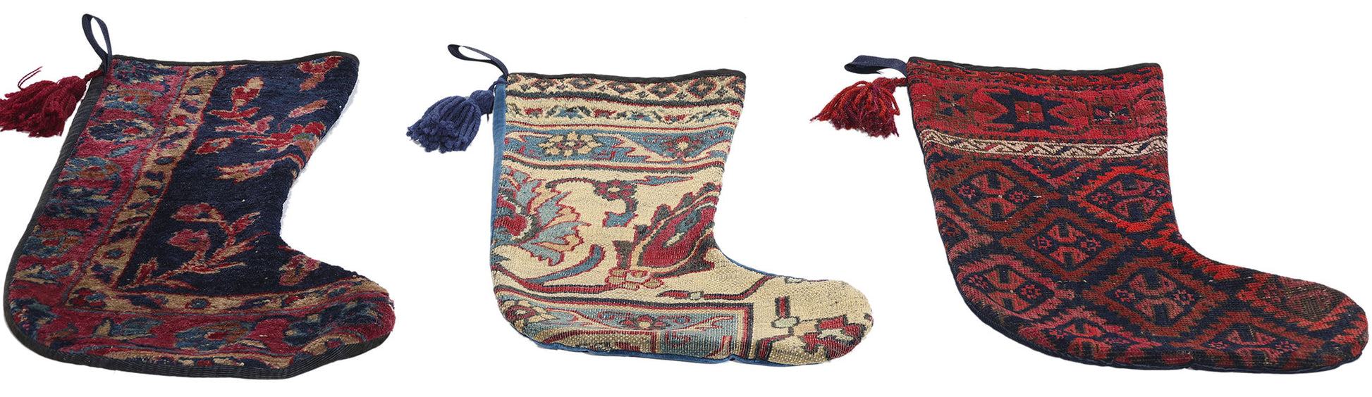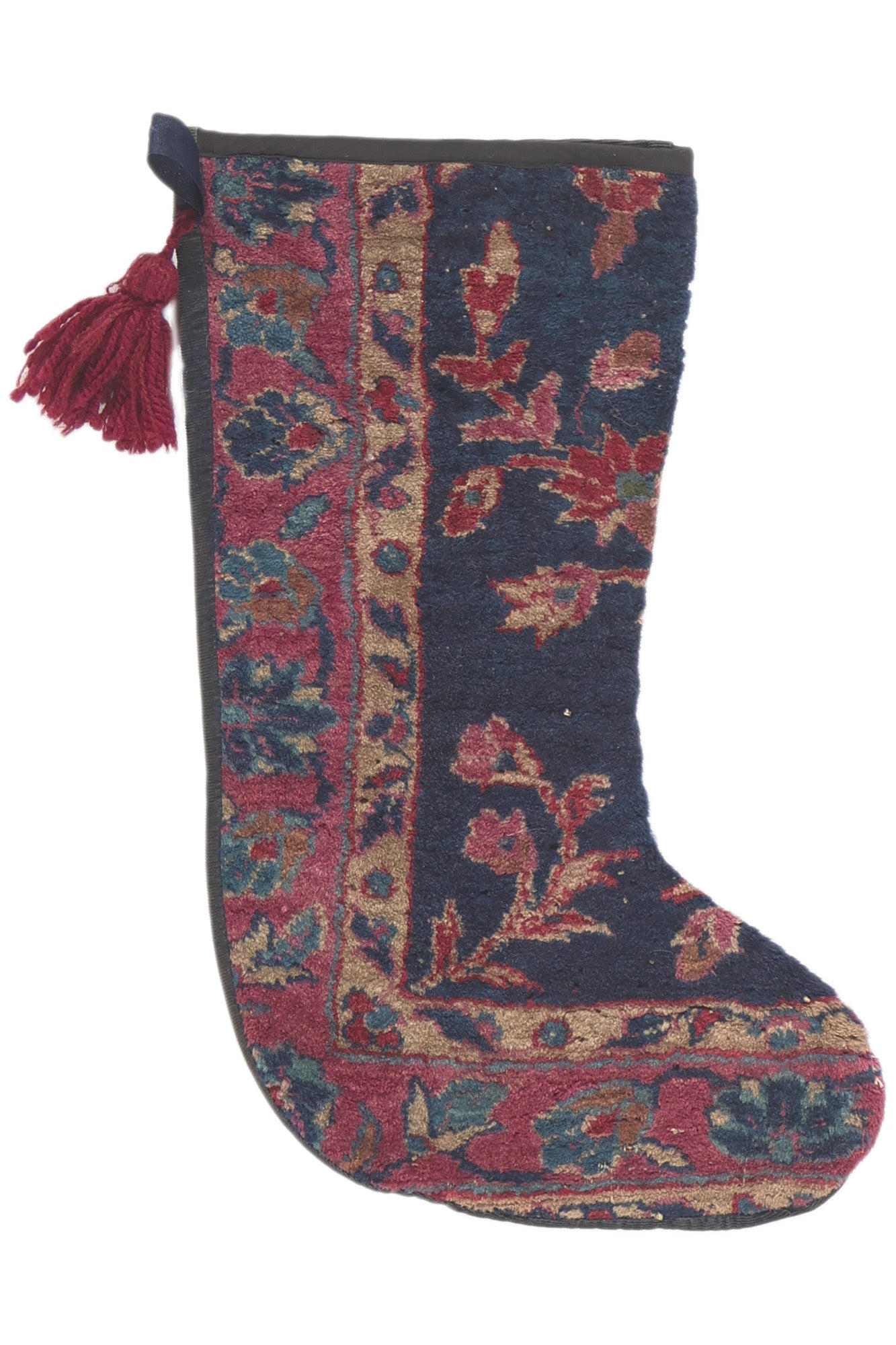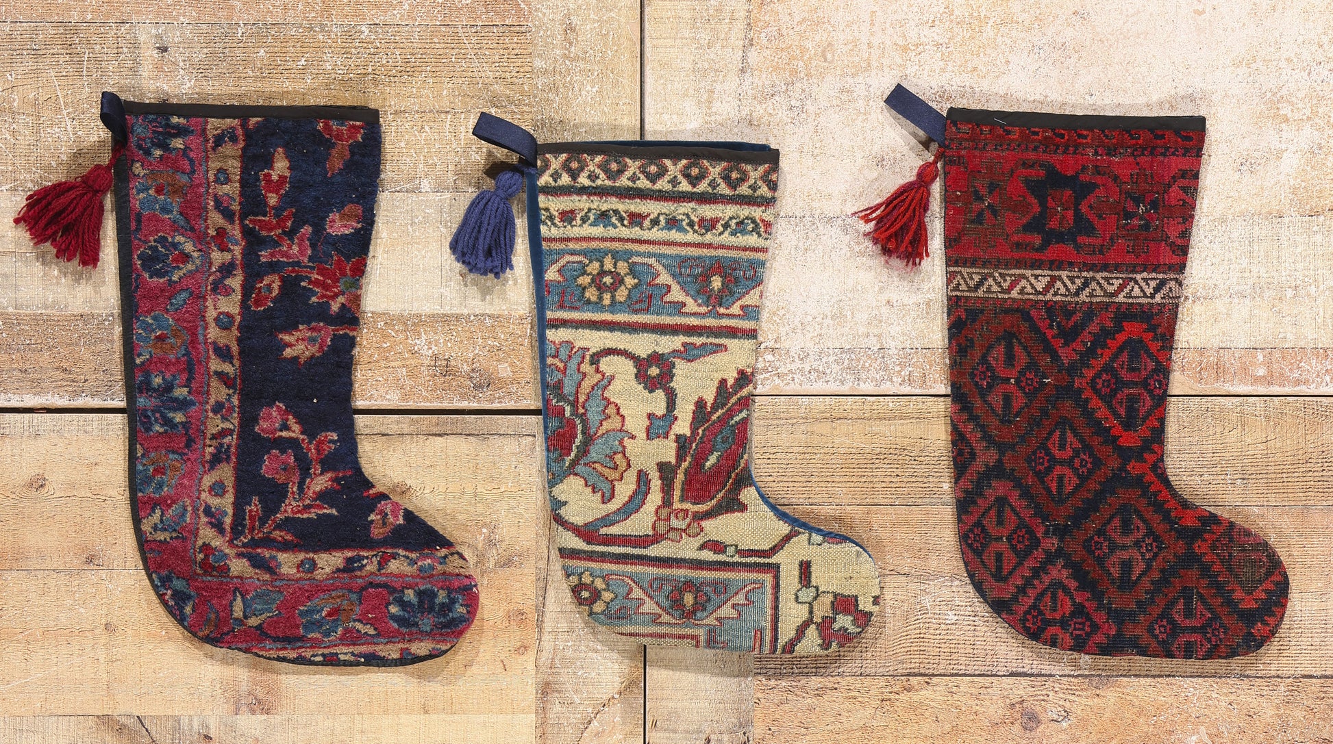 Antique rug Christmas stockings are unique holiday decorations made from hand knotted wool vintage and antique rugs, often repurposed or crafted for sustainable design. These stockings are typically made from wool or silk and feature intricate handwoven or hand-knotted construction. The designs reflect cultural motifs from Persian, Turkish, or Moroccan rugs, such as floral patterns, geometric shapes, and symbols like the Tree of Life or pomegranates. Their rich colors and craftsmanship make them collectible pieces, valued for their historical significance and artistry. Antique rug Christmas stockings add charm and festive elegance to holiday décor, offering a blend of tradition, craftsmanship, and timeless beauty.