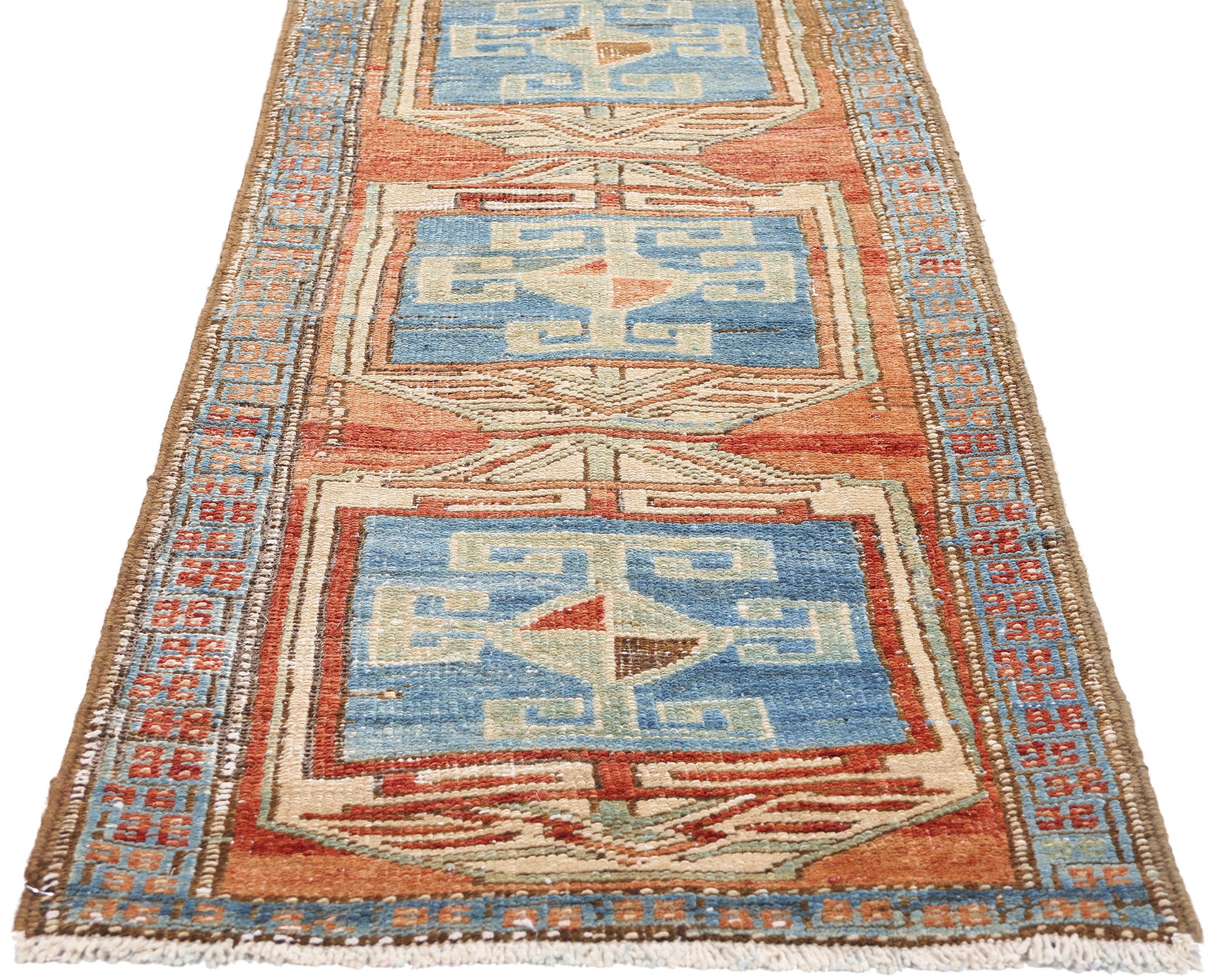 This hand-knotted wool distressed vintage Persian Heriz rug runner encapsulates the timeless beauty of tribal artistry and nomadic heritage. It exudes tribal enchantment and nomadic charm, with its richly striated brick red and terra cotta backdrop lending a sense of depth and texture. The antique wash and distressed composition imbue this Heriz carpet runner with weathered finesse, capturing the essence of laid-back luxury and years of cultural significance.
