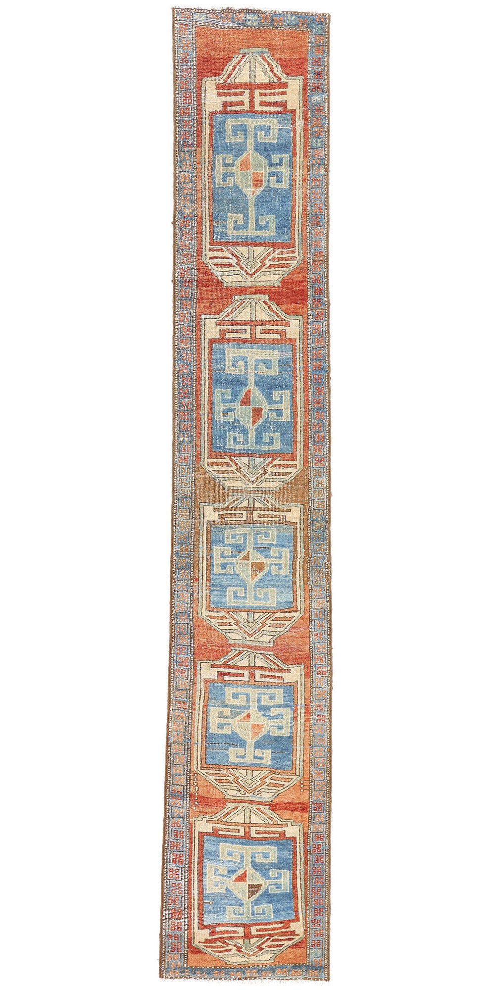At the heart of this runner lie five striking blue medallions, each intricately adorned with Ram's Horn motifs and central yin-yang symbols. The Ram's Horn, a potent emblem of fertility, heroism, power, and masculinity, pays homage to the strength and resilience of tribal traditions. The yin-yang symbols, representing the harmony and balance between male and female energies, add a layer of profound philosophical depth, weaving a narrative of unity and equilibrium into the fabric of this Persian masterpiece.