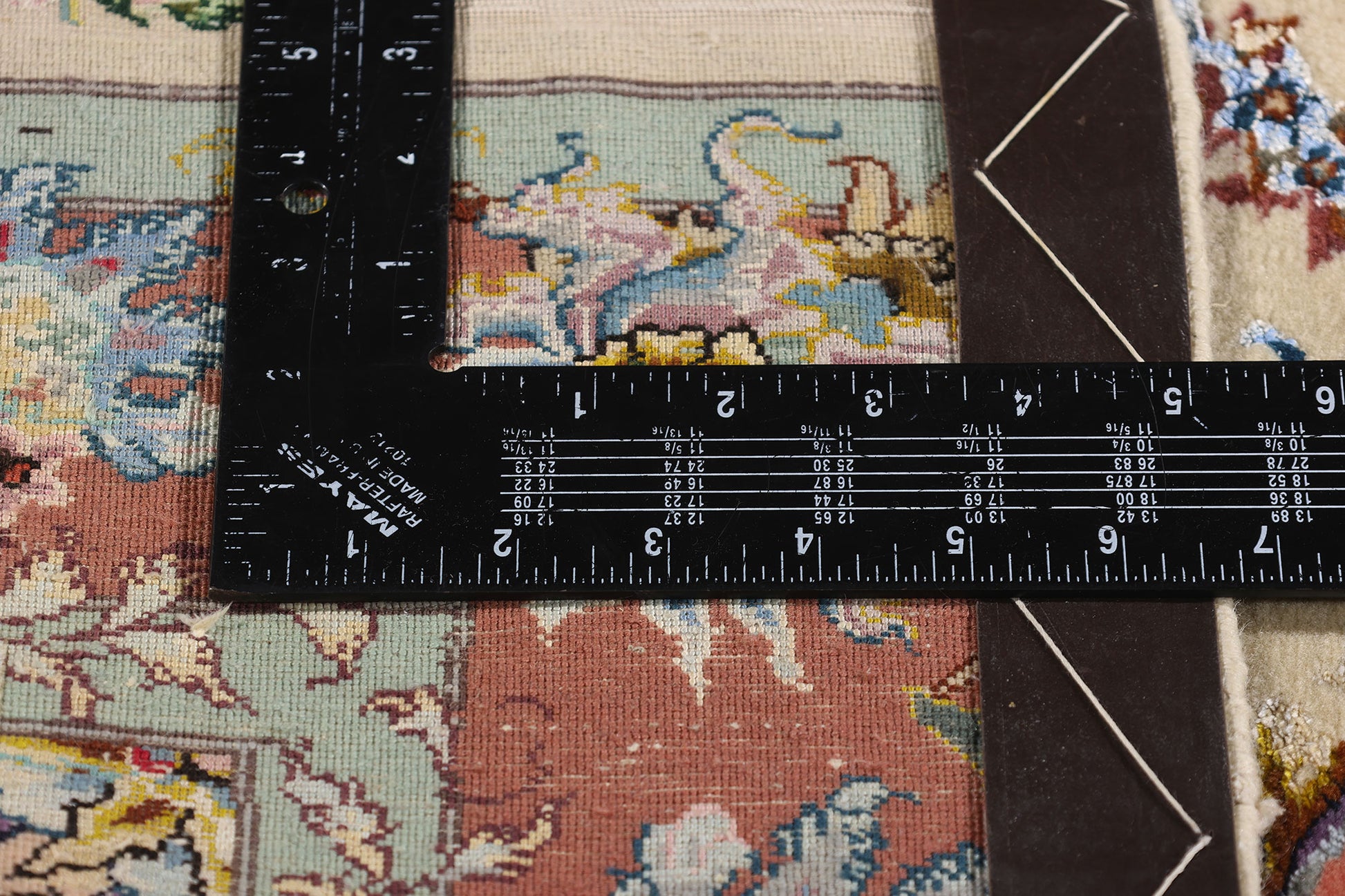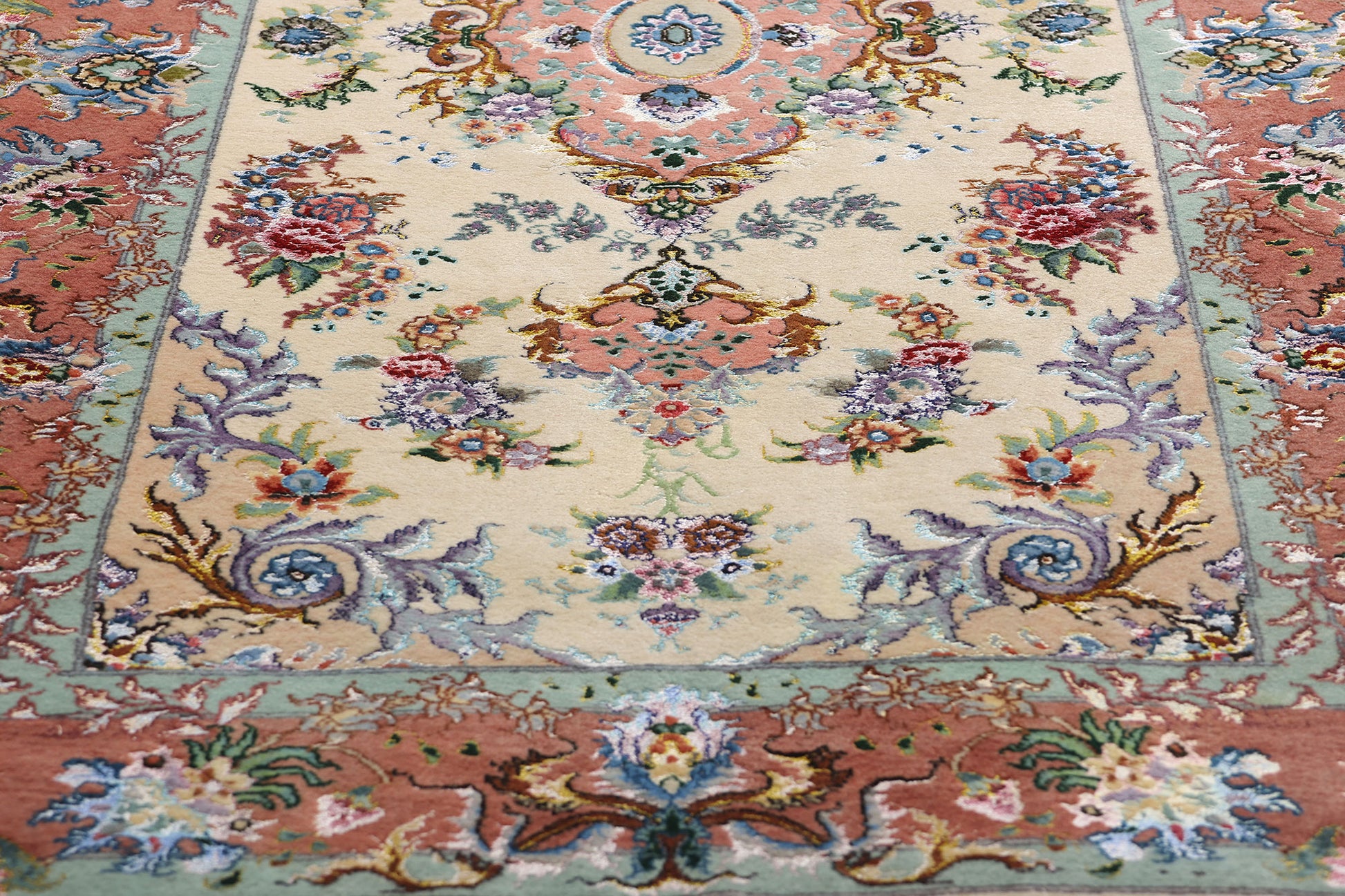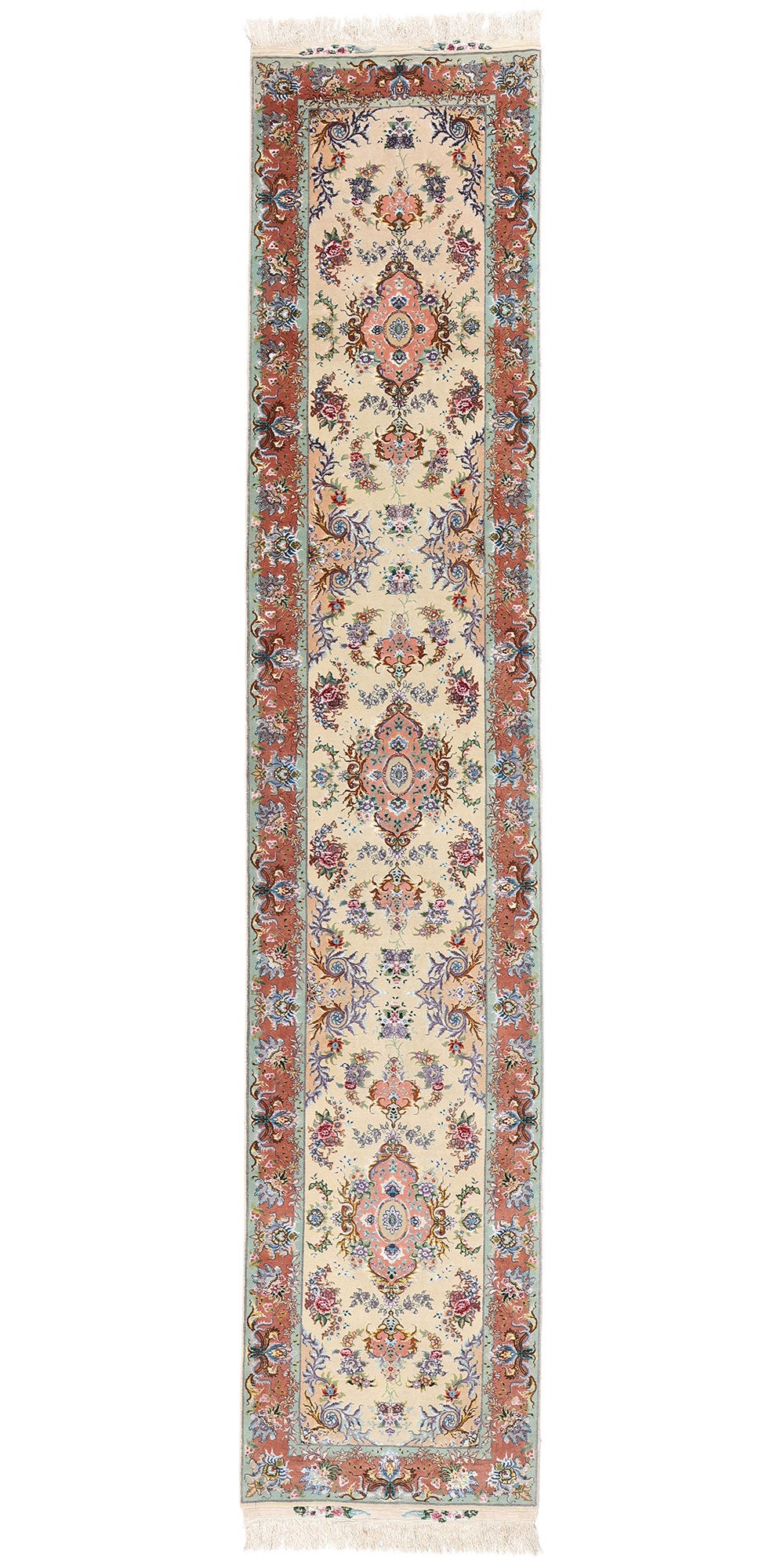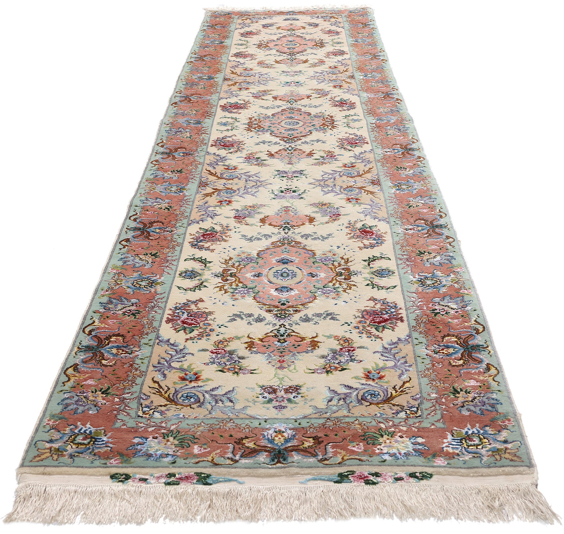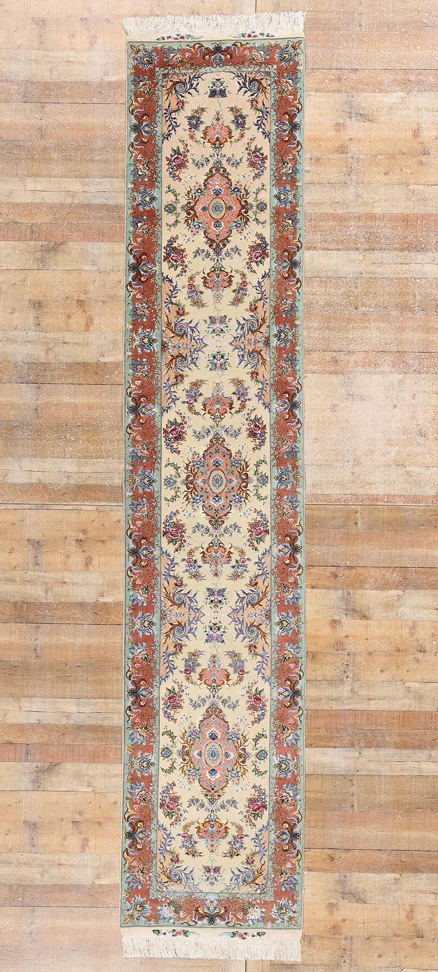 Surrounding the central field, the Tabriz carpet runner boasts delicate corner spandrels that mirror the complexity and beauty of the central medallions. These spandrels extend along the sides of the runner, embellished with acanthus vinery and an assortment of botanical elements, each rendered with precision and depth. The intricate interplay of colors and patterns within these spandrels adds a dynamic visual interest and highlights the skillful color blending that is characteristic of Persian Tabriz weavings.