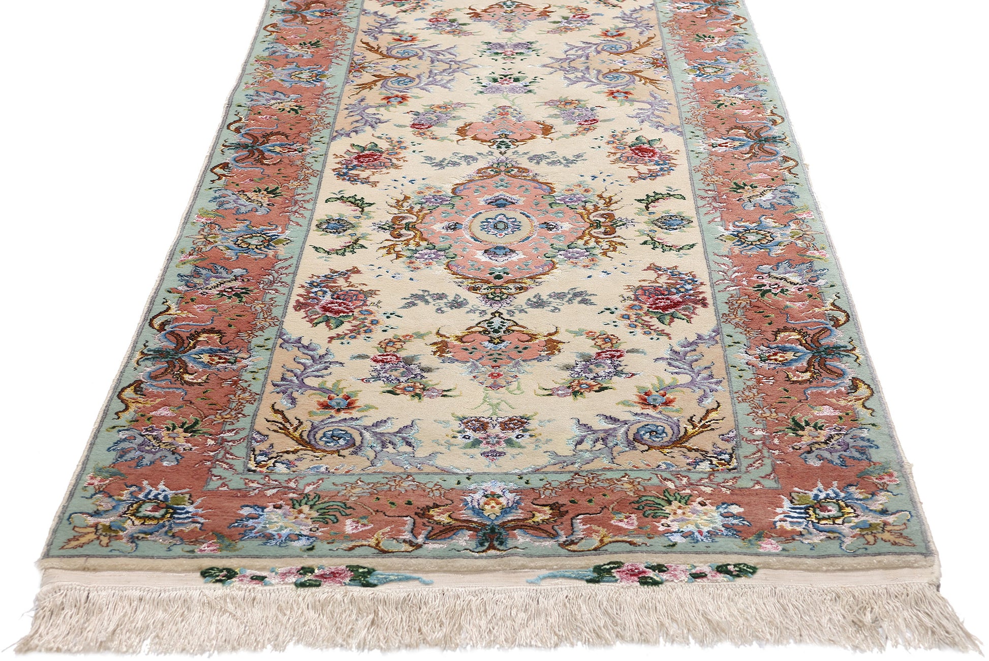 This exquisite hand-knotted wool and silk vintage Persian Tabriz runner is a stunning representation of classic Persian artistry and intricate craftsmanship. The Persian runner features a neutral, beige field that serves as a canvas for the sumptuous display of symmetrical floral medallions. These medallions, rich in earth-tones and pastel hues, are intricately outlined with finely detailed motifs, demonstrating the weaver's meticulous attention to detail and mastery of design. Anchoring the central composition are elegant floral motifs and ornamental accents that radiate a sense of luxury and opulence.