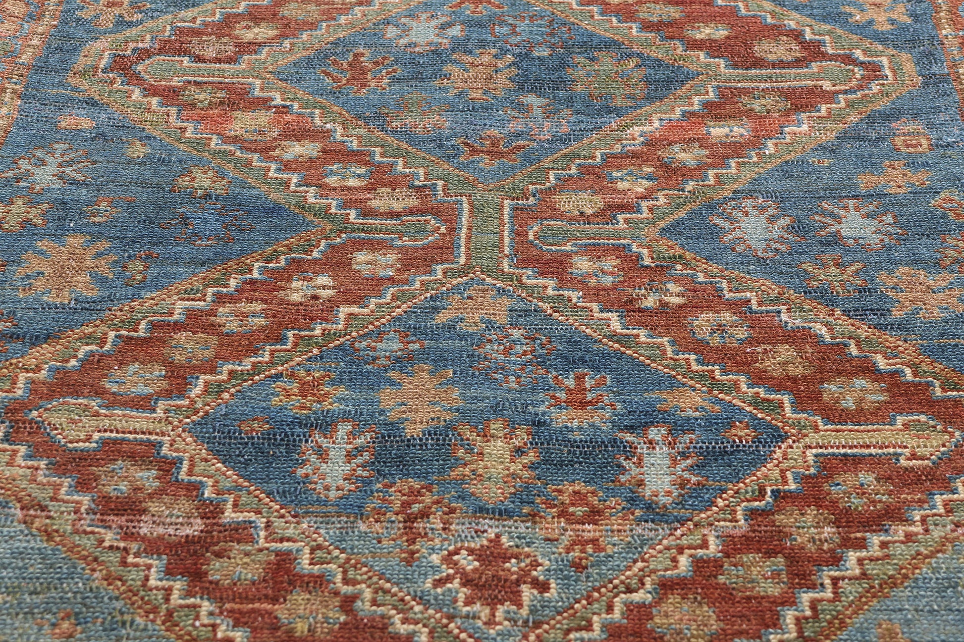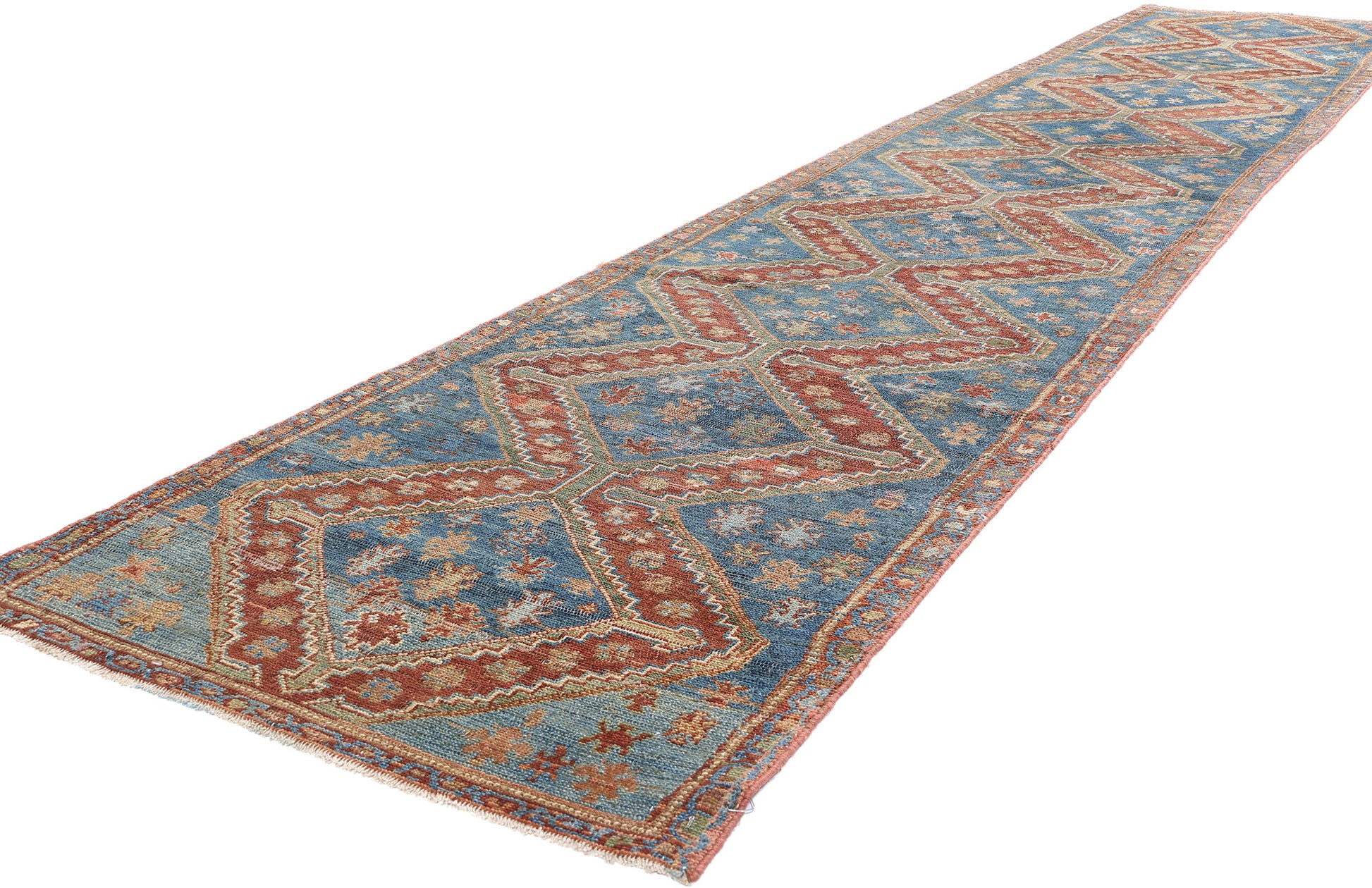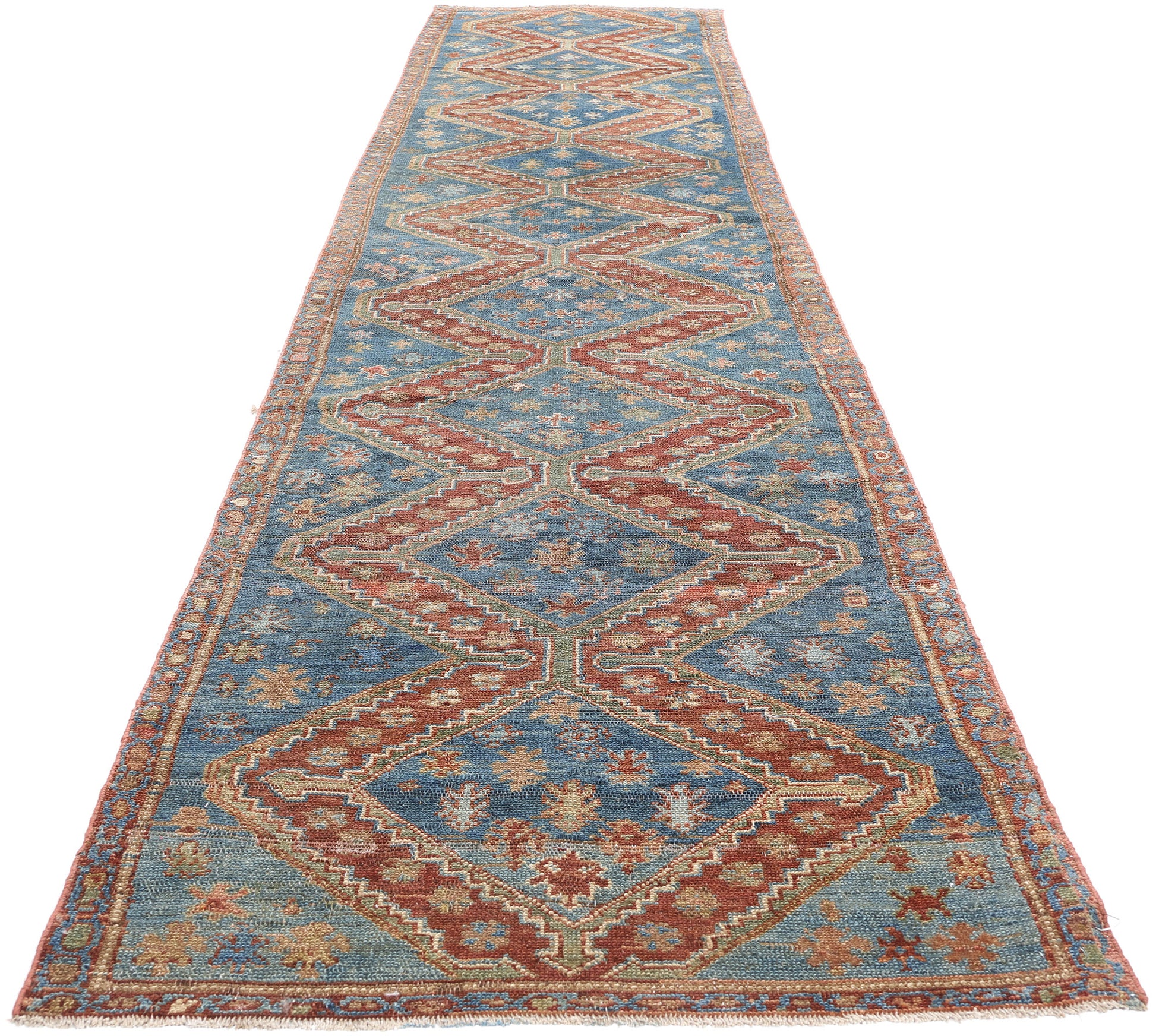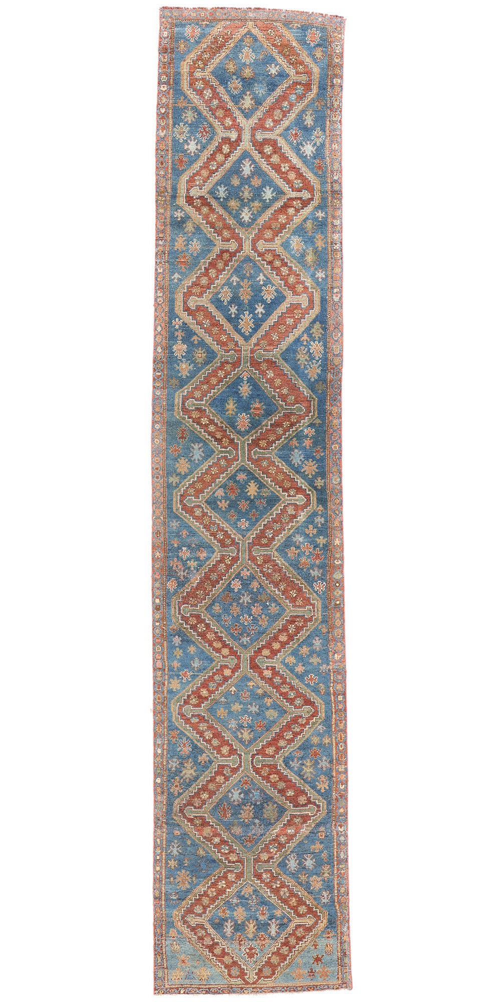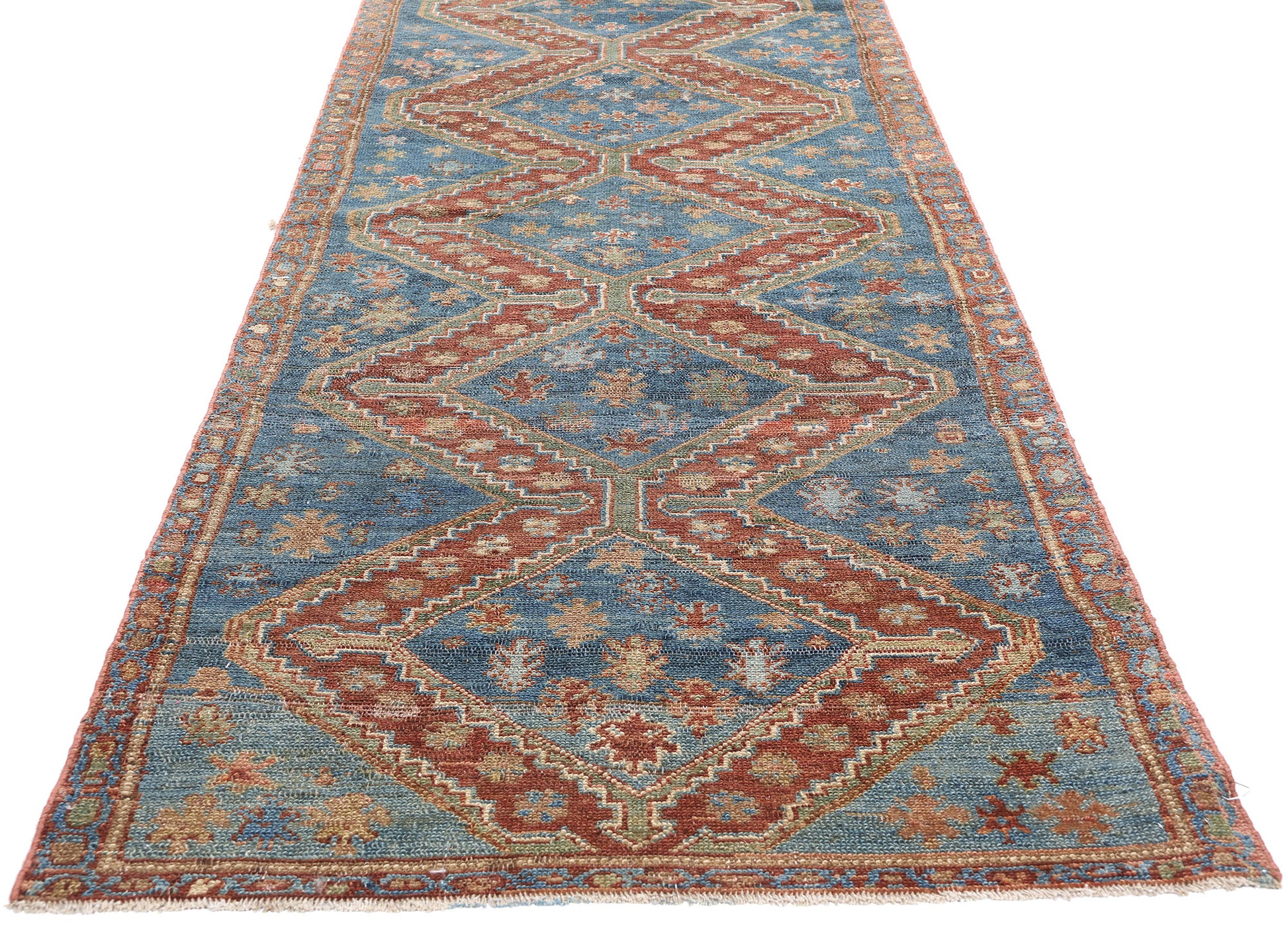 Framing this mesmerizing composition is a thin tribal border that serves as the perfect complement to the intricate field. Simple yet effective, the border encapsulates the central motifs, providing a cohesive structure that accentuates the runner’s elongated form. The interplay between the rug’s vivid hues, such as the earthy russet and the serene blue, creates a sense of movement and rhythm, guiding the eye along its length and highlighting its distinctive details.