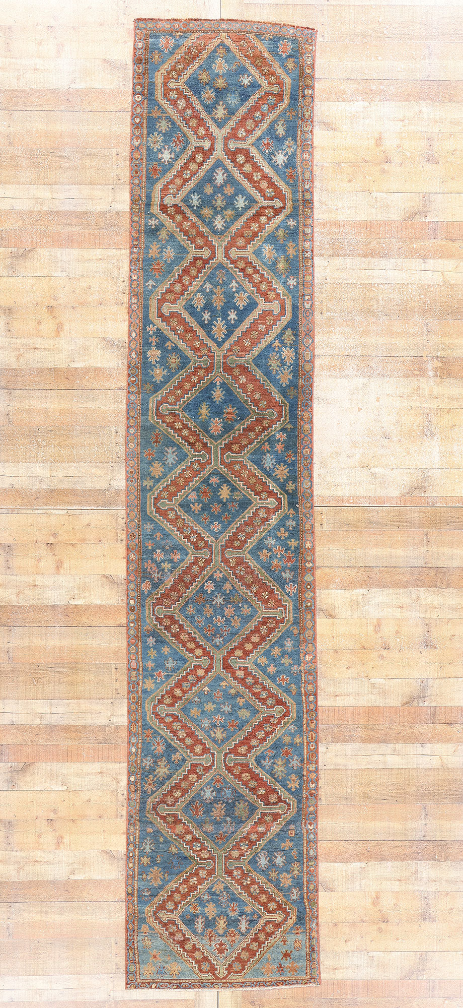 This hand-knotted wool distressed antique Persian Bakhtiari rug runner exudes tribal enchantment and relaxed refinement, a piece steeped in the history and artistry of the Bakhtiari weavers. Its antique wash lends it an aged beauty, softening the vibrant hues while preserving the intricate craftsmanship that has defined these rugs for centuries. Perfect for adding character to long spaces, this Persian carpet runner is a timeless representation of the Bakhtiari tribe’s nomadic ancestry.