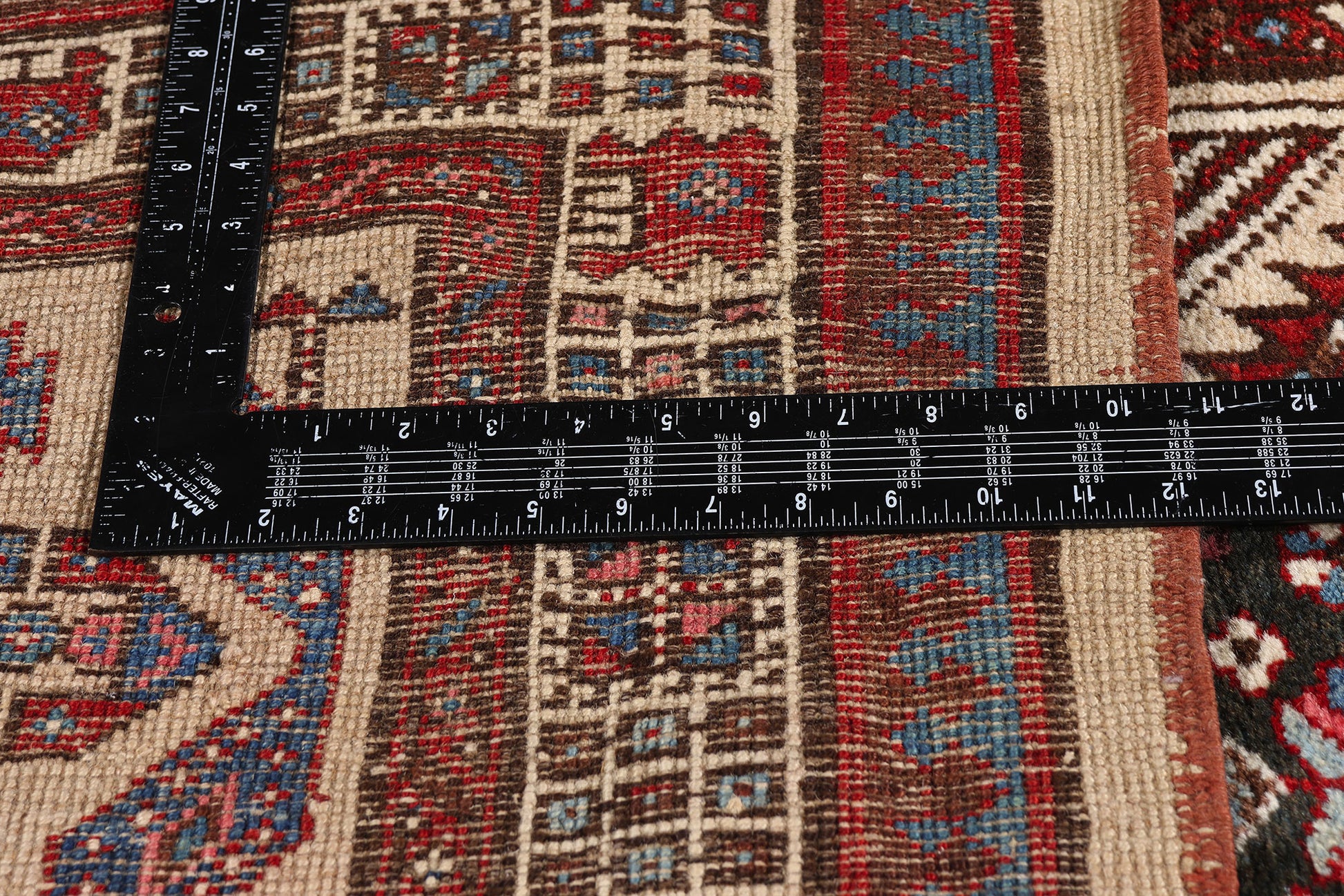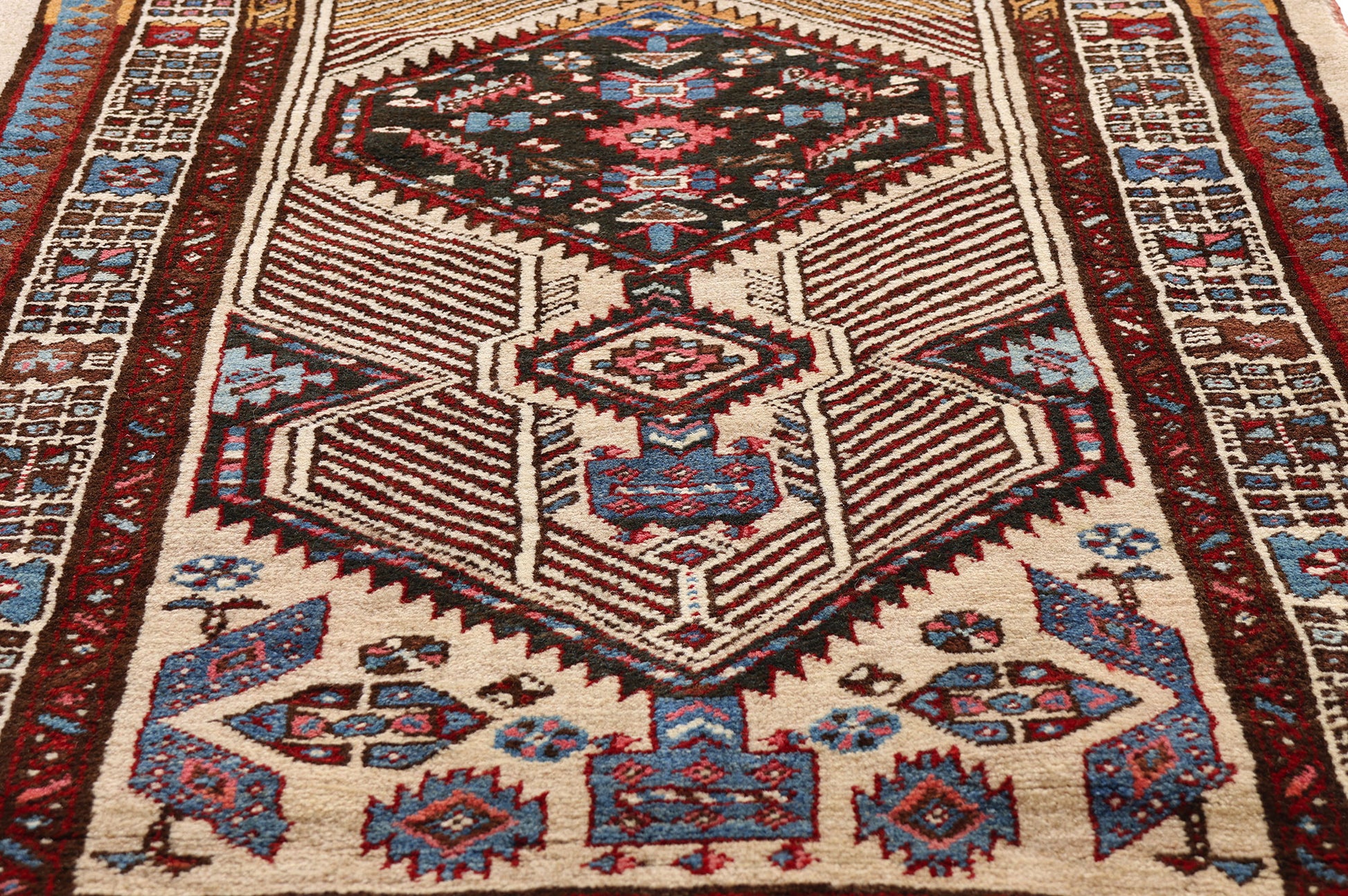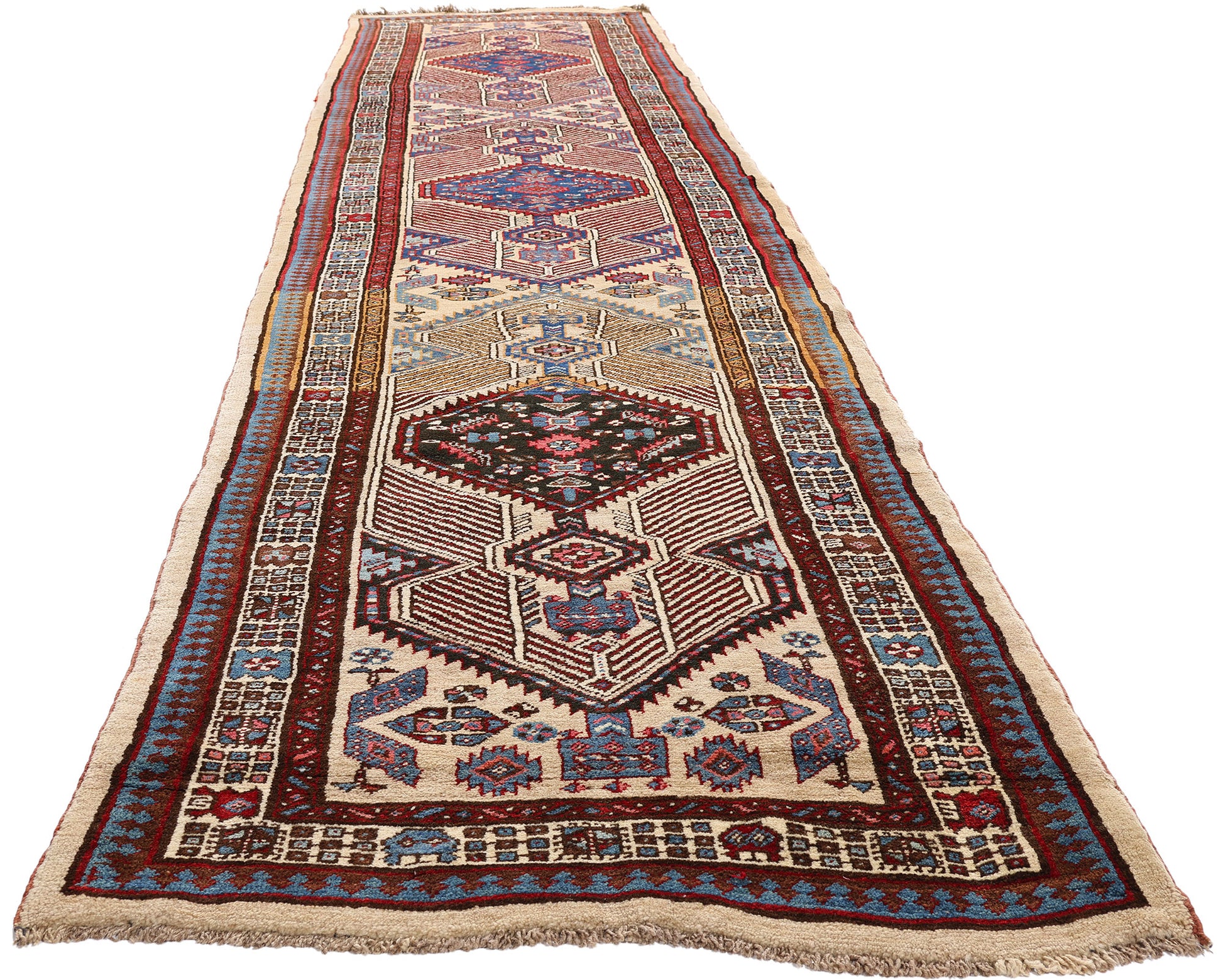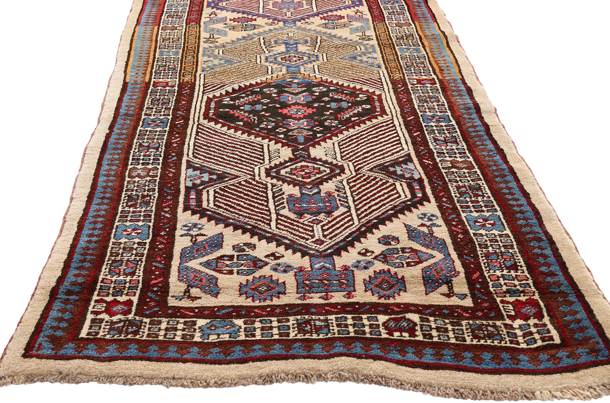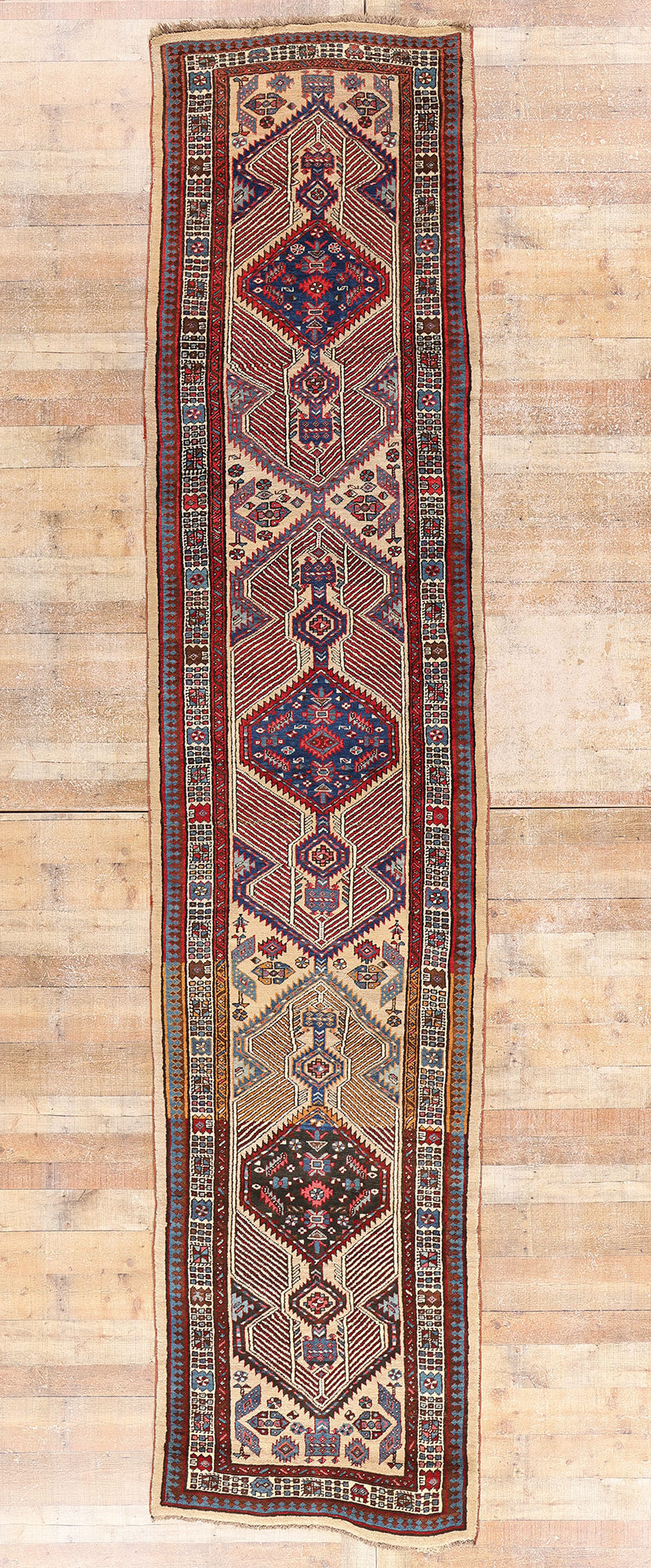 Framing the composition is a sophisticated geometric border, enriched with tribal precision and flanked by meaningful guard bands: an inner "running water" meander symbolizing continuity, and an outer crenellated fence border offering protection. These classic motifs—interlocking, layered, and deeply symbolic—create a sense of architectural elegance and timeless security. Radiating an air of couture craftsmanship and poetic history, this antique Persian Sarab runner speaks to those who seek not only beauty, but narrative, integrity, and soulful design in their interiors.