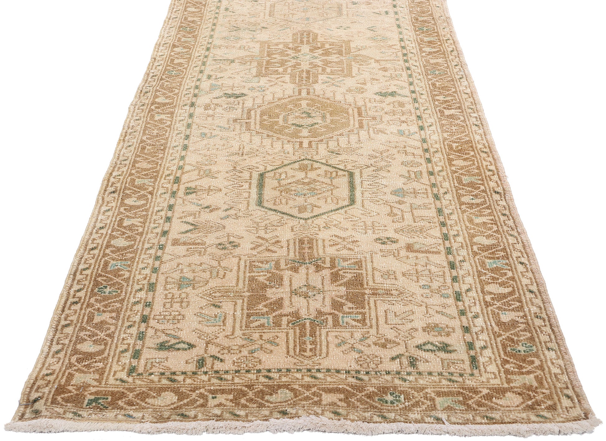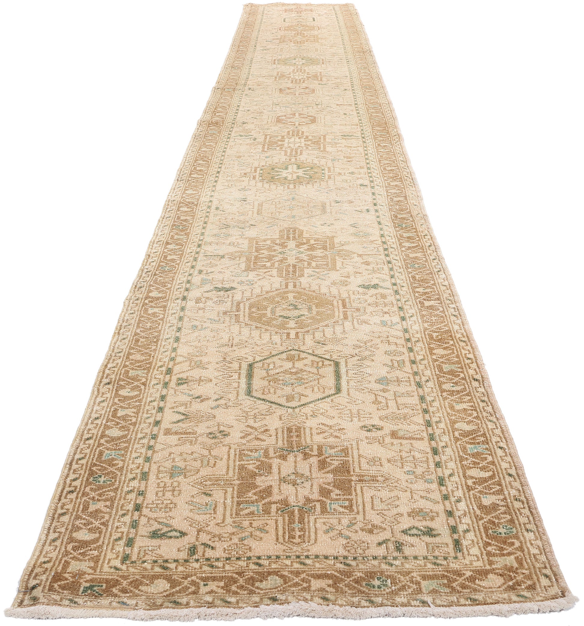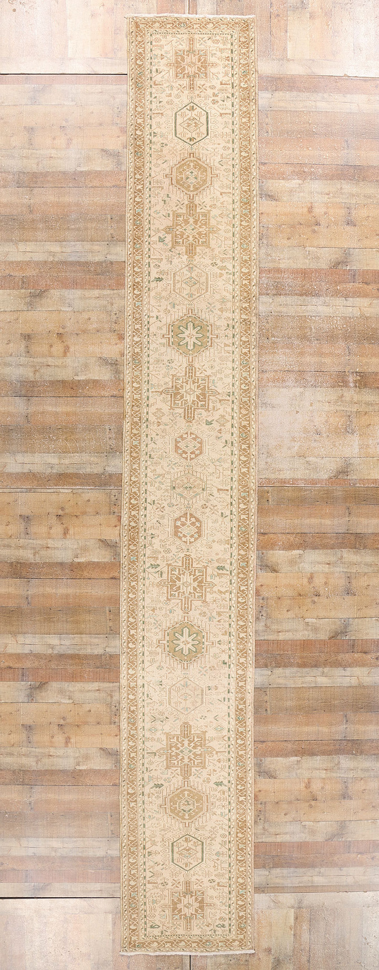 This hand-knotted wool distressed vintage Persian Karaja Heriz rug runner beautifully embodies the harmony of refined craftsmanship and rustic charm. The elongated design features a soothing neutral palette of beige, earthy browns, and soft green tones, offering a timeless and versatile aesthetic from the antique wash. With its distressed finish, this Heriz carpet runner radiates an understated elegance, telling the story of its nomadic origins and the enduring traditions of Persian weaving.