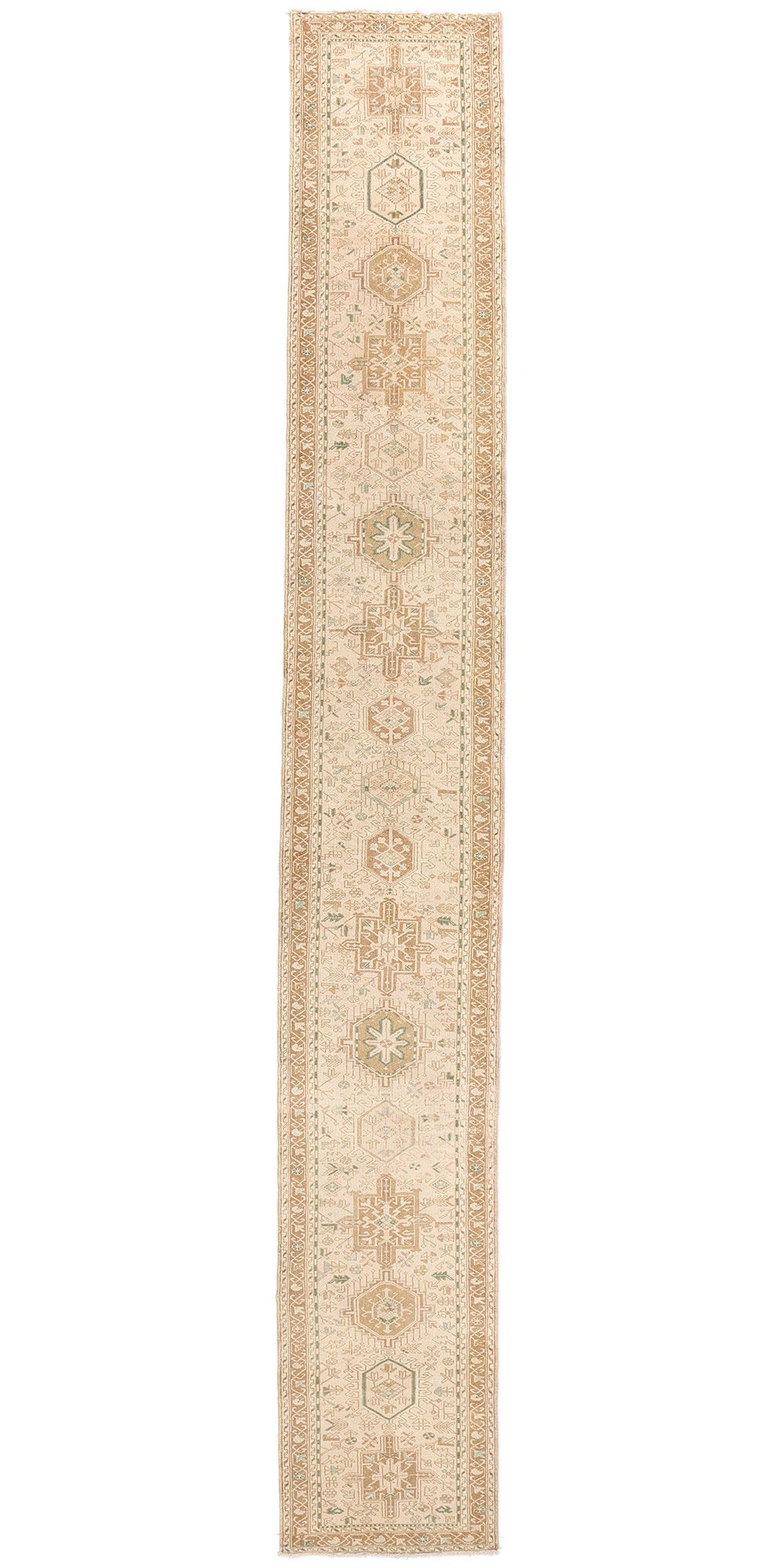 At its heart, the Persian Heriz runner is adorned with a series of square and hooked medallions, each distinct in its rectilinear design yet harmoniously connected by a central axis. These medallions, framed by smaller hexagonal guls, symbolize protection and unity, central themes in tribal art. Interspersed throughout the neutral field are rosettes, tree of life motifs, burdocks, stylized leaves, arrows, and quincunx patterns that reflect the weavers' deep connection to nature and their surroundings.