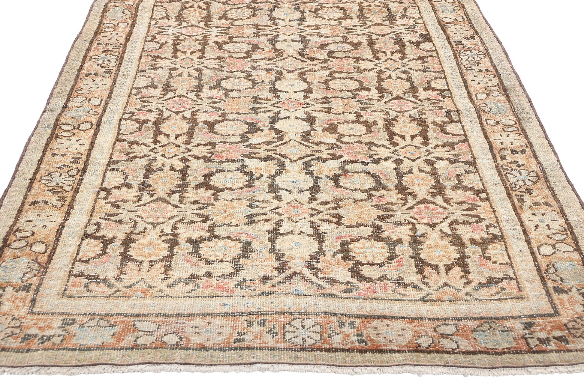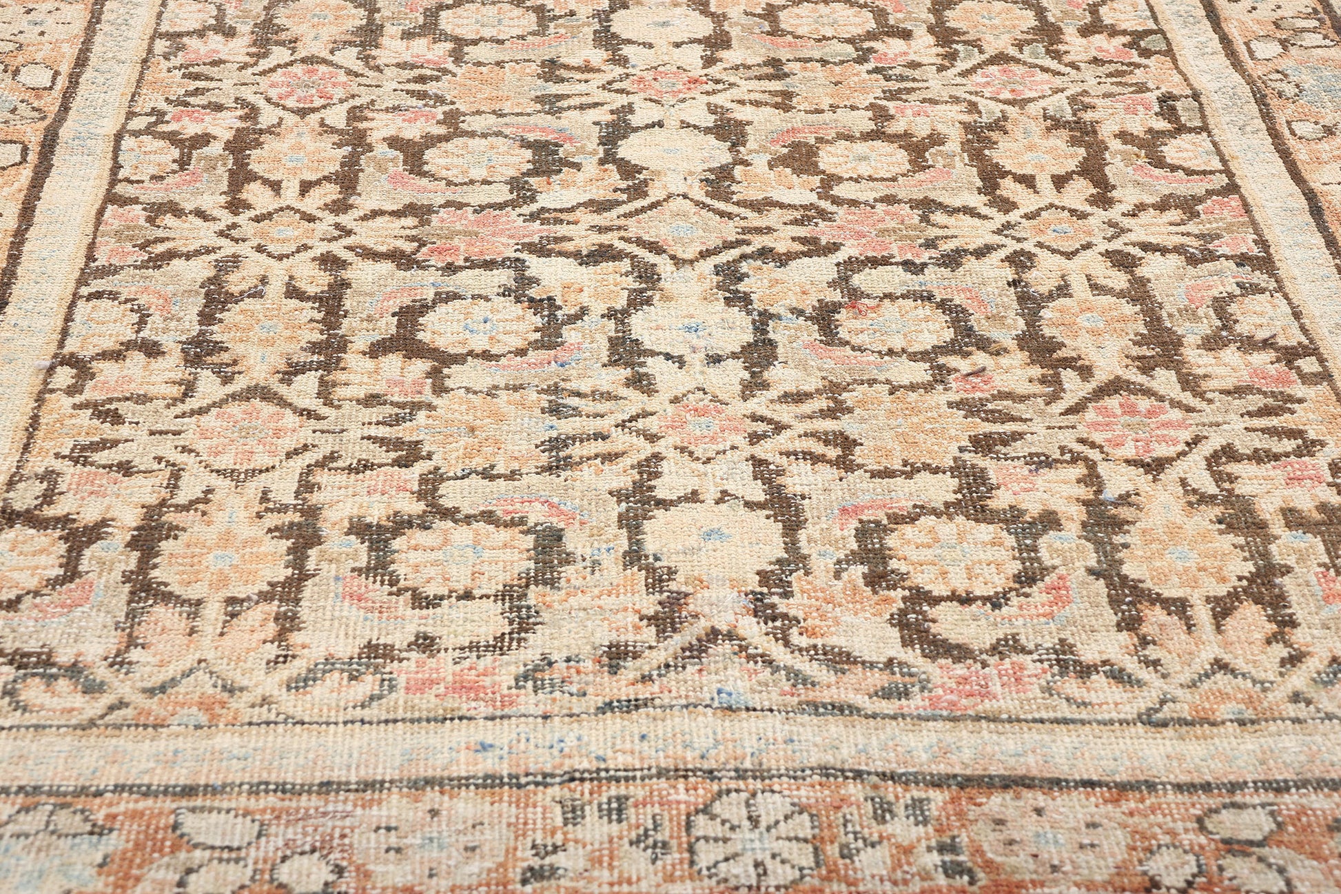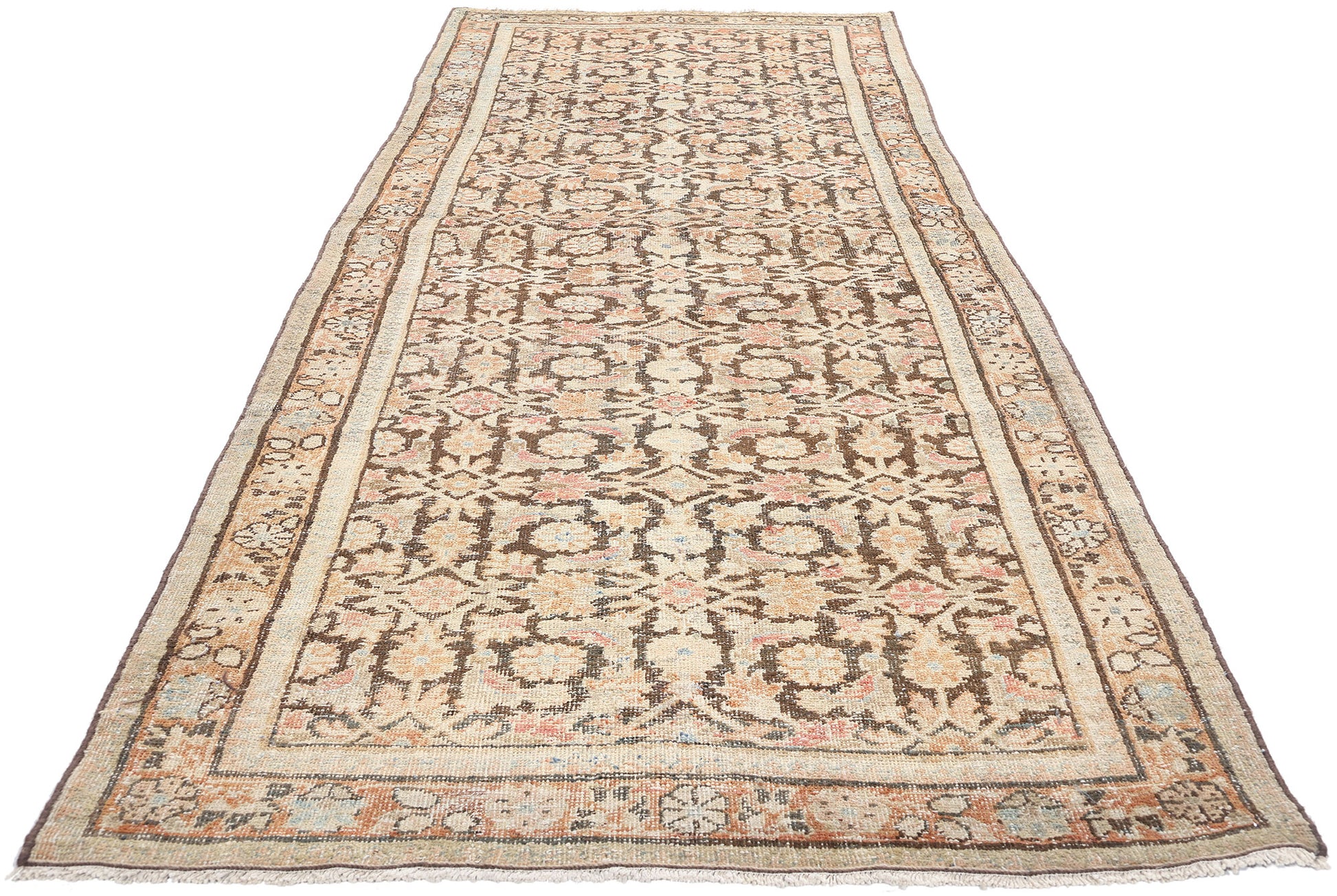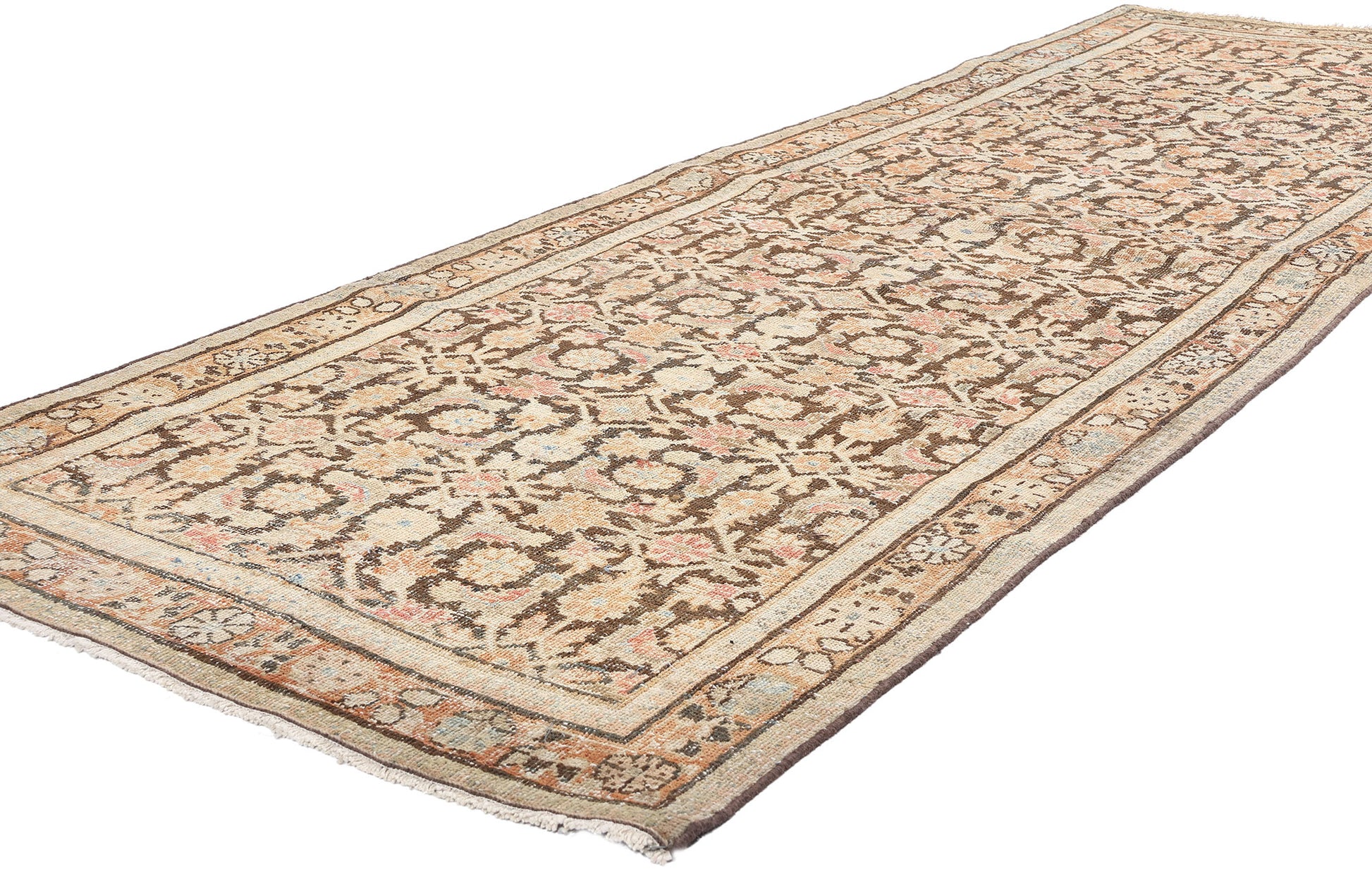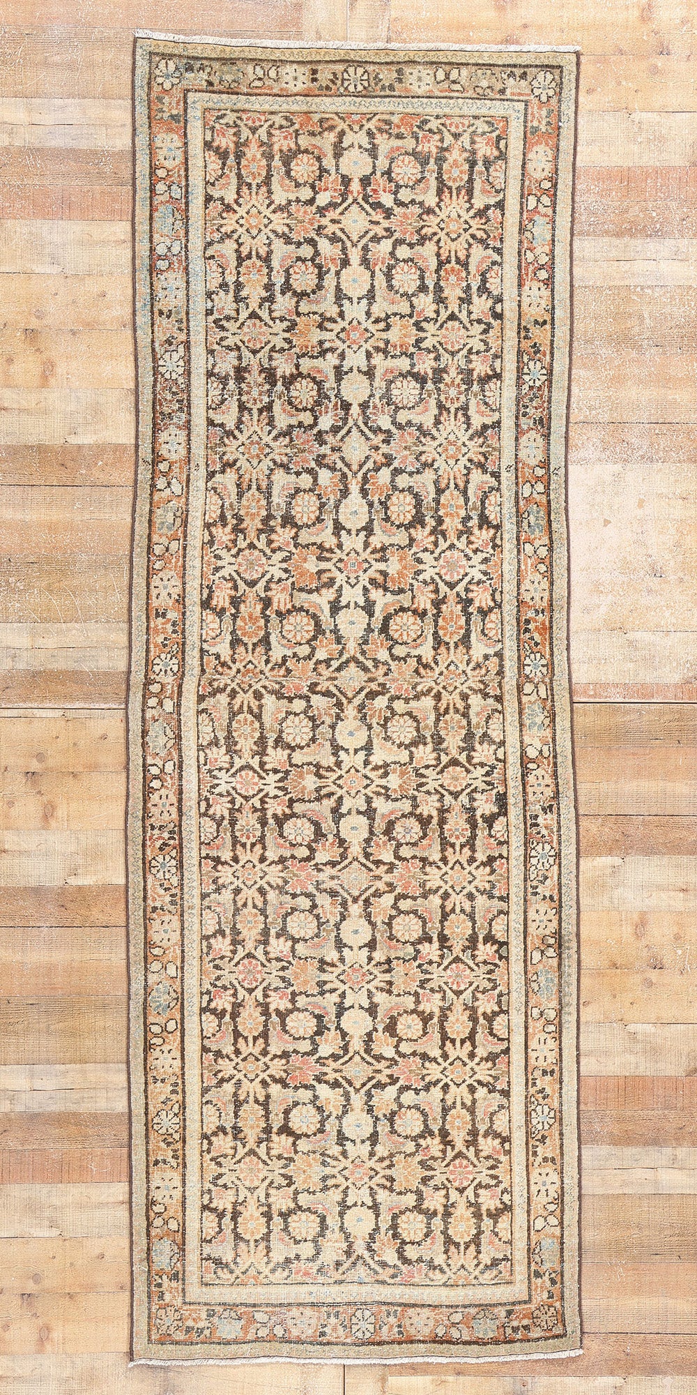 This hand-knotted wool distressed antique Persian Mahal rug runner is a stunning example of artisanal craftsmanship and relaxed refinement. The weathered dark brown field is adorned with an allover pattern of Herati motifs, whose intricate floral medallions and geometric flourishes create a rhythm of movement and balance. This esoteric design, steeped in cultural symbolism, evokes images of fish swimming beneath the surface of tranquil waters, offering a sense of serenity and connection to nature.