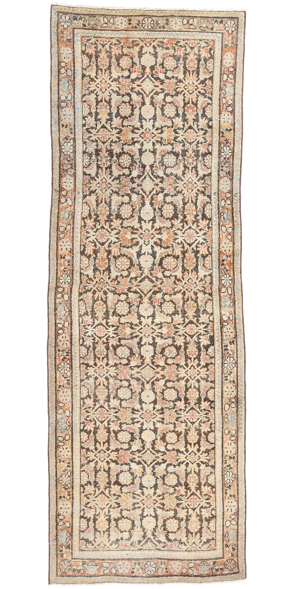 Framed by a beautifully detailed botanical border, this Persian carpet runner is further enhanced by inner and outer crenelated fence guard bands, adding structure and definition to the composition. The interplay of these elements creates a harmonious balance between the organic and geometric, making it as visually compelling as it is historically significant. The border’s delicate floral motifs provide a cultivated contrast to the lovingly time-worn central field, creating an aesthetic that is both sophisticated and approachable.