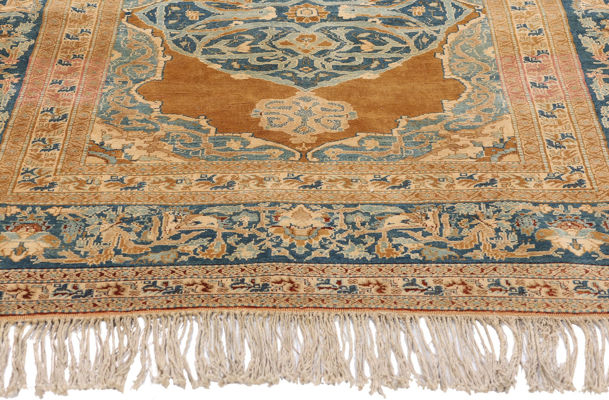 Finally, the artistic integrity and structural composition of the rug are fortified by triple layers of inner and outer floral meander guard bands. These bands are intricately detailed, enhancing the luxurious feel of the rug while securing the elaborate patterns within a meticulously defined boundary. Together, the harmonious interplay of the medallion, spandrels, and borders in this Haji Jalili Tabriz rug encapsulates centuries of weaving mastery, making it not only a magnificent floor covering but also a profound expression of historical artistry and cultural legacy.