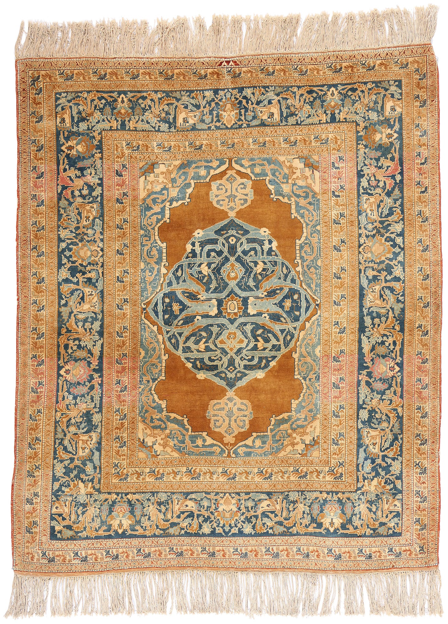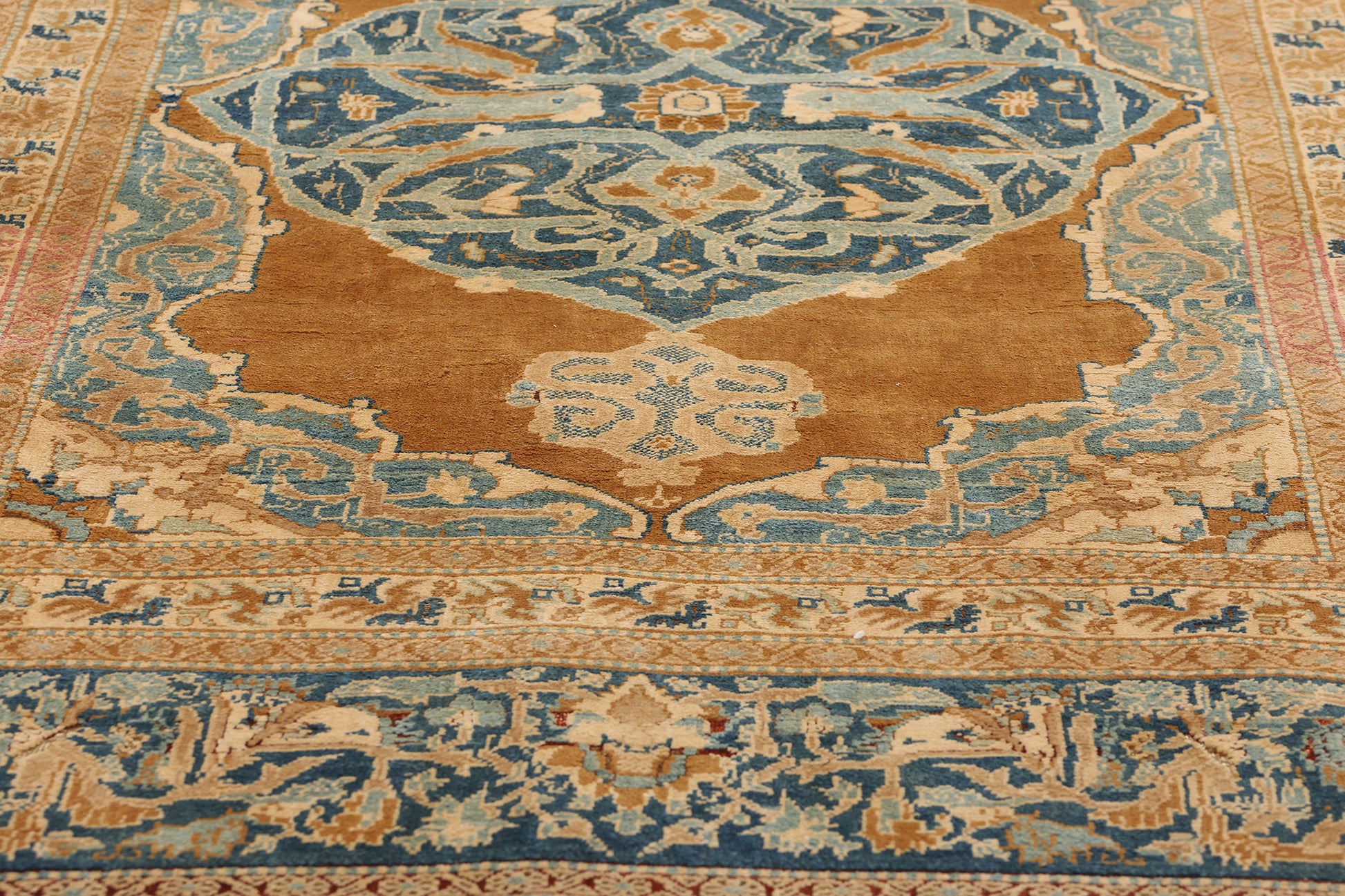 This exquisitely crafted cotton and silk antique Persian Tabriz rug, attributed to the renowned workshops of Haji Jalili, showcases the pinnacle of classical weaving traditions combined with unmatched artistry. The central medallion, resplendent in navy blue and embellished with intricate sky blue arabesque contours, serves as the stunning visual core of the rug. Anchored by elegant ram's horn pendants, the medallion seems to float against the open, subdued brown field, offering a dramatic contrast that captivates and draws the viewer into the depths of its design. This emblematic feature exemplifies the infinite beauty and sophisticated grace inherent in Persian rug-making.