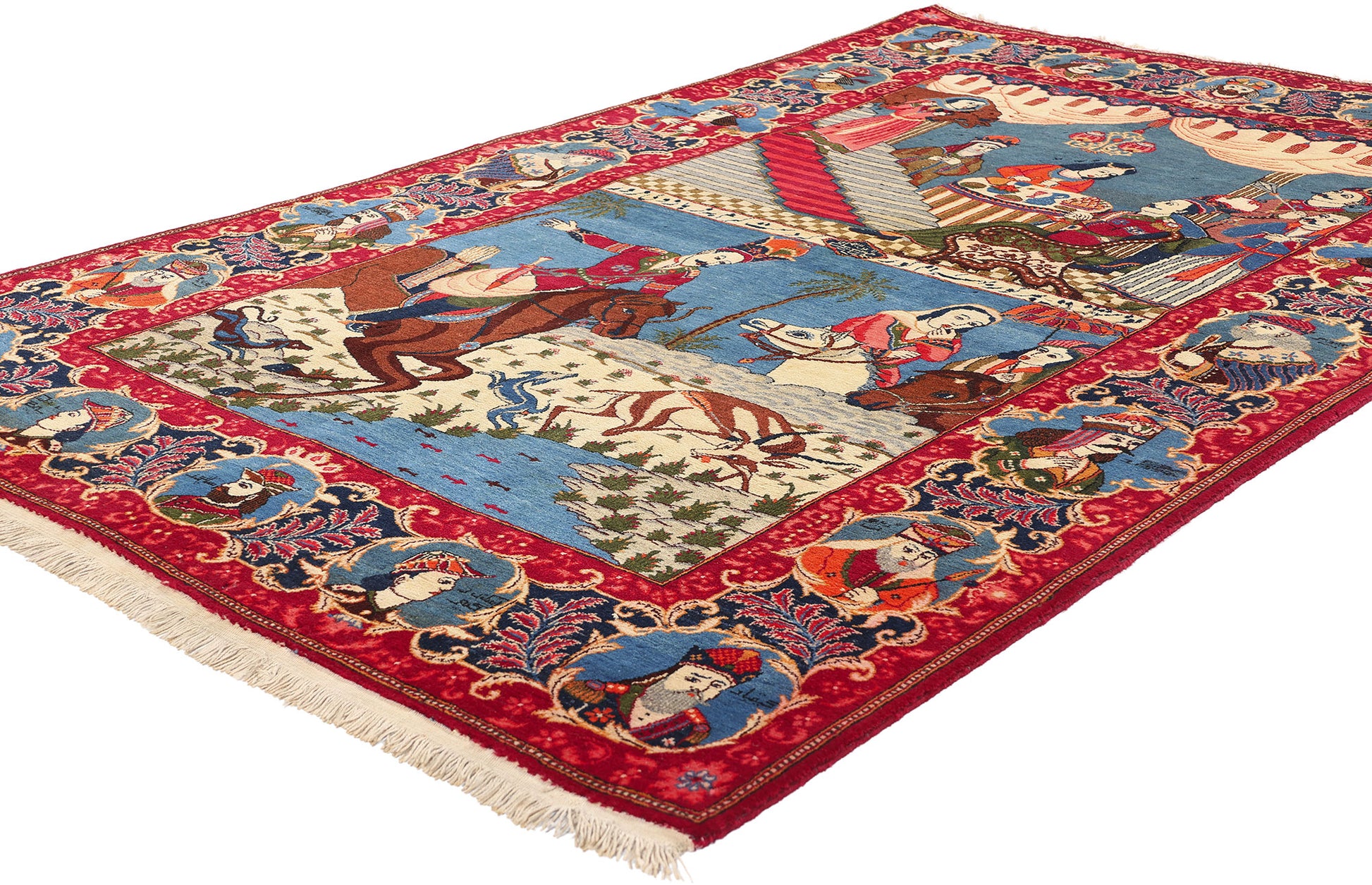 This hand-knotted wool antique Persian Kashan pictorial rug is a captivating narrative woven into art, depicting the legendary King Bahram Gur, a celebrated figure in Ferdowsi’s epic Shahnameh. Through its intricate imagery and poetic inscriptions, this Kashan tableau carpet tells a timeless story of skill, humility, and redemption, accompanied by a profound moral. A masterpiece of Persian craftsmanship, this pictorial rug seamlessly combines artistry and storytelling, reflecting the cultural depth and literary brilliance of Persian traditions.