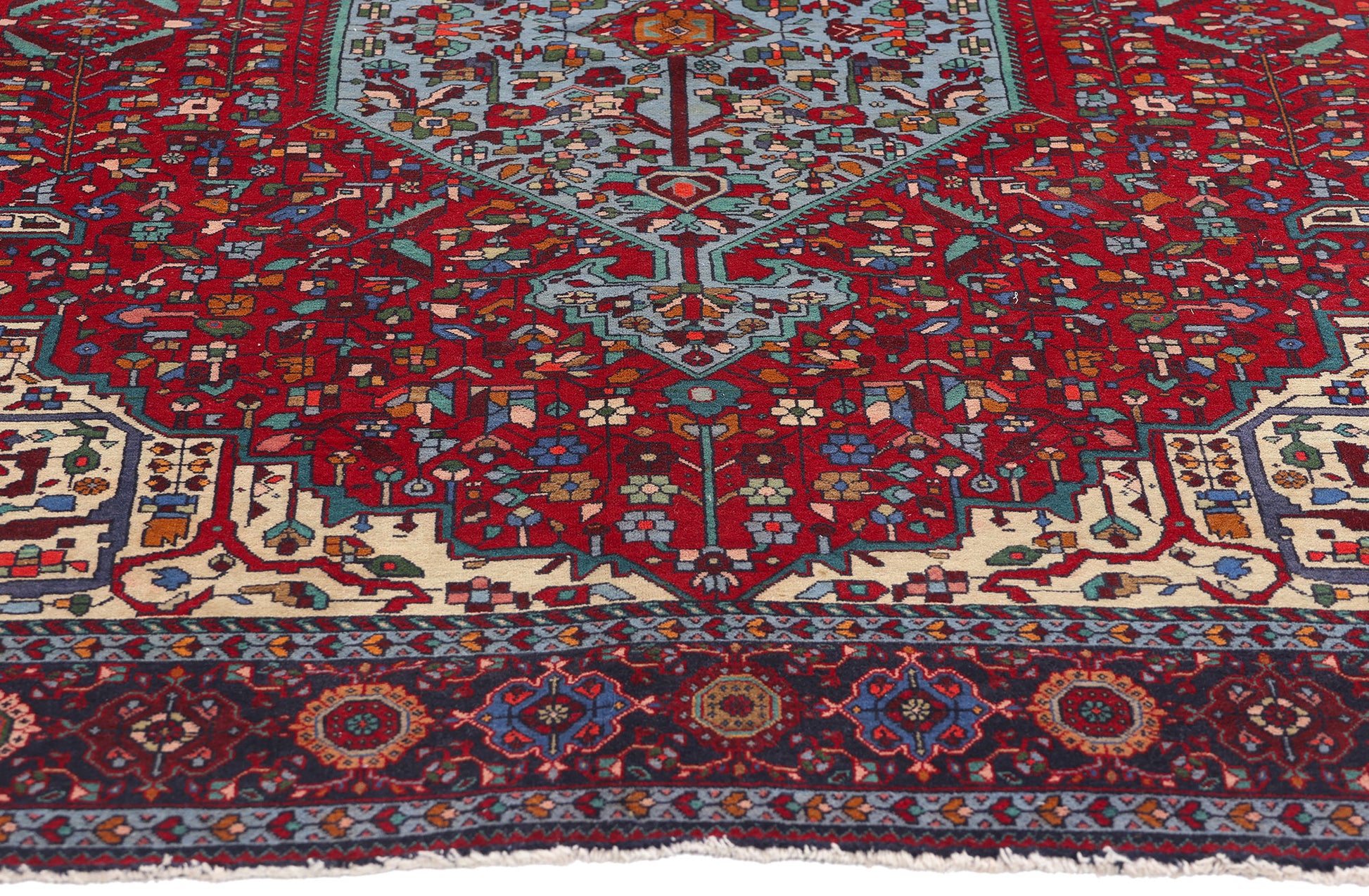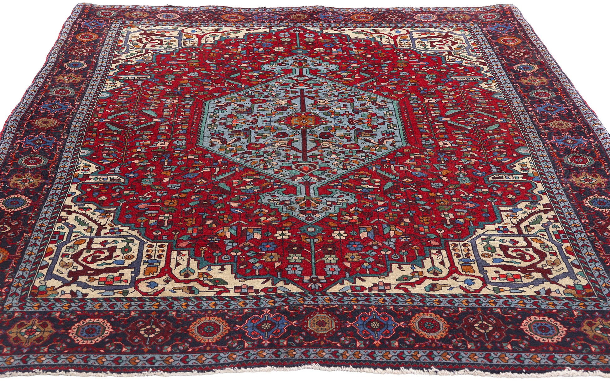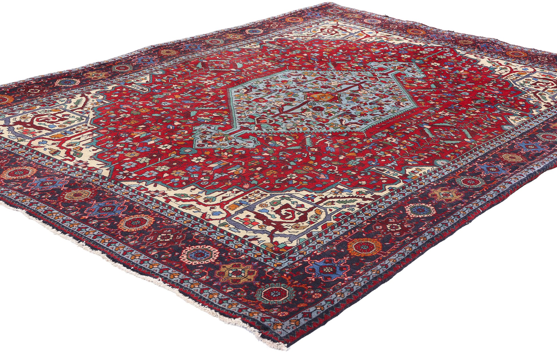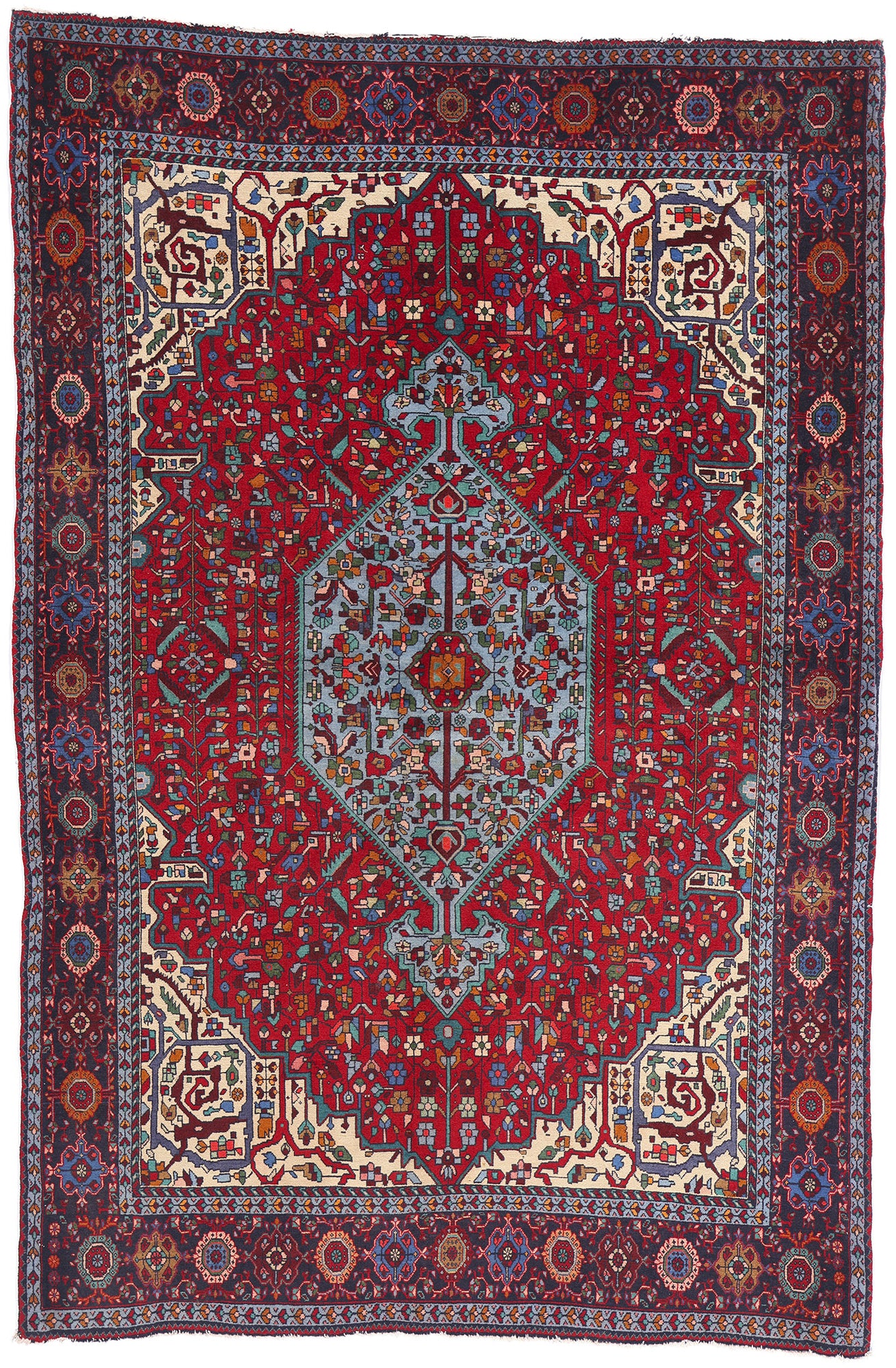 This hand-knotted wool vintage Persian Farahan rug masterfully combines timeless elegance with a refined sense of formality, drawing inspiration from the traditional aesthetics associated with Ivy League sensibilities. At its heart lies an intricate sky-blue central medallion, gracefully anchored by trefoil pendants at either end, radiating balance and harmony. The saturated red field serves as the perfect canvas for an allover pattern of stylized florals, rhythmic foliage, and rectilinear botanical motifs, creating a dynamic interplay of organic and geometric elements. The ivory corner spandrels mirror the central design, adding symmetry and visual cohesion to the overall composition.