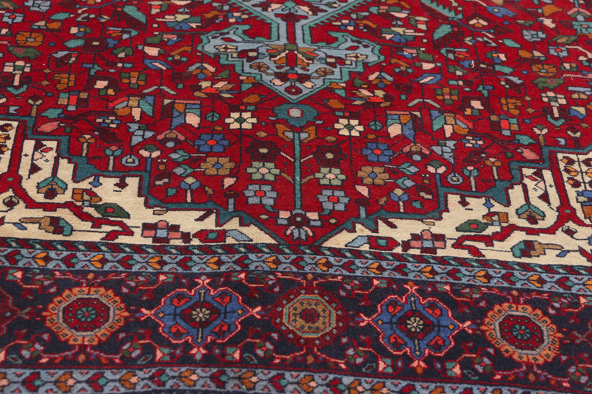 The richly decorated borders of this Farahan rug enhance its heavily detailed design. A navy blue rosette border encloses the field, adorned with delicately rendered floral motifs that add depth and dimension. This main border is flanked by inner and outer guard bands in a soft sky-blue hue, each featuring floral buds that provide a gentle contrast to the rug’s bold red and navy tones. The finishing touch is a striking sawtooth guard stripe in red and navy blue, introducing an additional layer of structure and precision to the design.