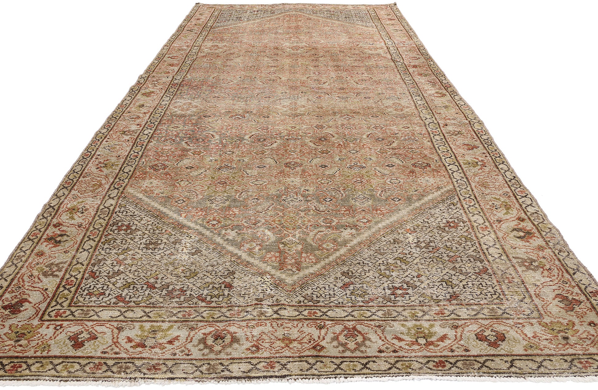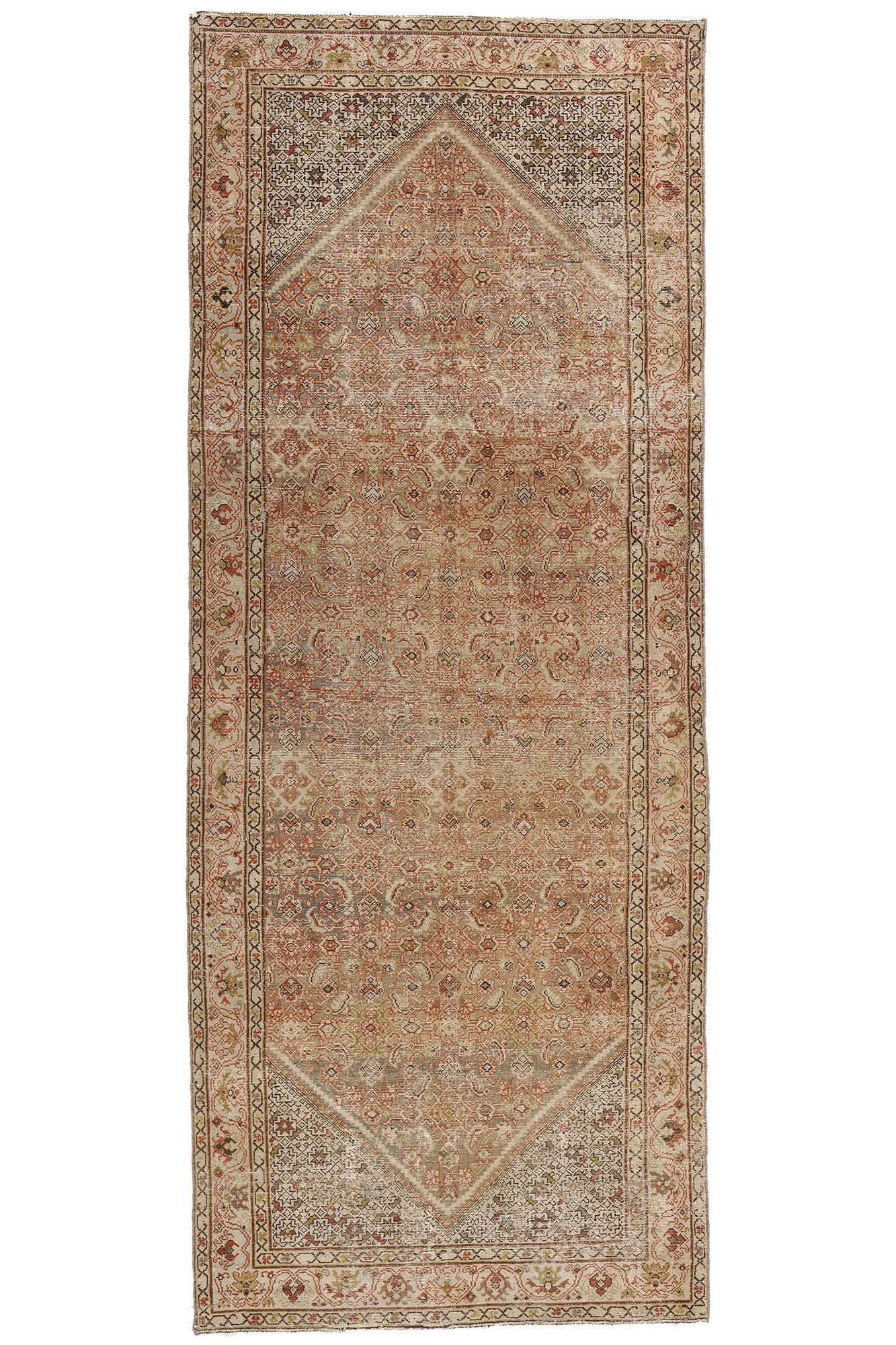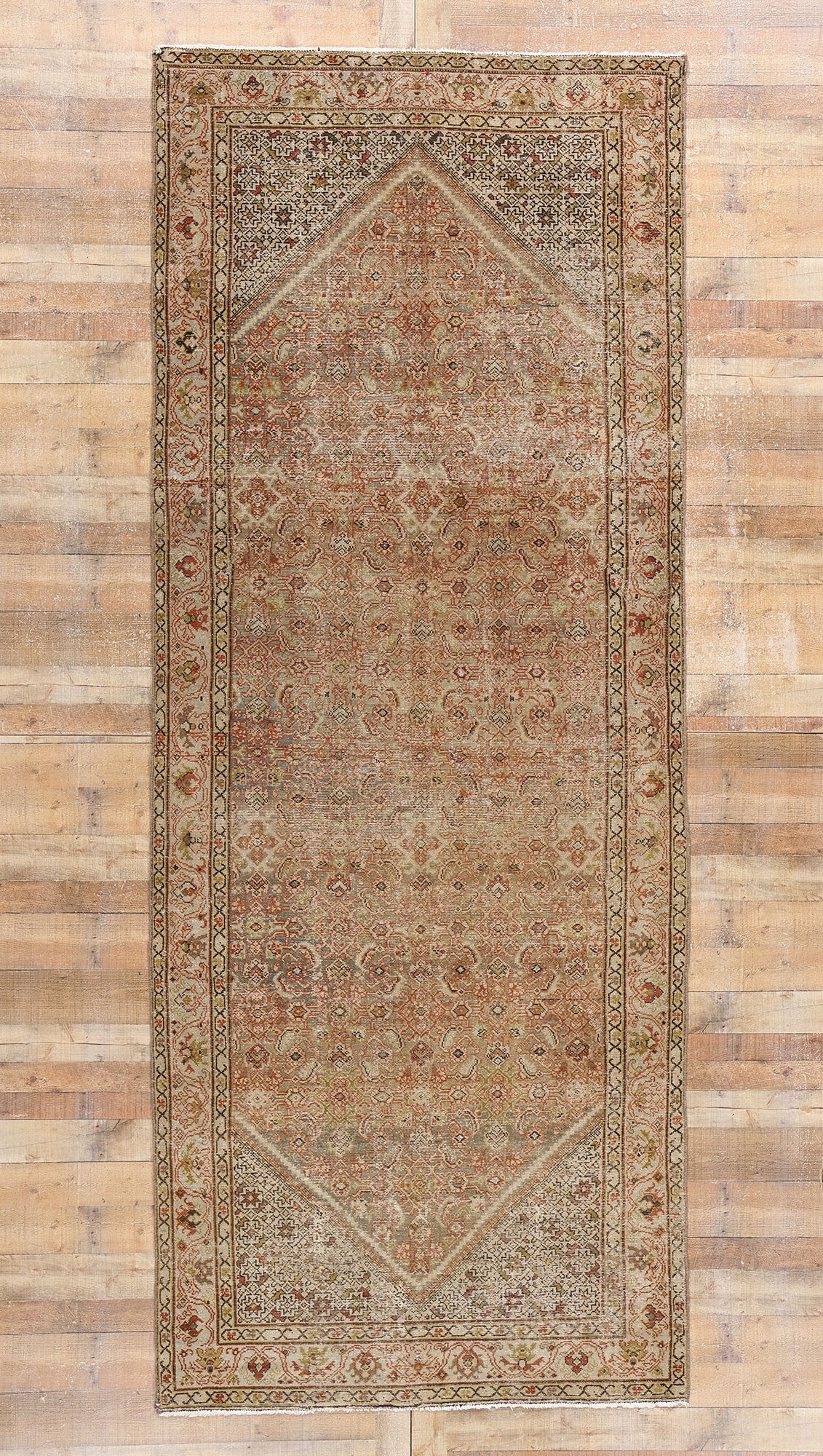 This captivating Persian gallery rug displays an allover pattern composed of Herati motifs, which symbolize prosperity and protection. The Herati design features a central flower surrounded by diamond shapes and curling leaves that resemble fish swimming beneath the surface of water—a motif deeply rooted in Persian symbolism. This rhythmic arrangement dances across a soft brown background, exuding understated sophistication while preserving a connection to its cultural heritage.