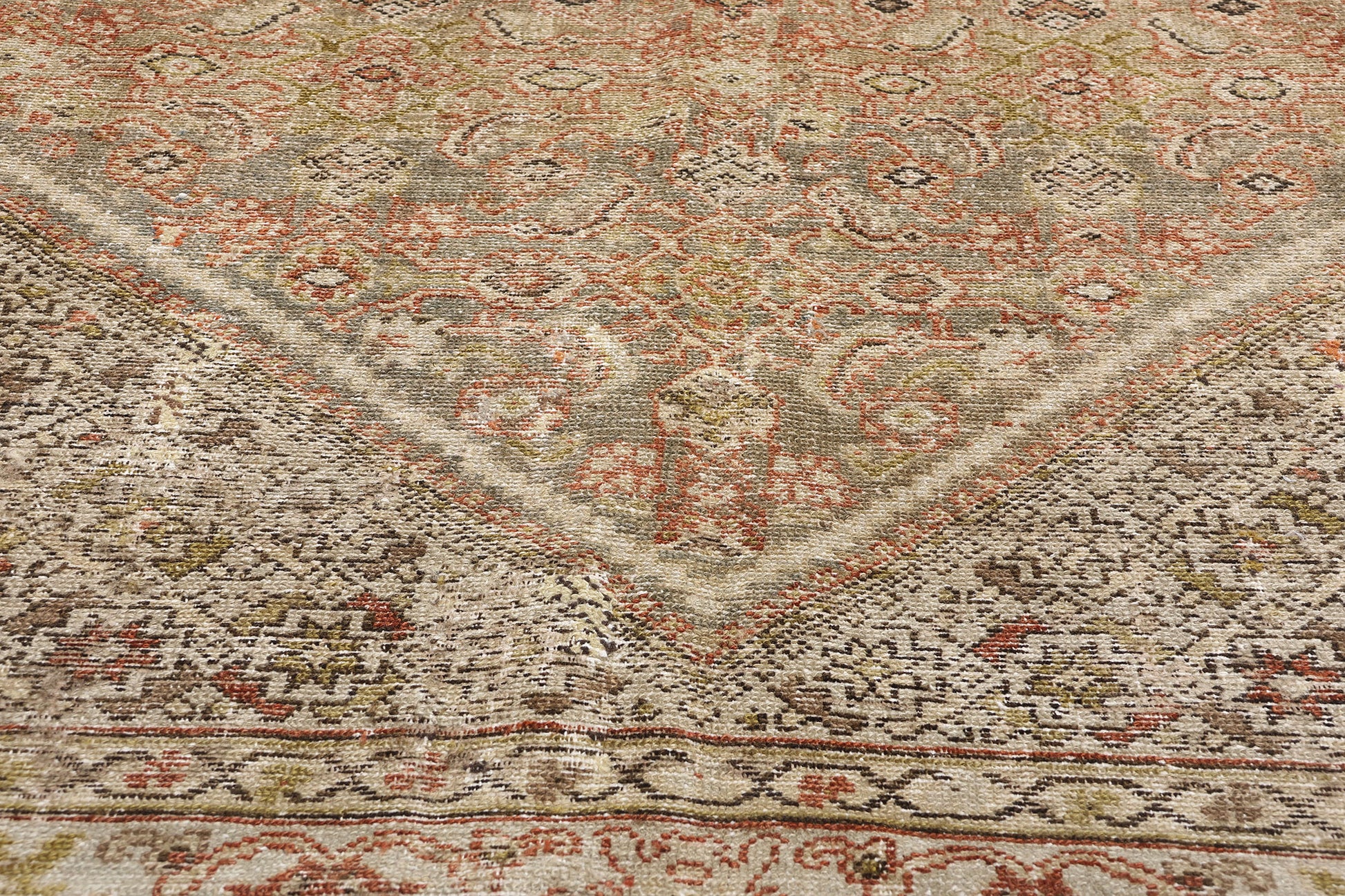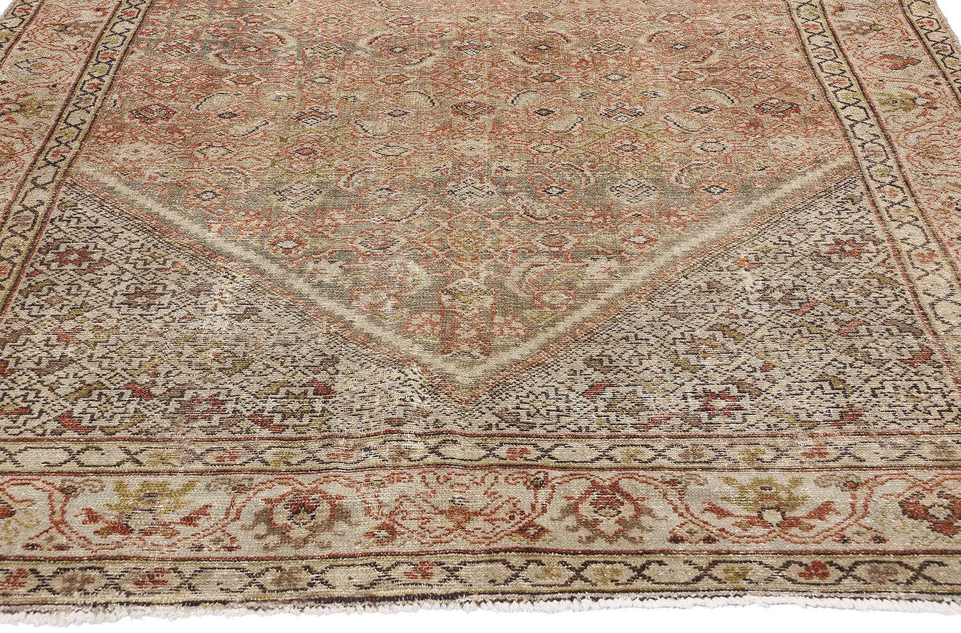 The corner spandrels add another layer of visual intrigue, adorned with repeating eight-pointed stars on a light gray backdrop. These celestial motifs convey harmony and guidance, elevating the rug's artistry and enhancing its serene appeal. The distressed Persian rug is framed with a classic border enriched by an inner and outer floral meander guard band, which adds a touch of decorative detail while seamlessly enclosing the central field.