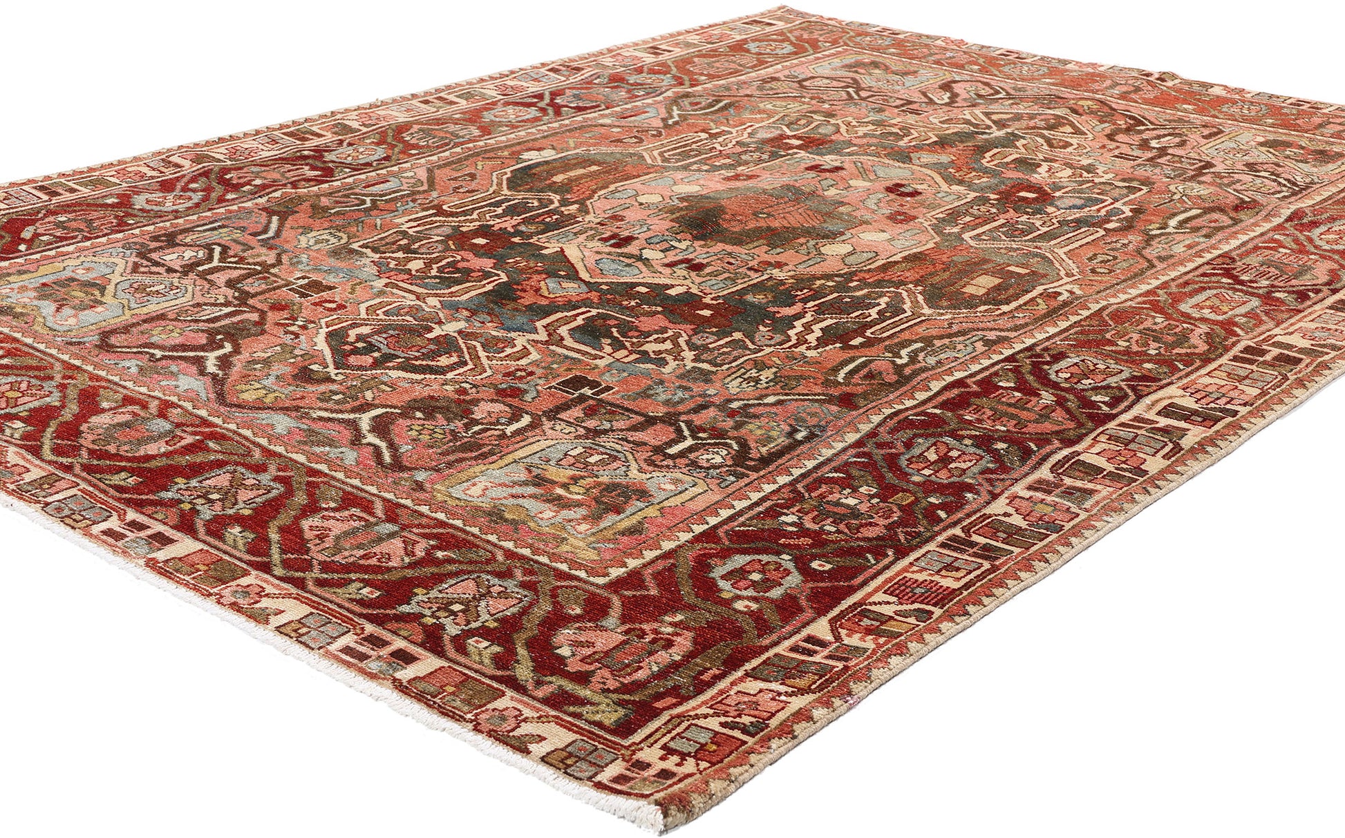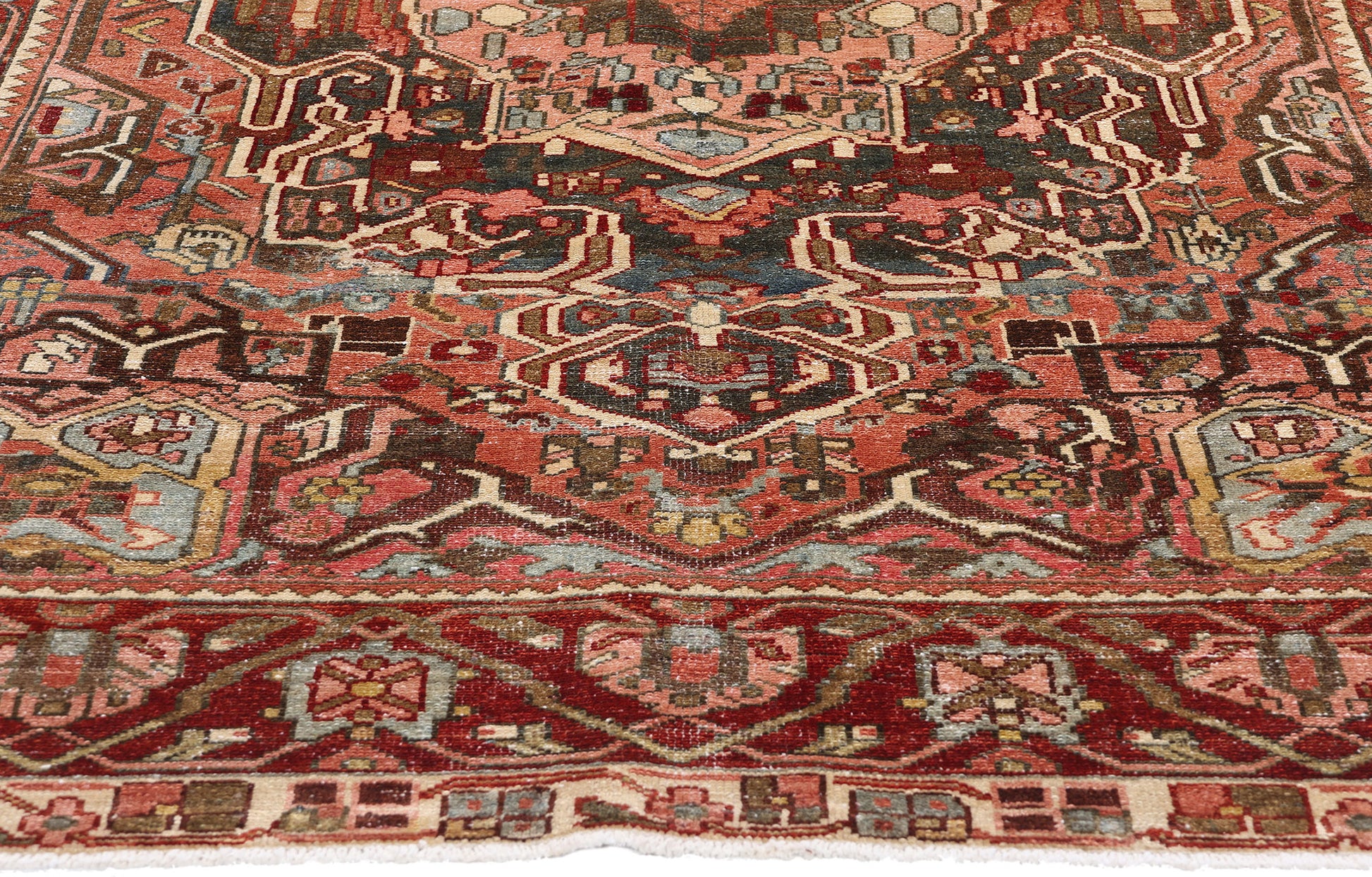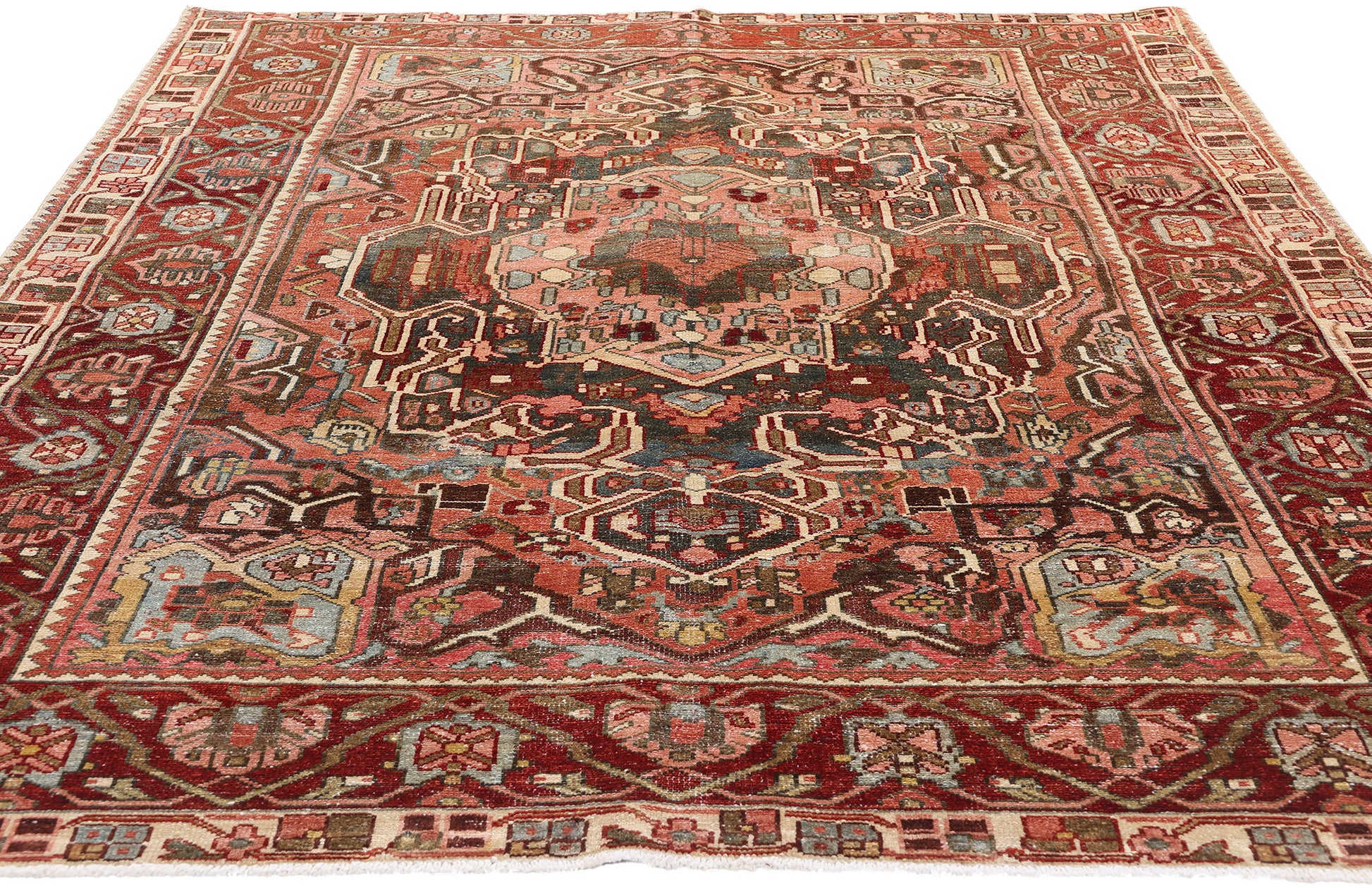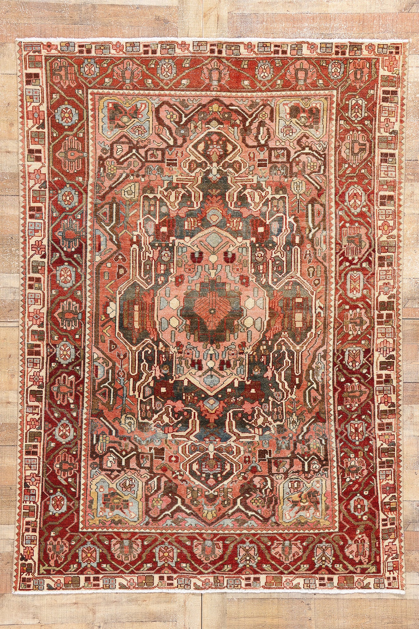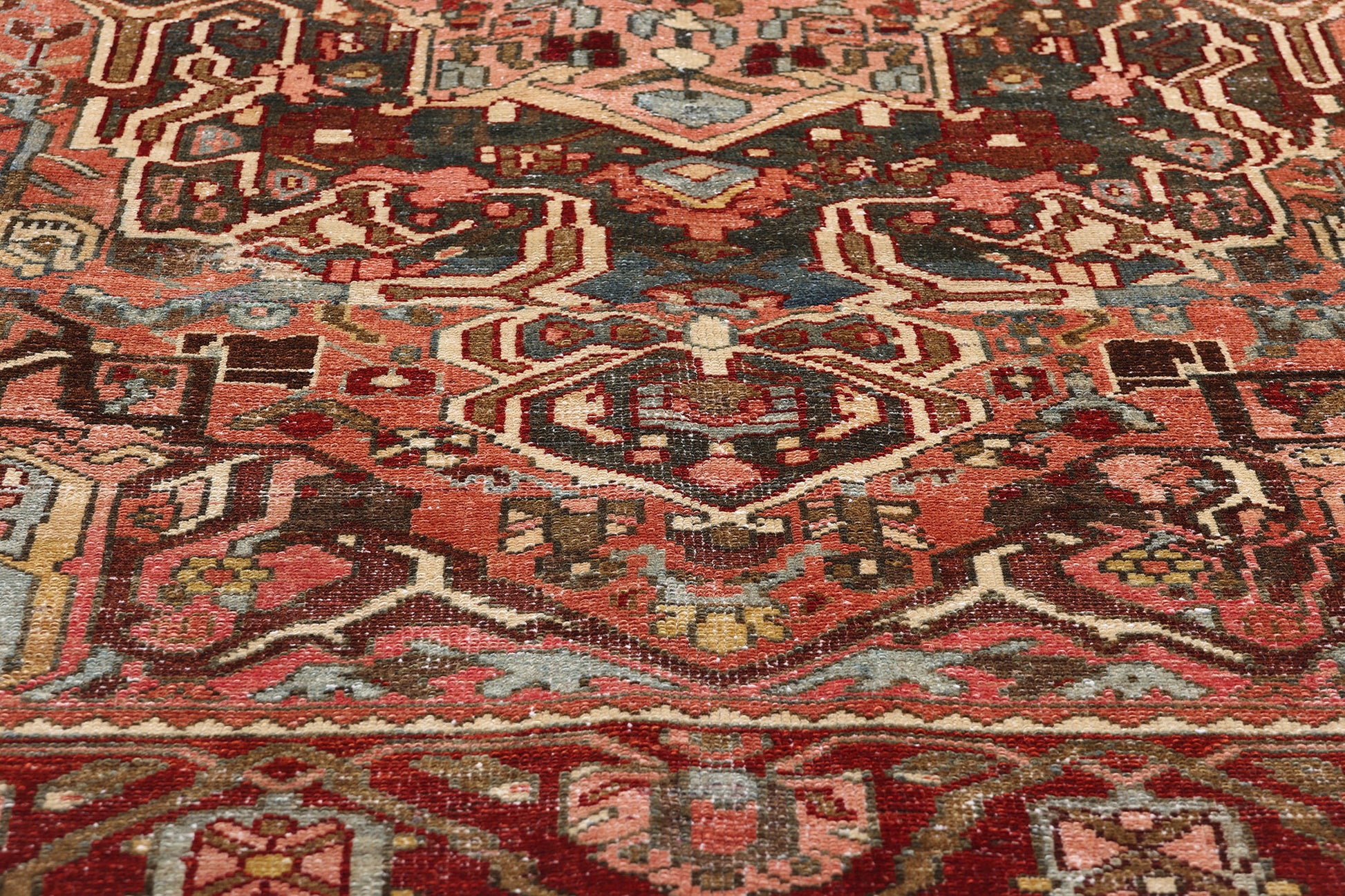 This hand-knotted wool distressed antique Persian Bakhtiari rug radiates relaxed refinement and modern rustic charm, making it a testament to the timeless artistry of the Bakhtiari tribe. Its beautifully aged surface, softened by an antique wash, exudes a sense of rugged beauty that perfectly balances sophistication with approachability. The Bakhtiari rug’s cozy earth-tone color palette of terra cotta, soft red, faded blues, rusty pinks, and beige invites a feeling of warmth and comfort, making it an ideal centerpiece for a space seeking both elegance and history.