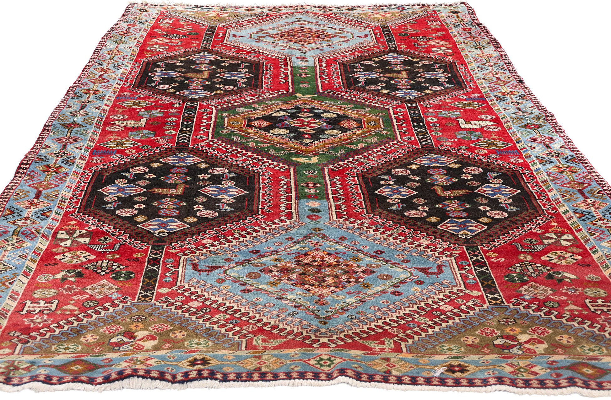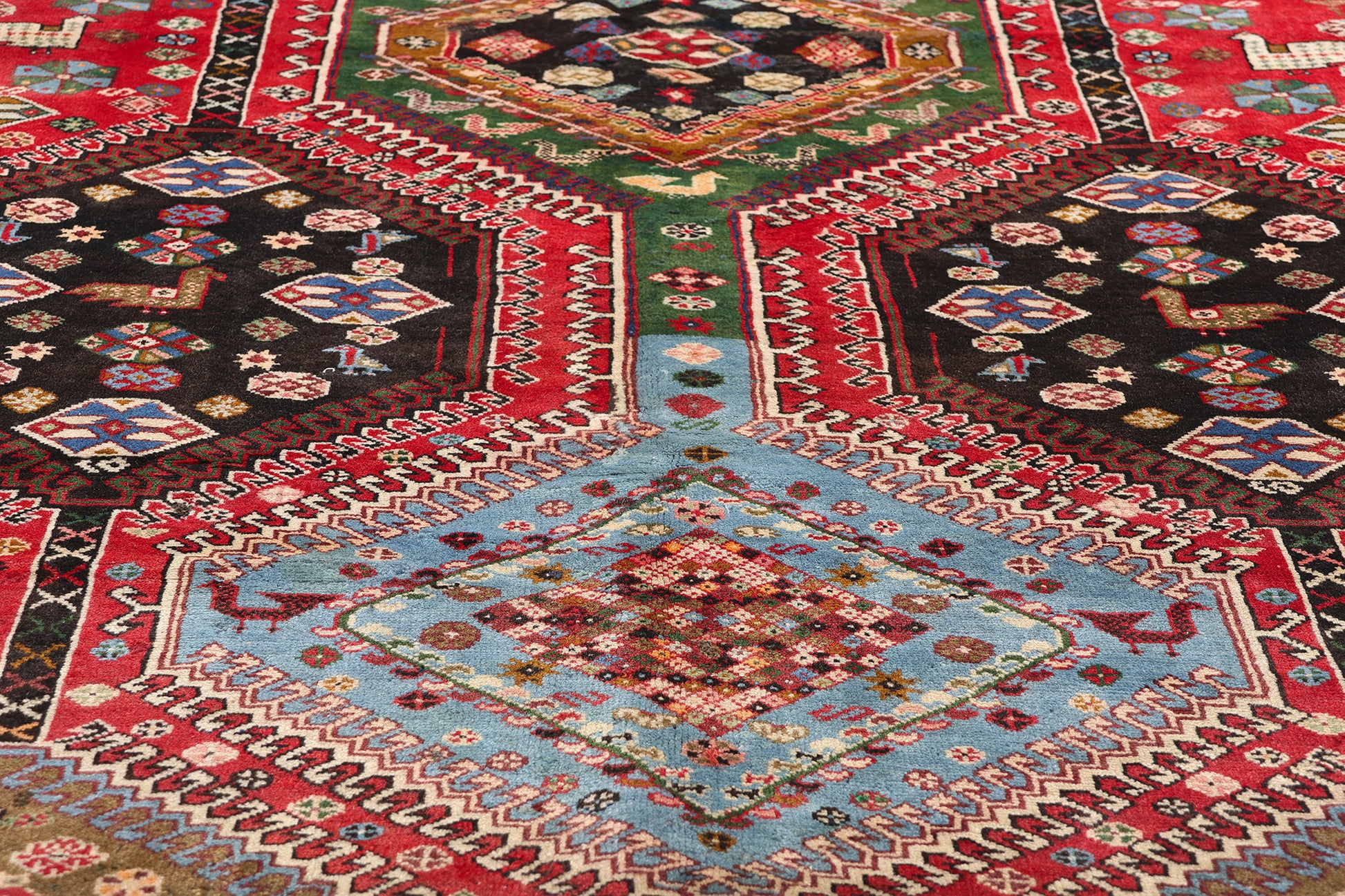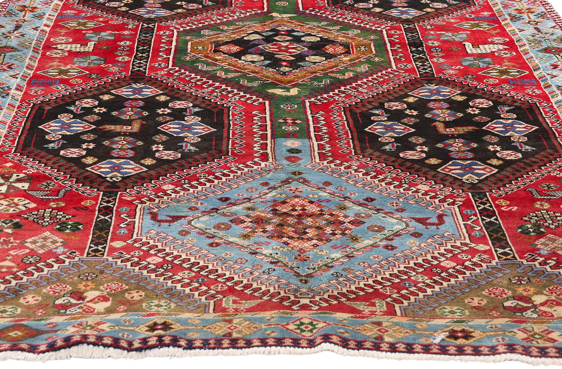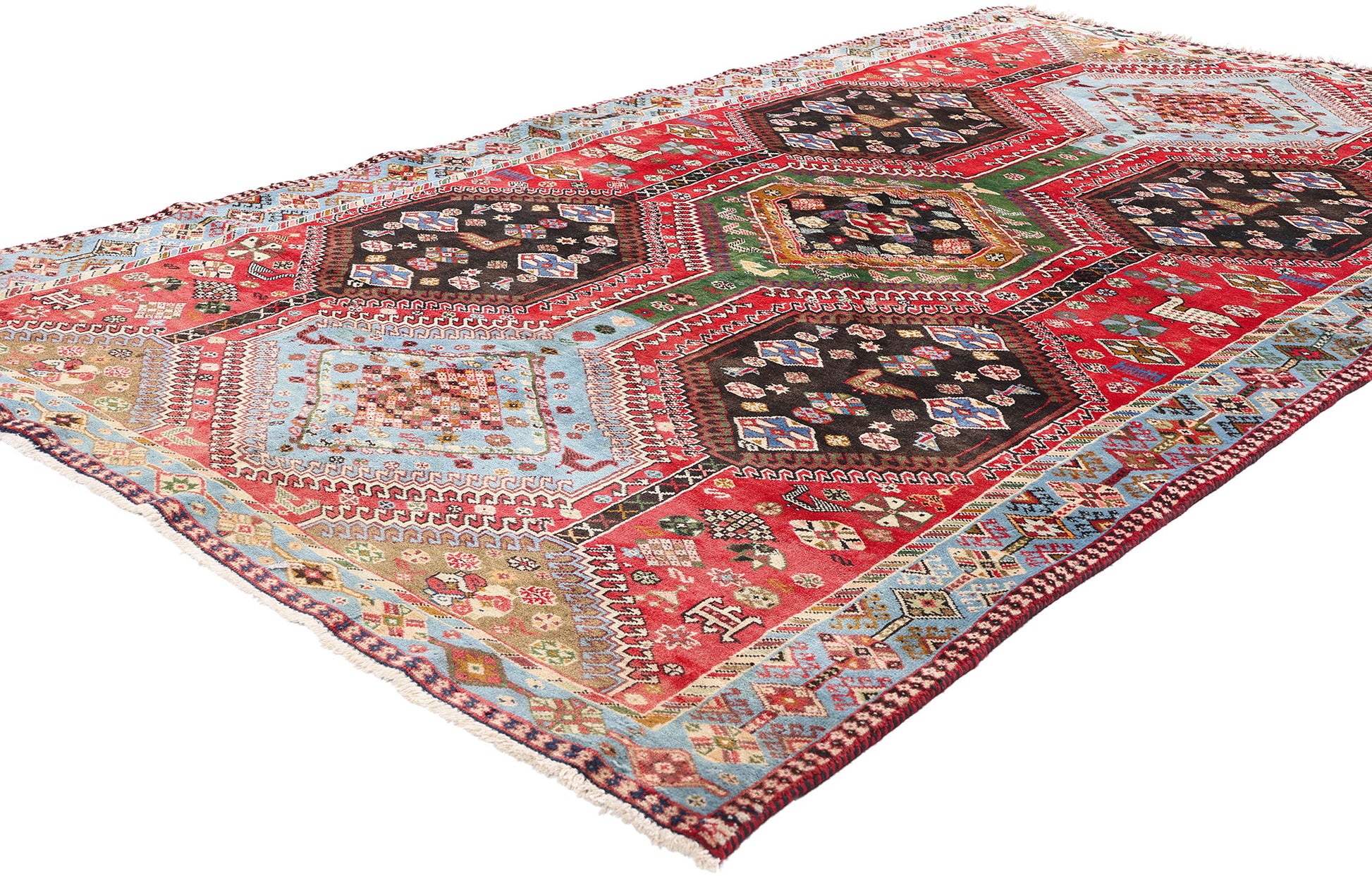 This magnificent hand-knotted wool Persian Yalameh rug is a testament to the artistic and symbolic richness of southwestern Iran’s nomadic weaving traditions. Woven with exceptional craftsmanship, this vintage masterpiece showcases an elaborate field of hooked pole medallions in an array of vivid colors, including vibrant red, serene sky blue, grounding midnight, and lush green. Each medallion is meticulously detailed with smaller geometric and floral motifs, embodying the tribal artistry of the Qashqai and Lori weavers. This intricate design conveys a harmonious balance of symmetry and creativity, evoking a sense of both structure and spontaneity.