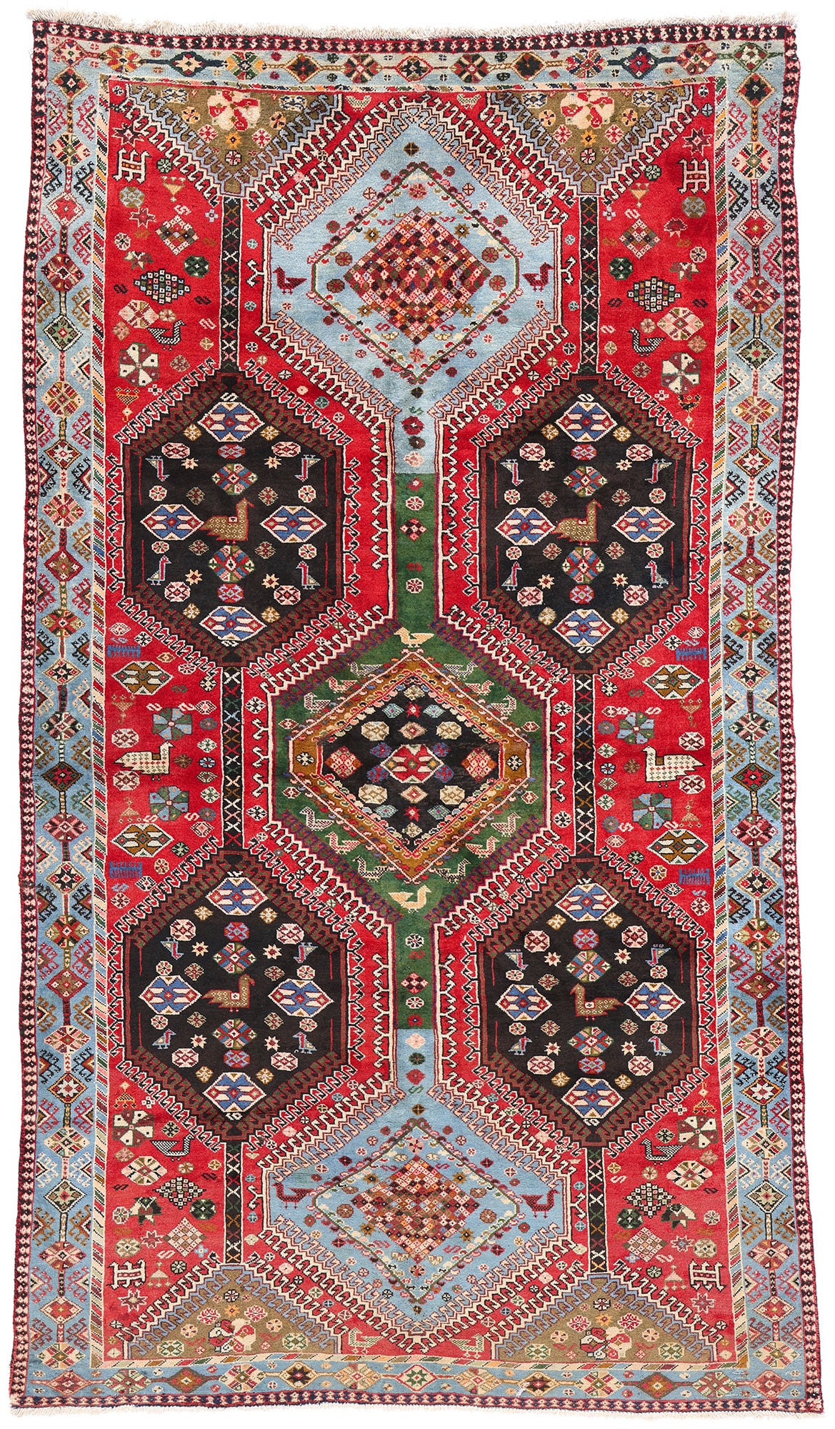 Infused with cultural symbolism, the Persian tribal rug features a fascinating array of motifs that tell a story of protection, fertility, and spiritual harmony. Animal figures such as chickens and roosters are woven into the design to ward off the evil eye, while birds and peacocks symbolize faith, fertility, and immortality. The field is enriched with protective elements, including Goz eyes, amulets, scorpion motifs, s-hooks, and x-shapes, all of which serve to shield against malevolent forces. The inclusion of hair band and comb motifs further ties the Yalameh rug to traditional wedding ceremonies, symbolizing marriage, fertility, and protection for new beginnings.