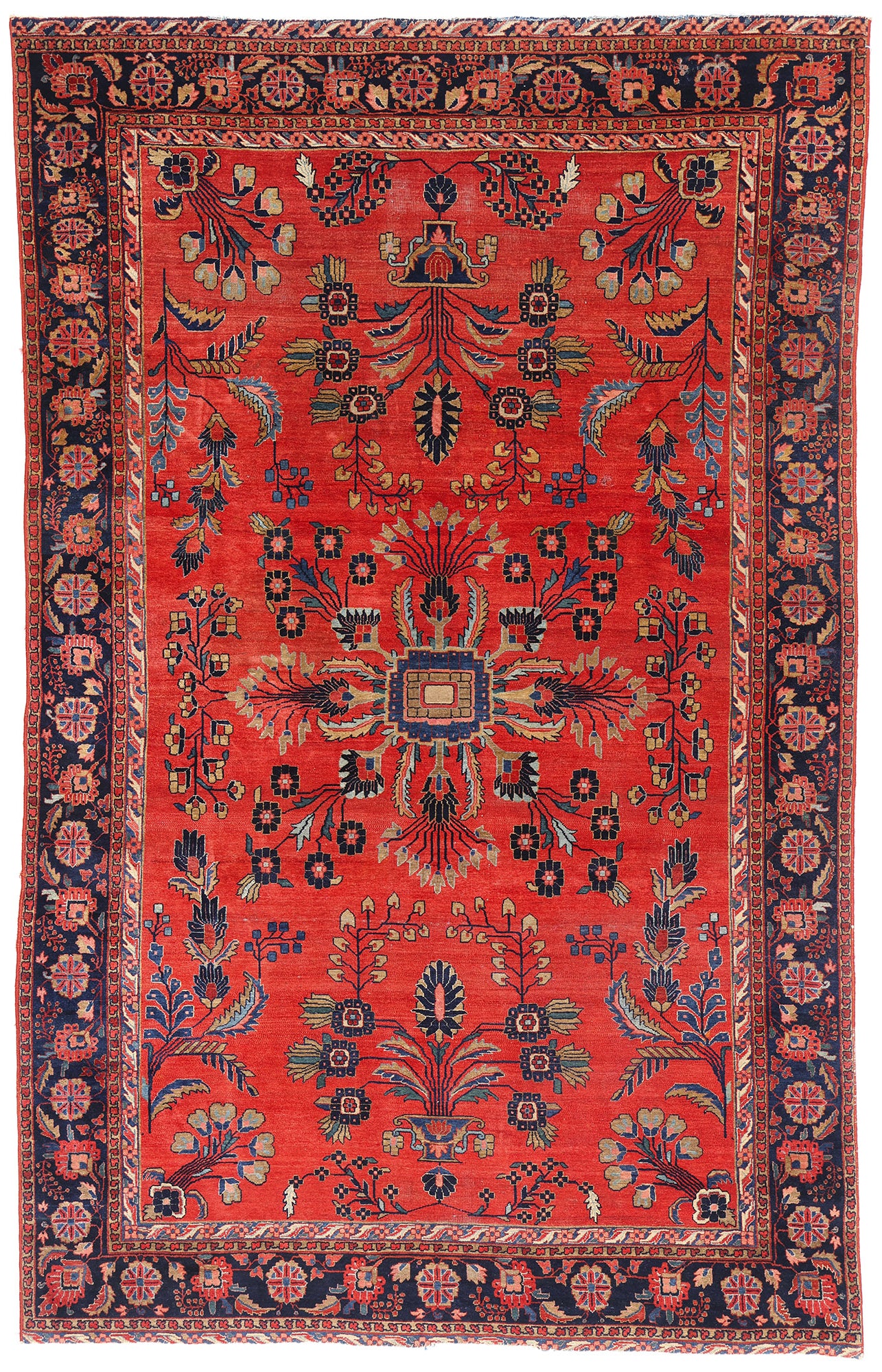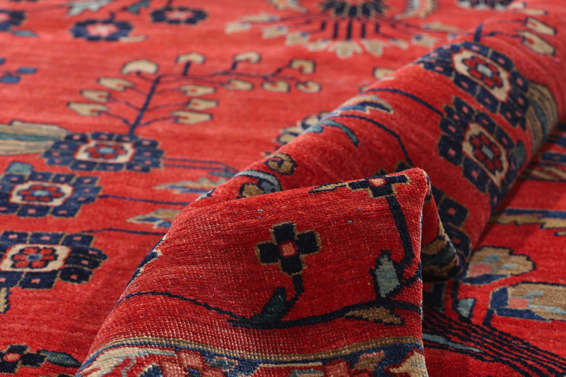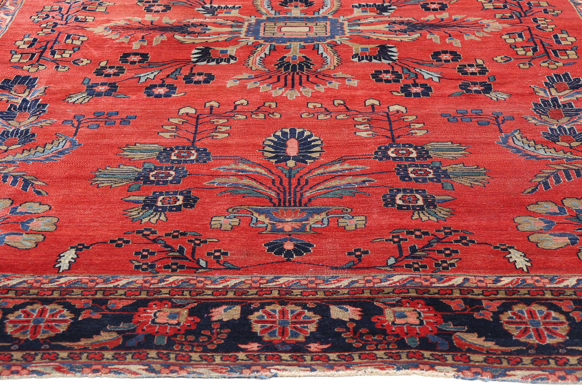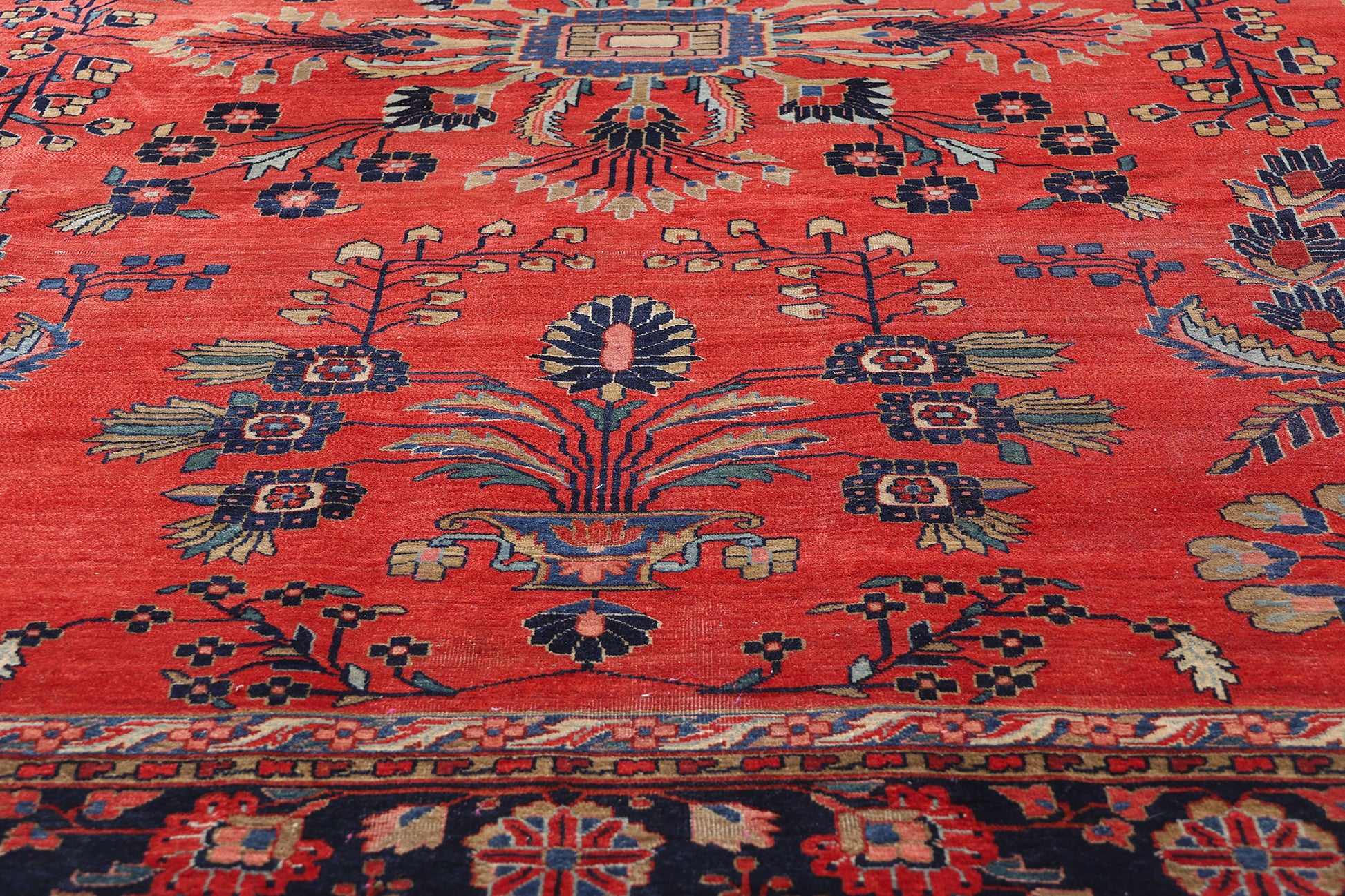 Radiating with the fervent warmth of a garden caught in perpetual bloom, this hand-knotted wool antique Persian Mohajeran Sarouk rug unveils a jubilant composition where symmetry and splendor dance in harmony. Its blazing red field ignites the senses, acting as both canvas and flame for a series of stylized botanical motifs that pulse with rhythm and vitality. At the heart of the Sarouk rug lies a radiant cross medallion crowned by plumes of feathery fronds, issuing forth like a sacred flame from a temple brazier, anchoring the composition in geometric grace.