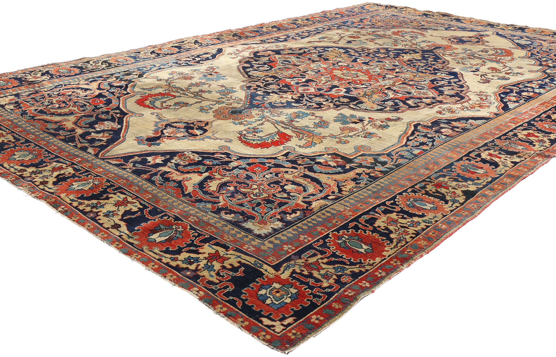 A resplendent expression of Late 19th Century Persian artistry, this antique Persian Mohtasham Kashan rug unfolds like an illuminated manuscript upon the floor—each knot a letter in a lyrical ode to refinement and tradition. Hand-knotted in lustrous Manchester wool by the celebrated master Mohtasham’s workshop, the composition radiates from a richly ornamented central medallion, blooming outward with intricate arabesques, symmetries, and sacred geometry. Enshrined within an ivory field, the medallion pulses in rich tones of ruby red, indigo blue, and celadon green, forming a visual nucleus of rhythmic elegance.