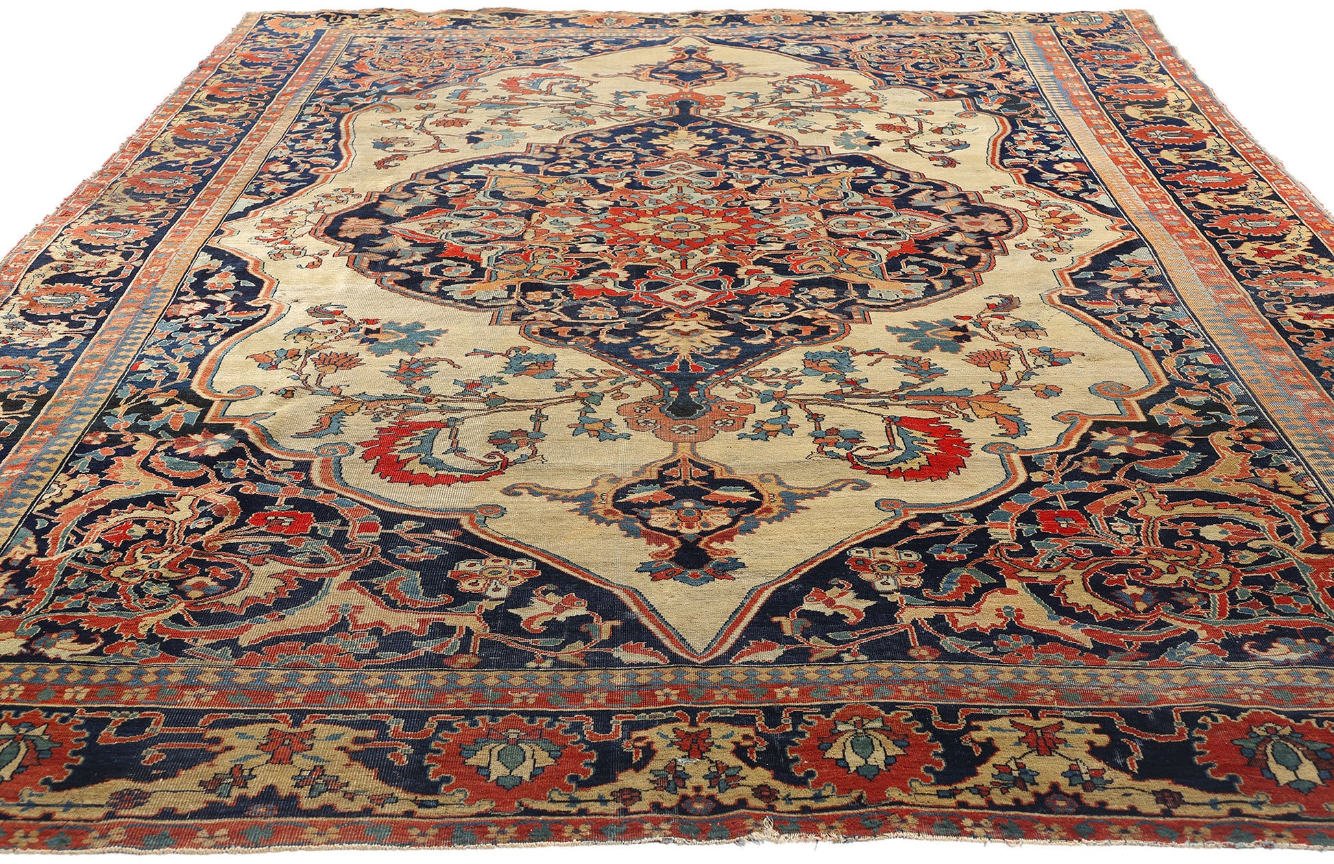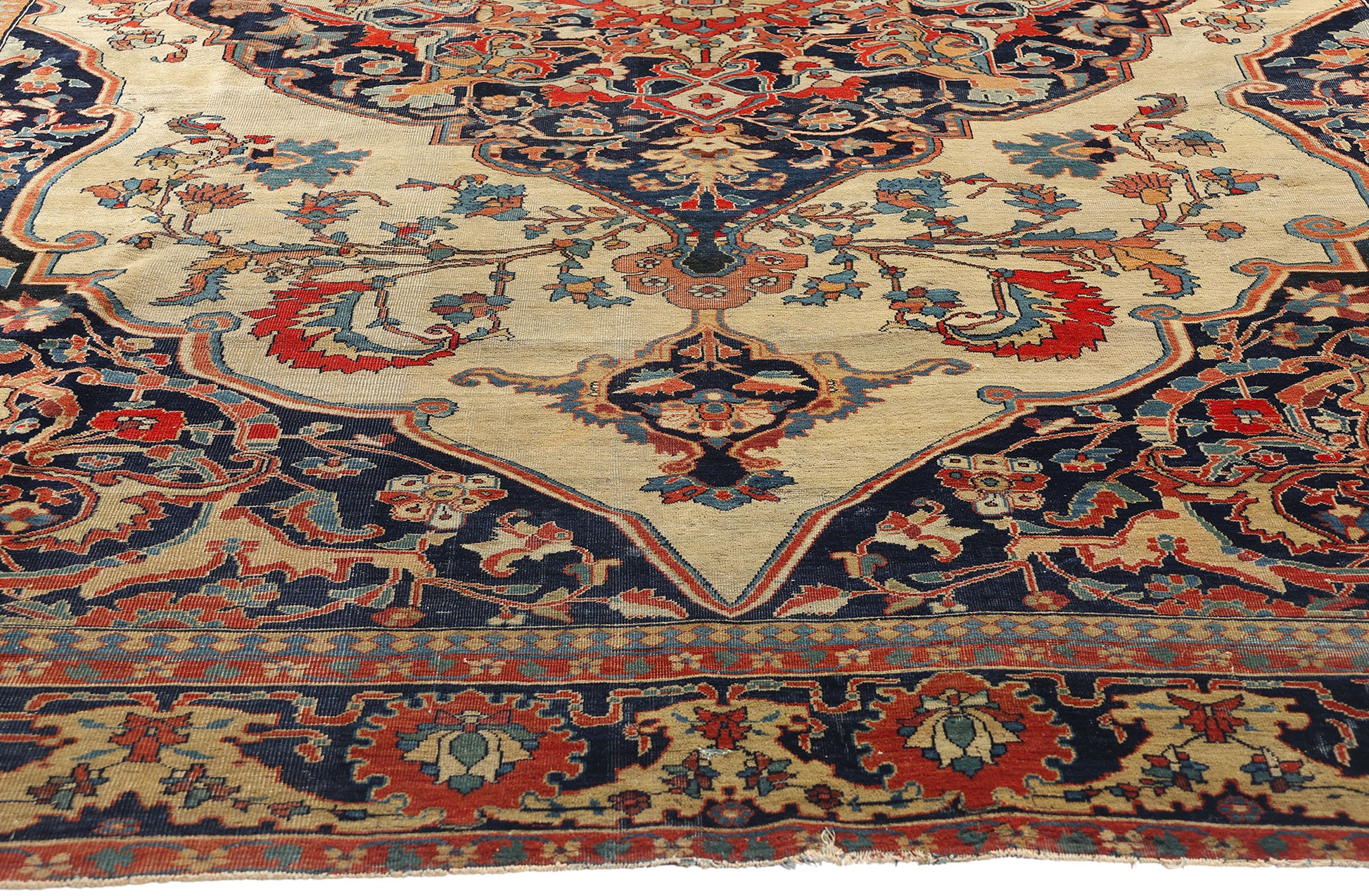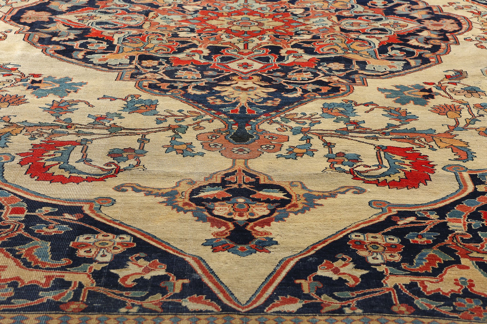 Framing the composition is a regal border adorned with a procession of palmettes, rosettes, and cartouches, each linked by scrolling vinework. These elements provide both visual containment and rhythmic harmony, guiding the eye along a steady course like the verses of a ghazal. The corner spandrels mirror the intricacy of the central design, their dramatic angular extensions filled with mythic cloudbands and phoenix-like flourishes—perhaps an allusion to the rug’s rebirth through every generation that beholds it.